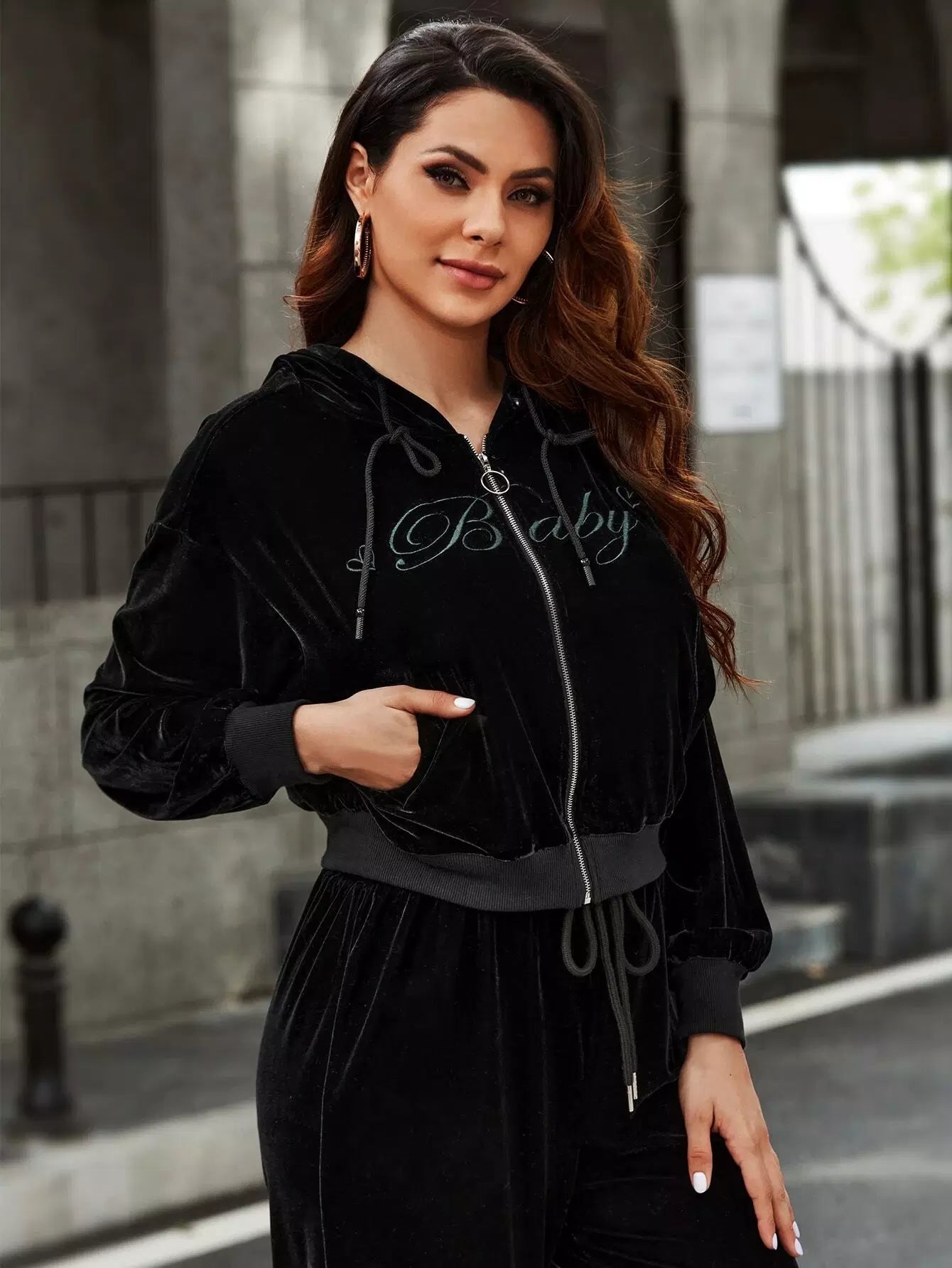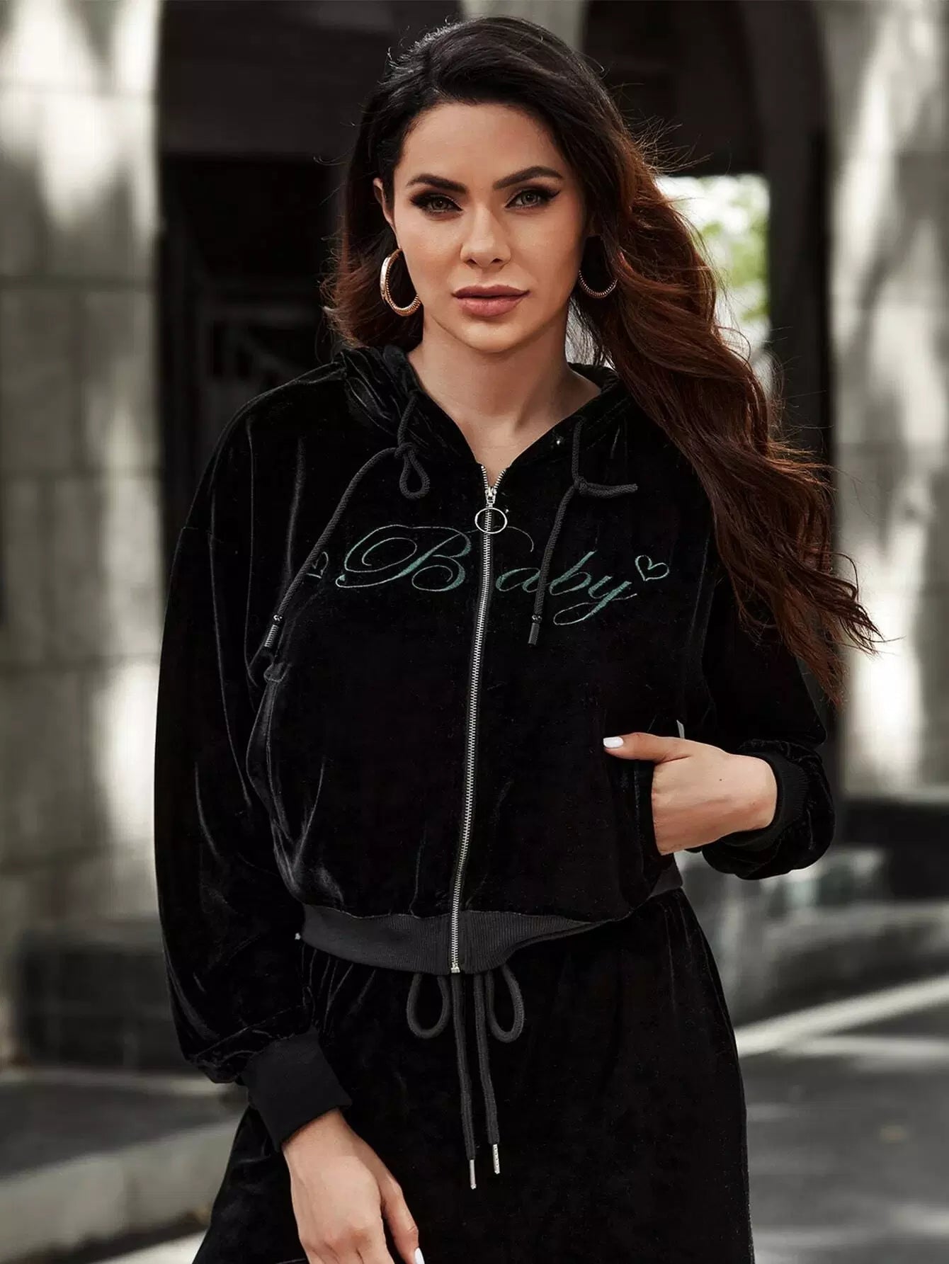 Heart & Letter Embroidery Zip Front Drawstring Hooded Velvet Jacket