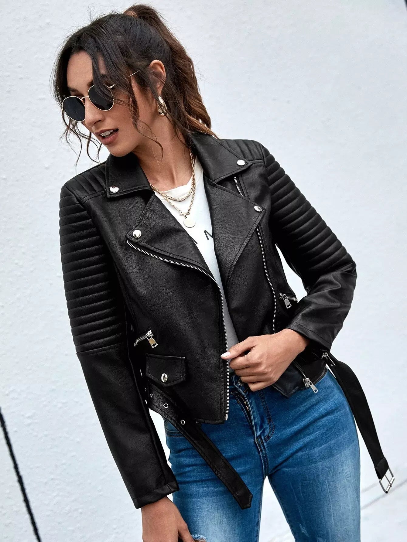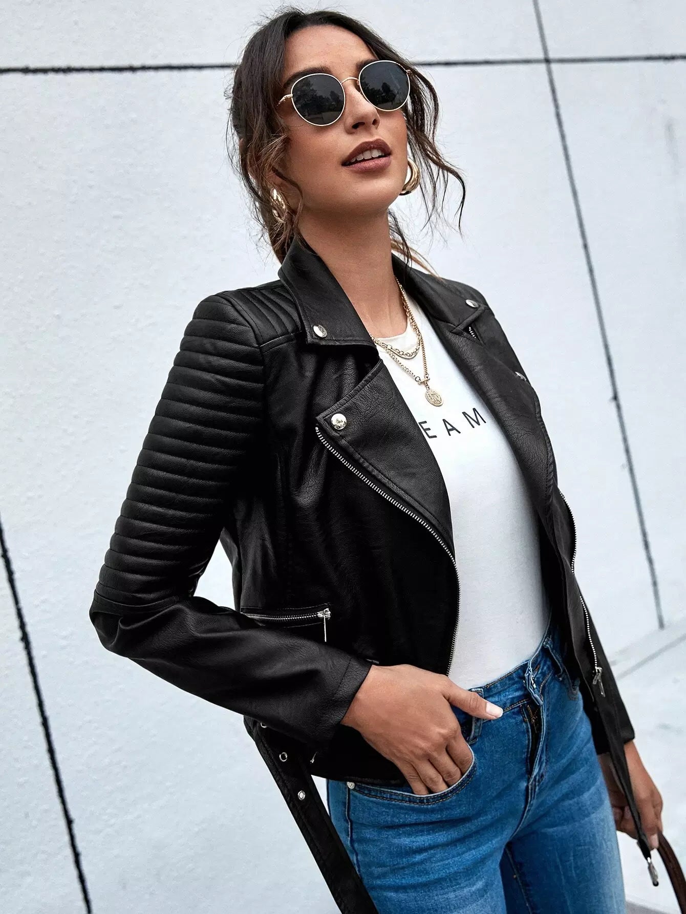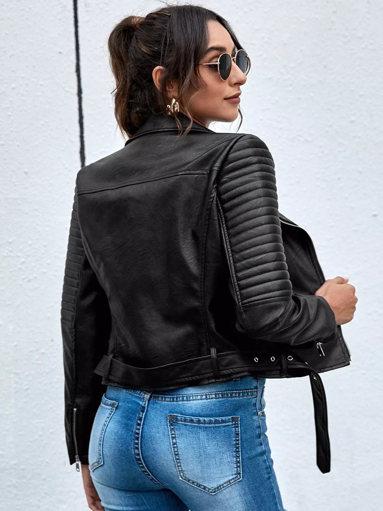 Lapel Collar Zip Up PU Moto Jacket Without Belt