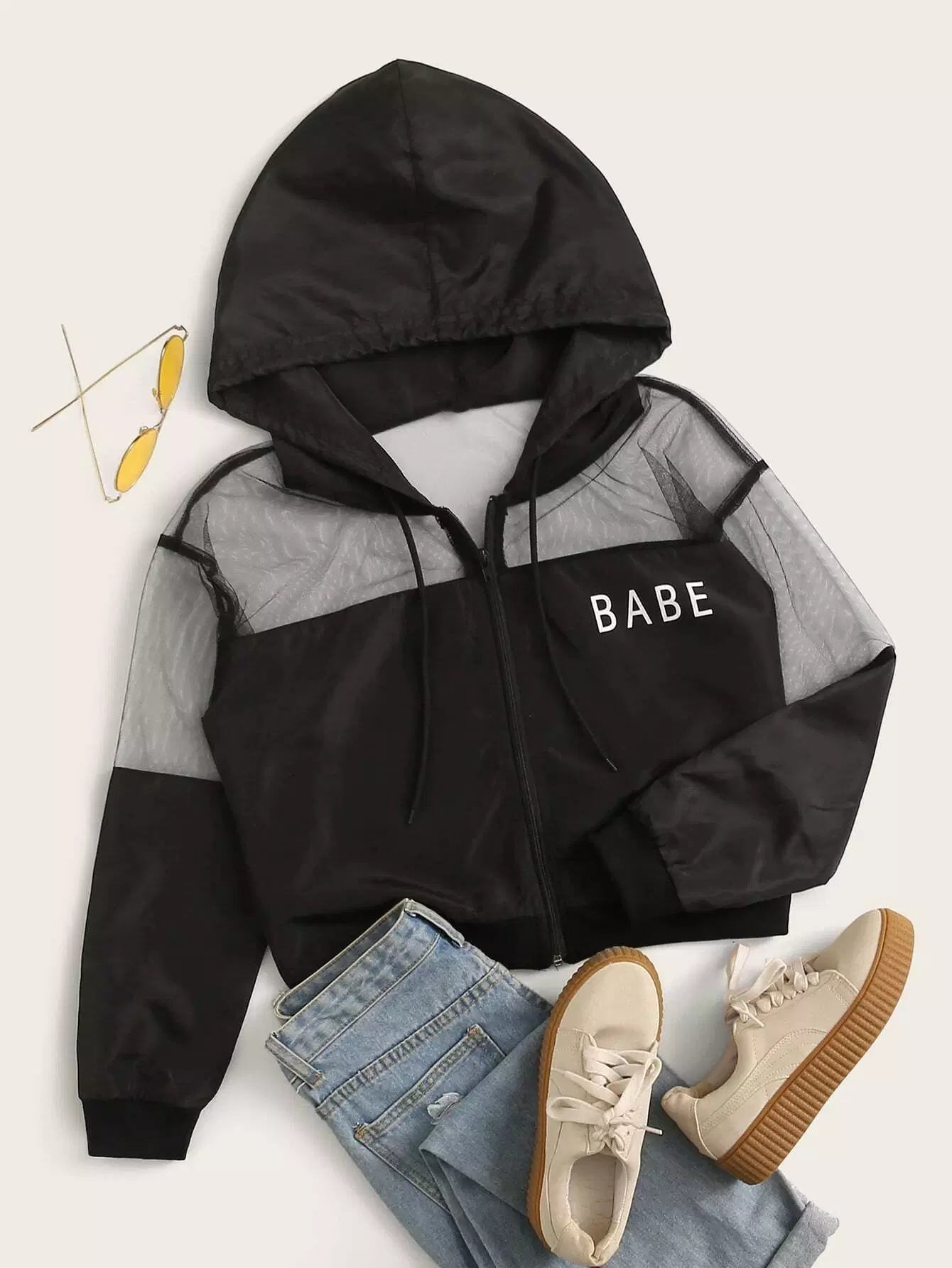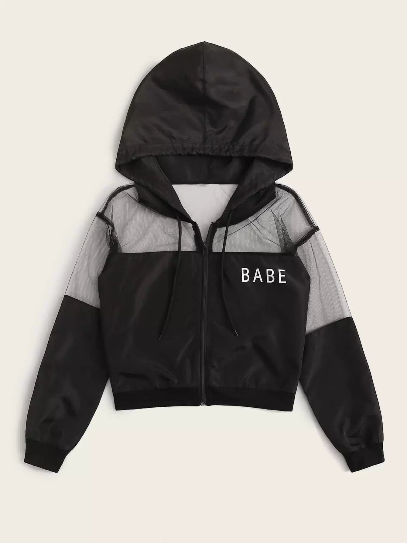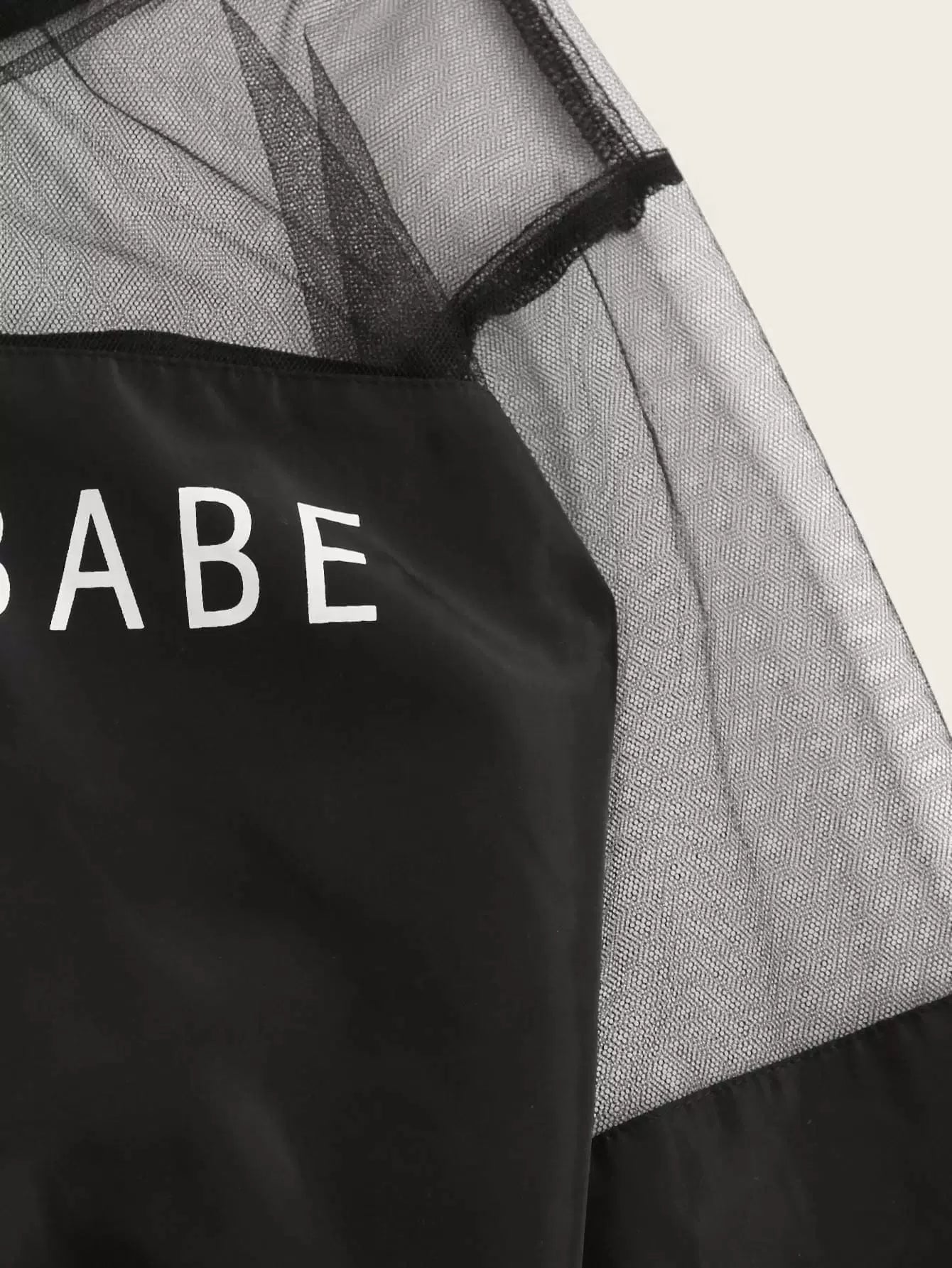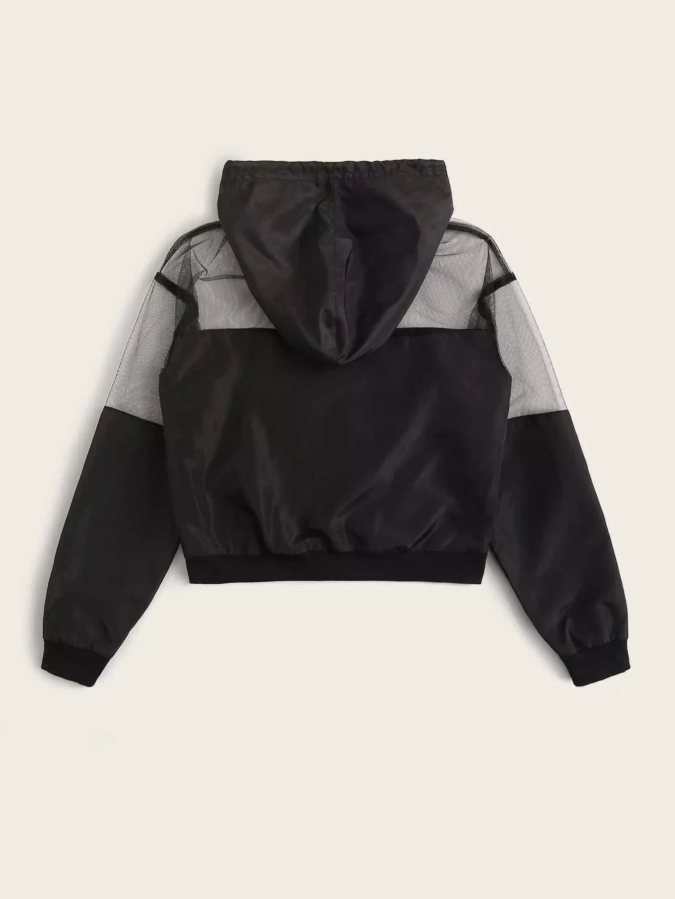 Letter Graphic Mesh Yoke Crop Windbreaker Jacket