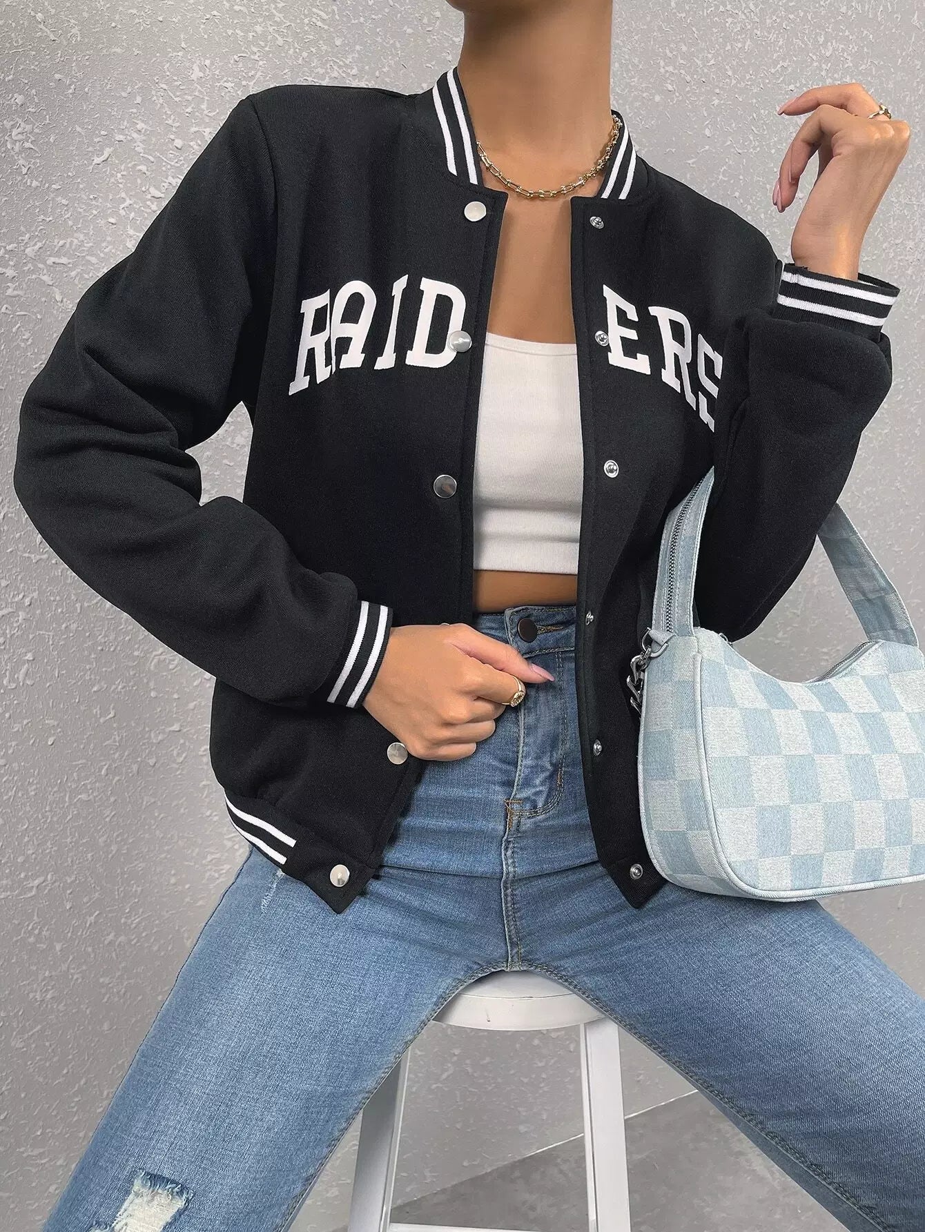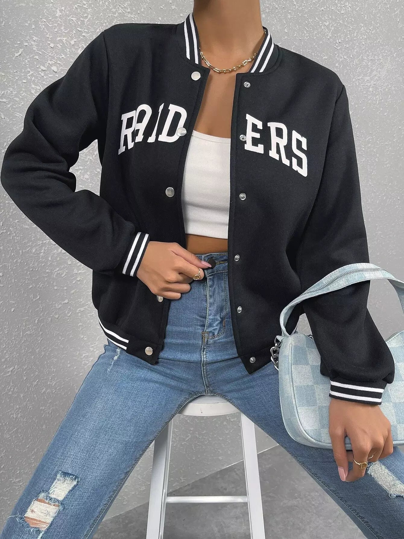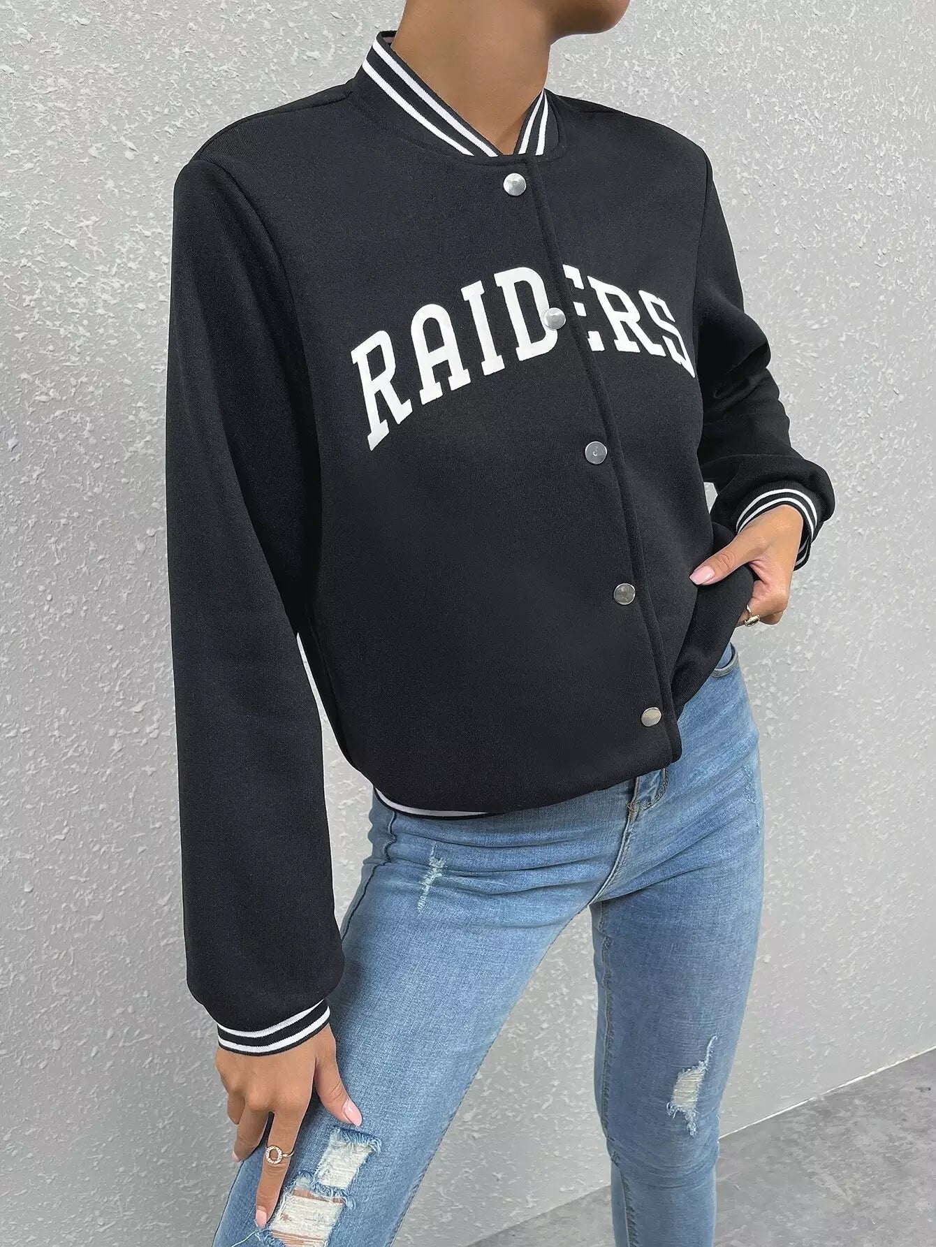 Letter Graphic Striped Trim Varsity Jacket