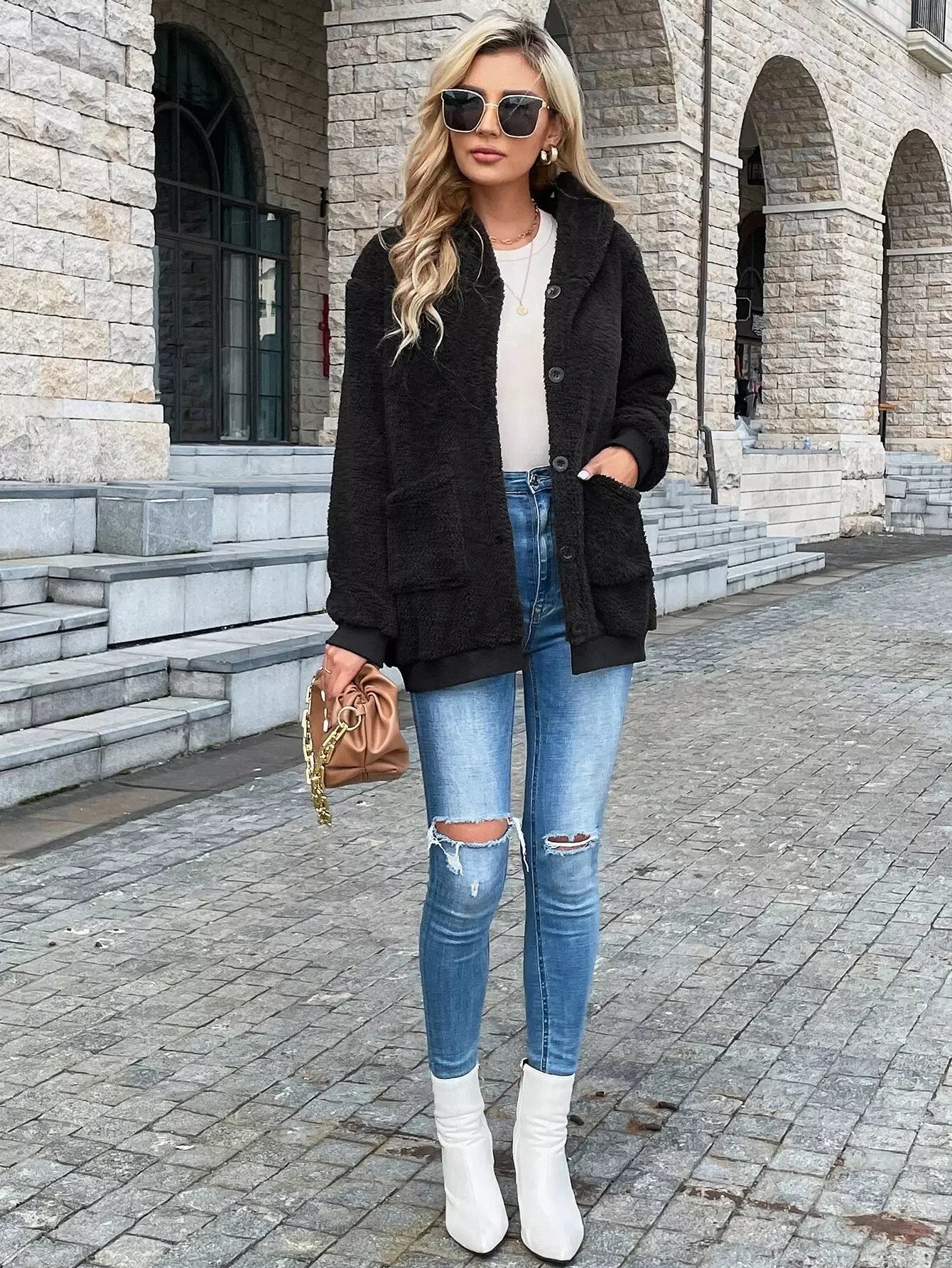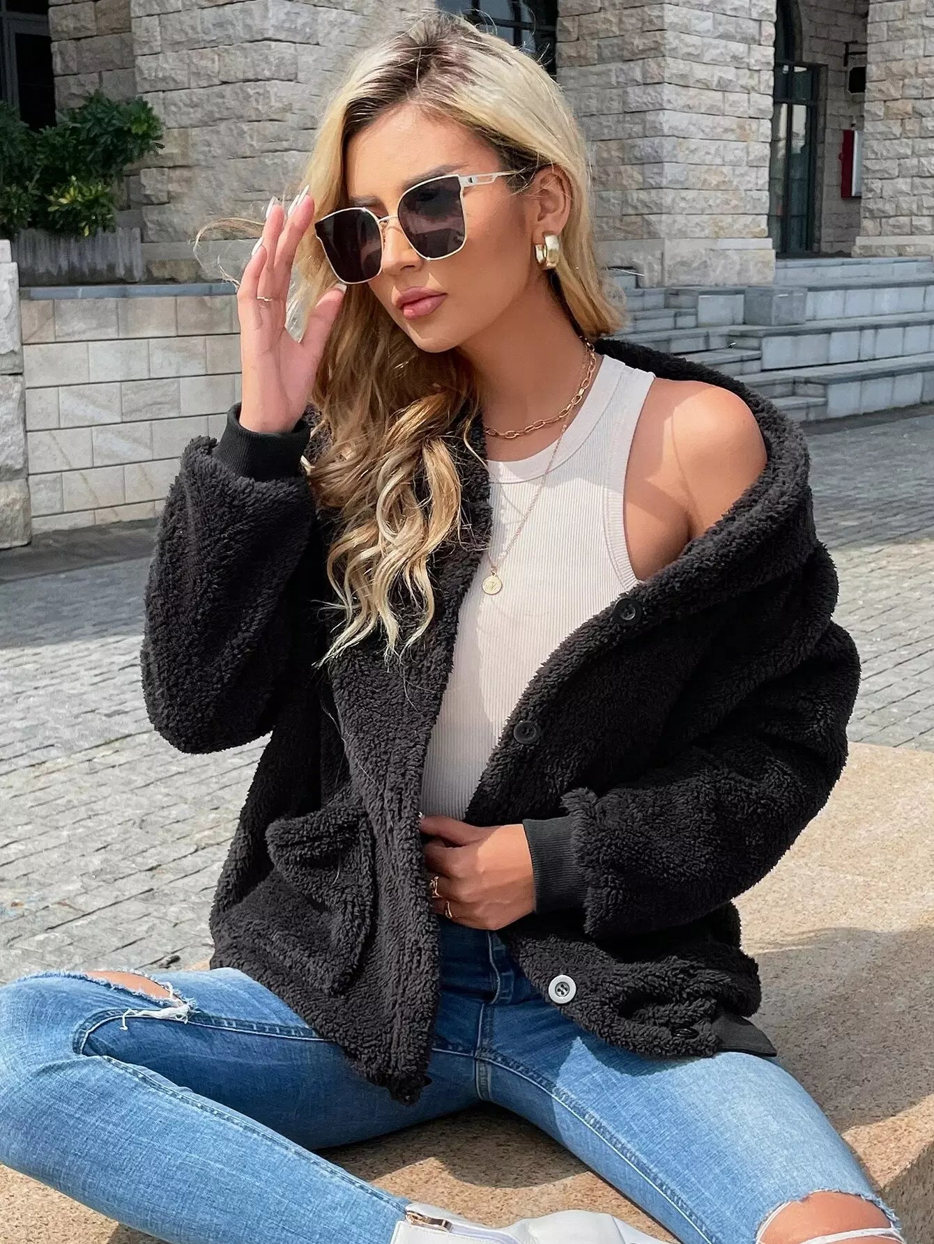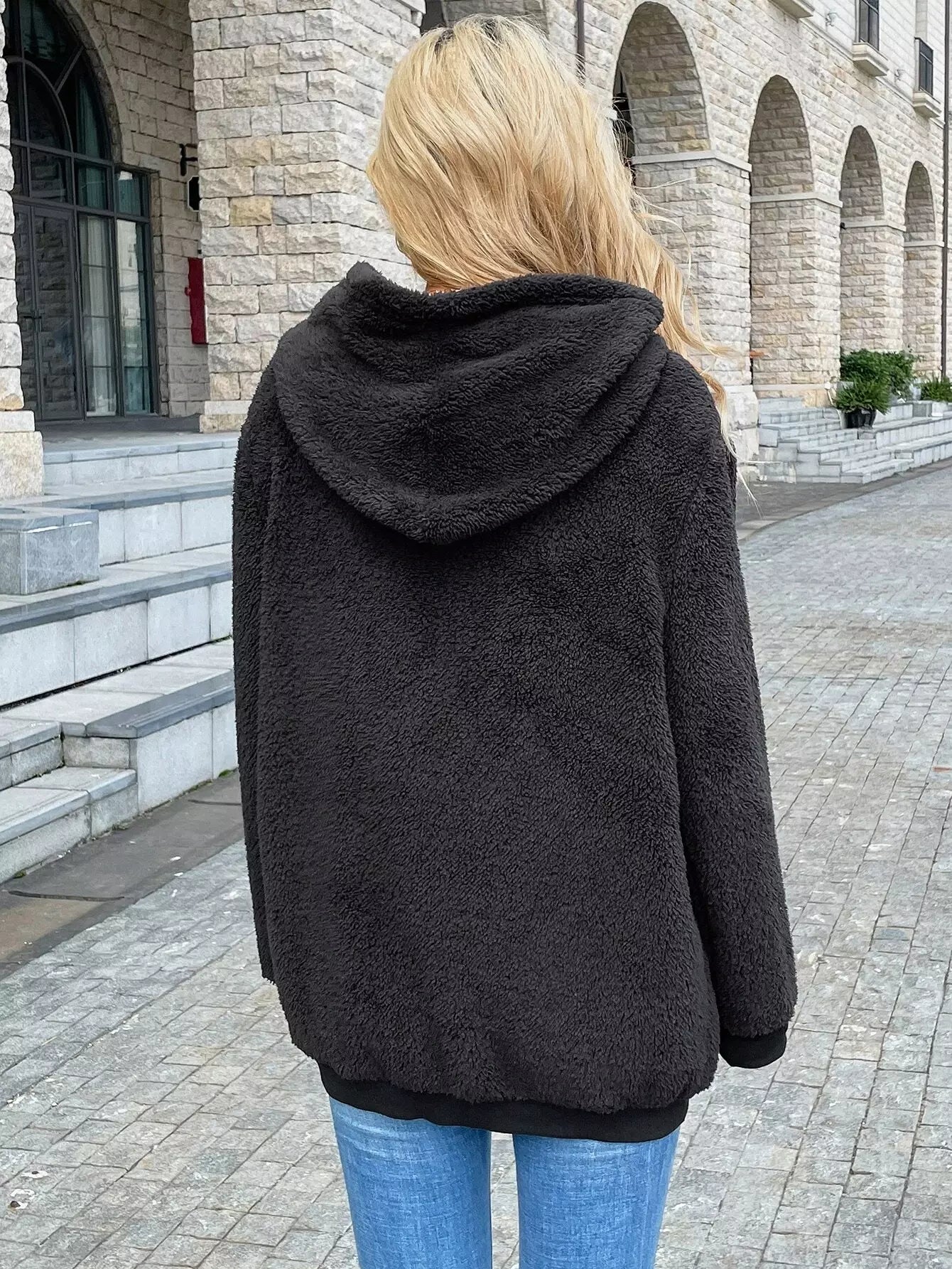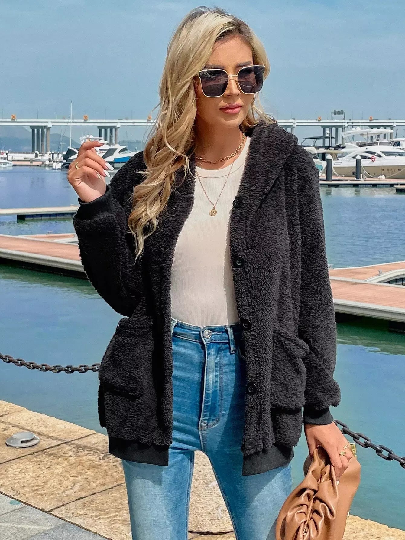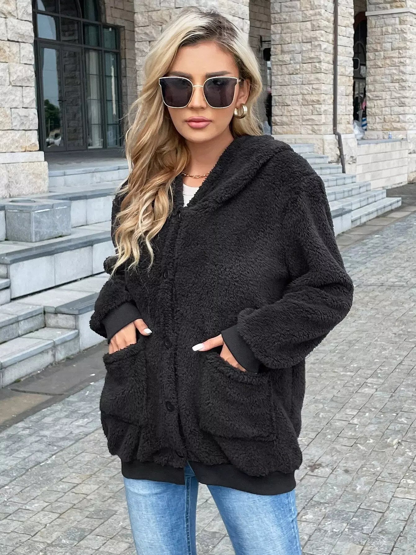 Solid Button Front Dual Pocket Teddy Jacket