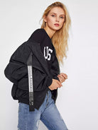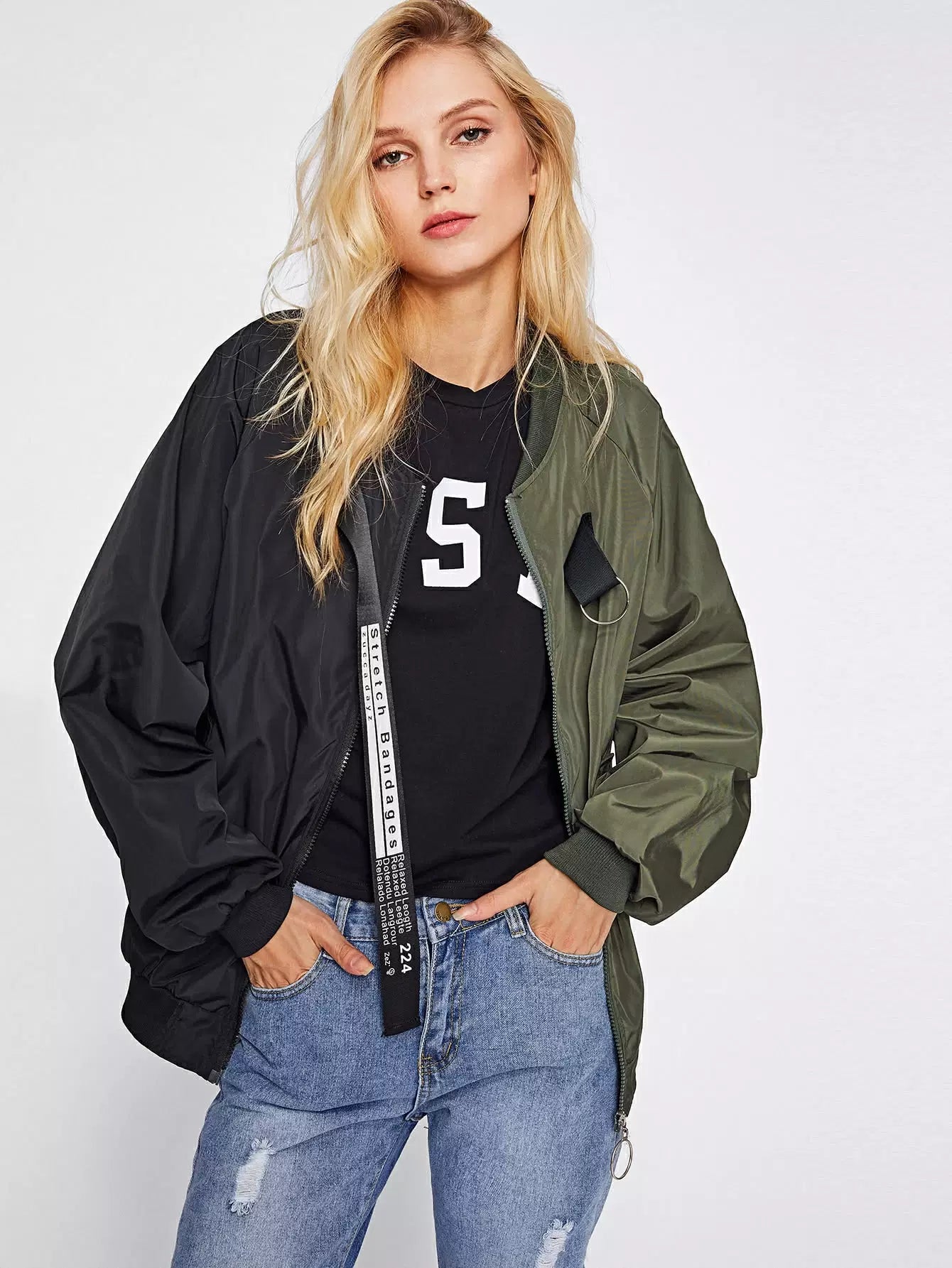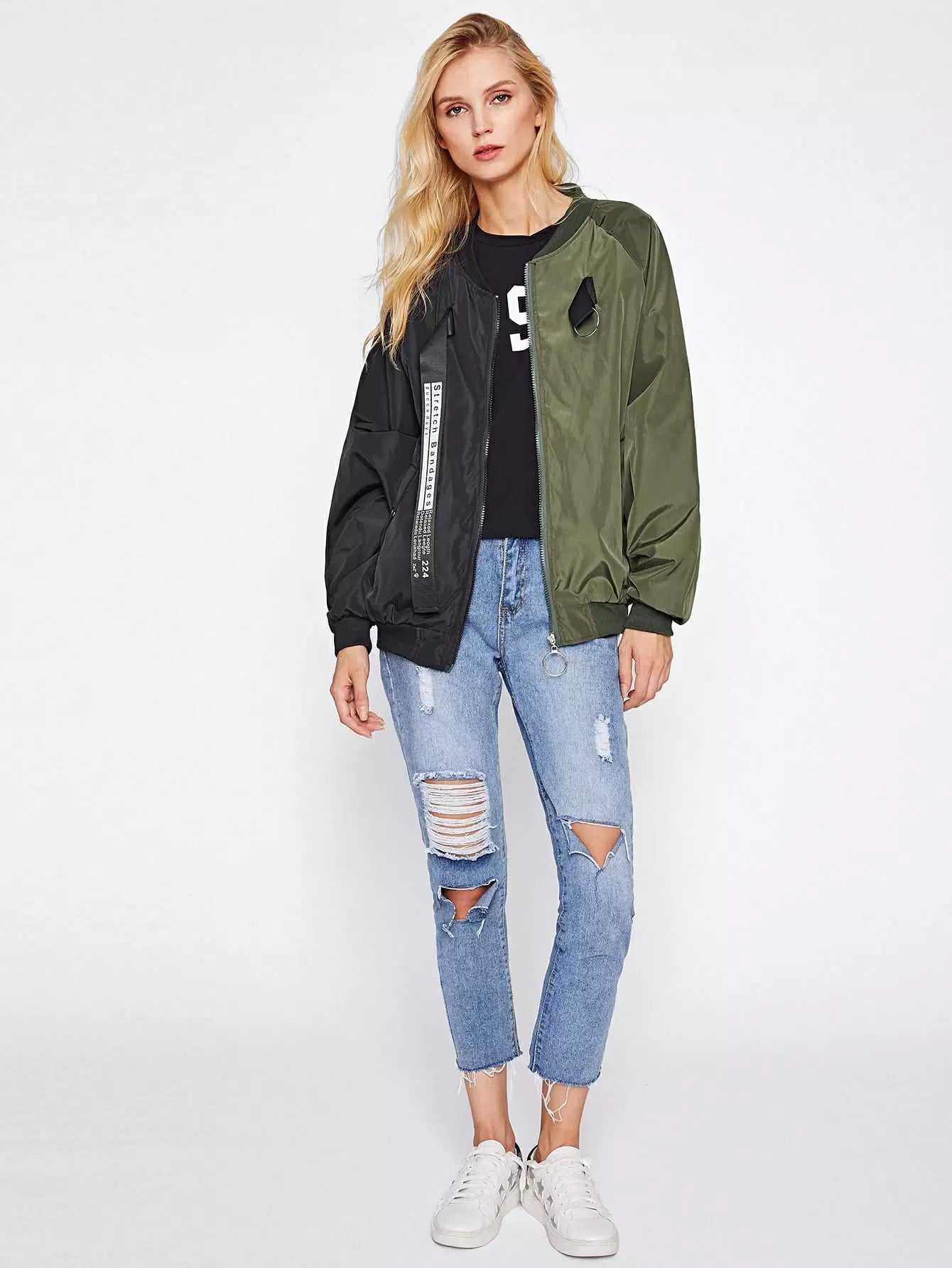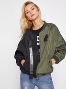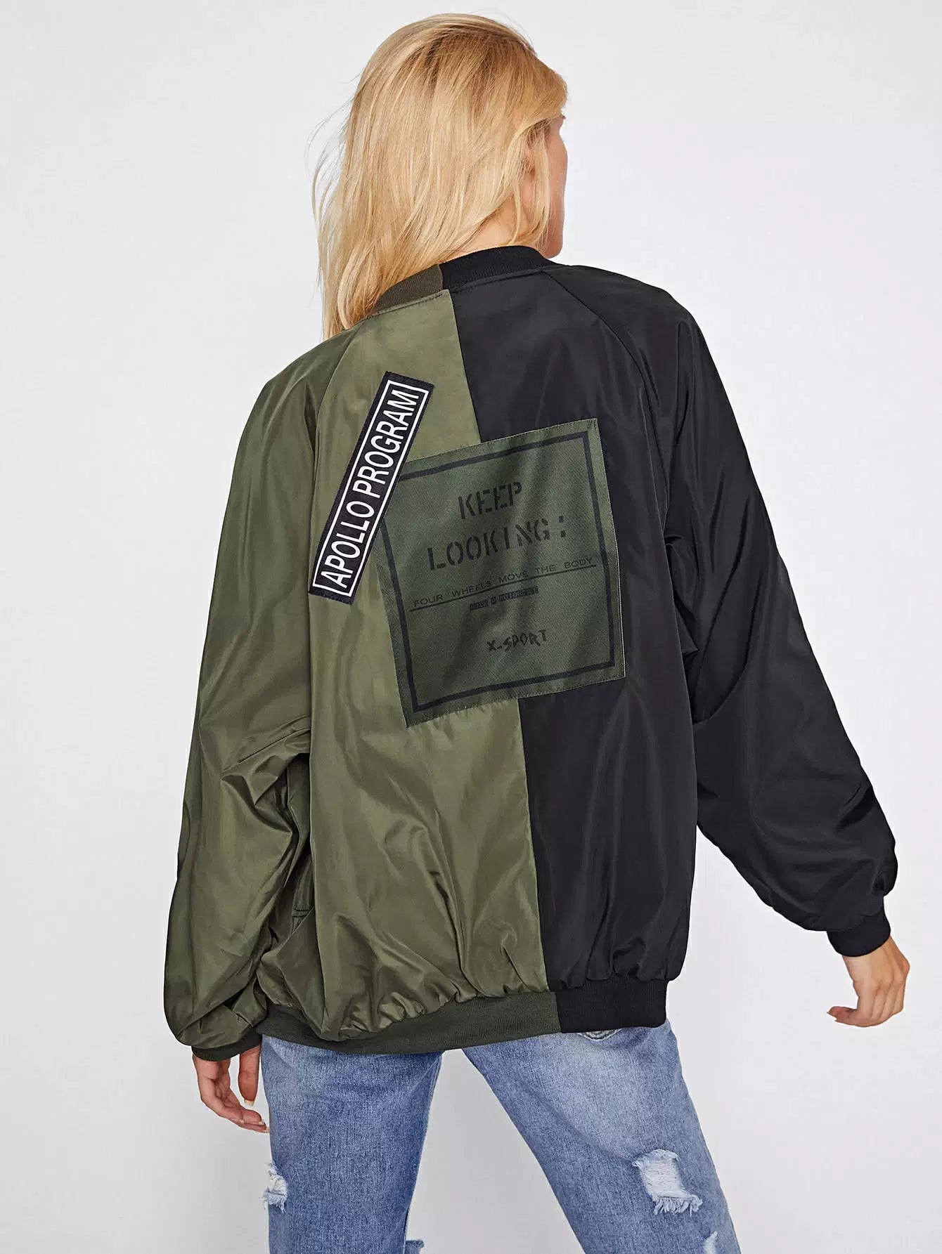 Two Tone Patch Back Letter Ribbon Detail Bomber Jacket