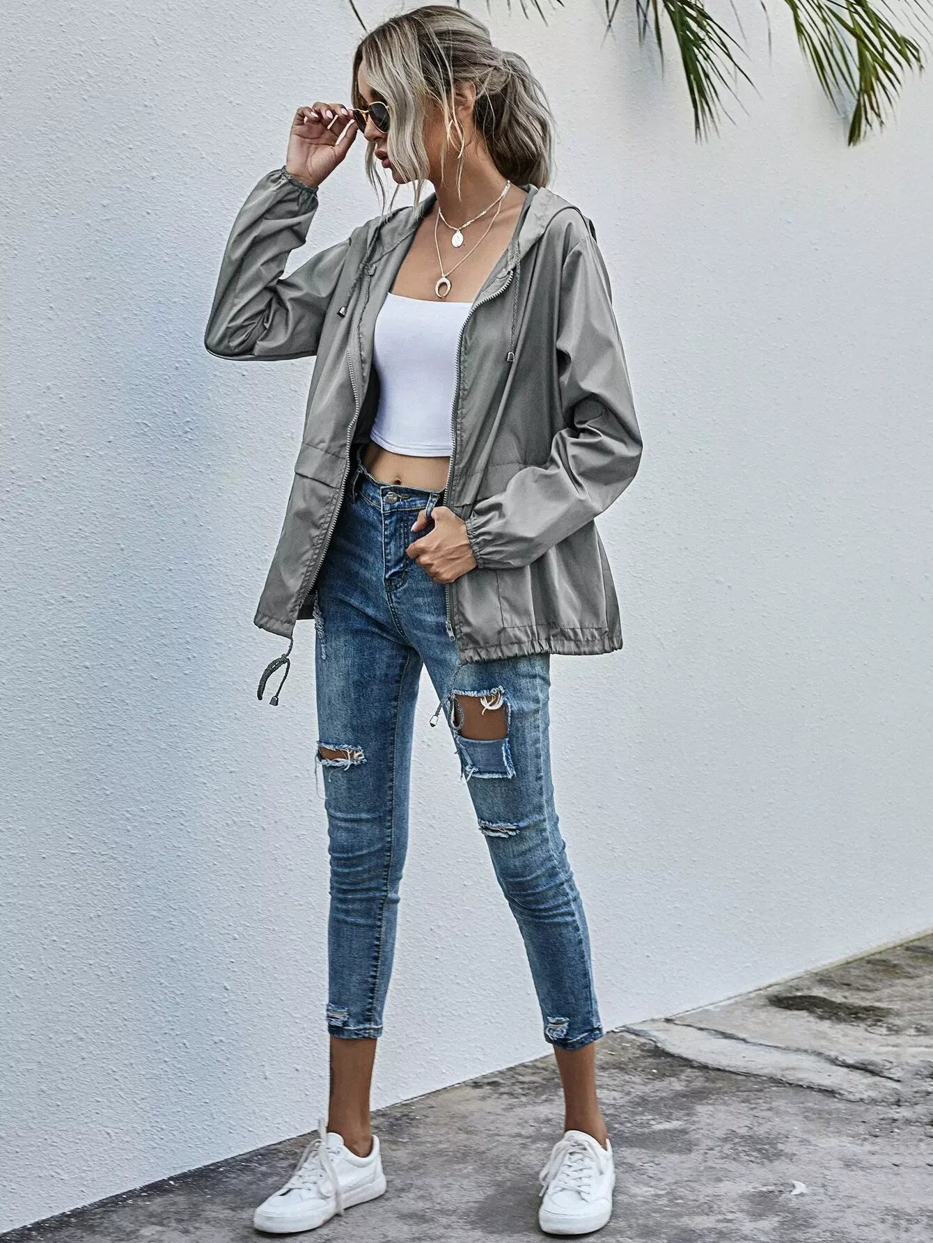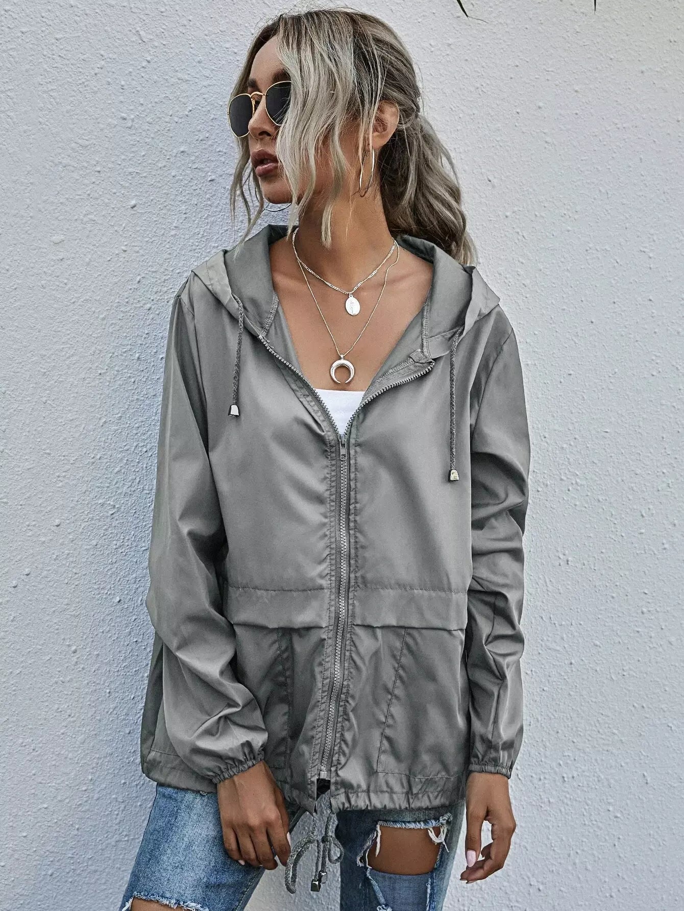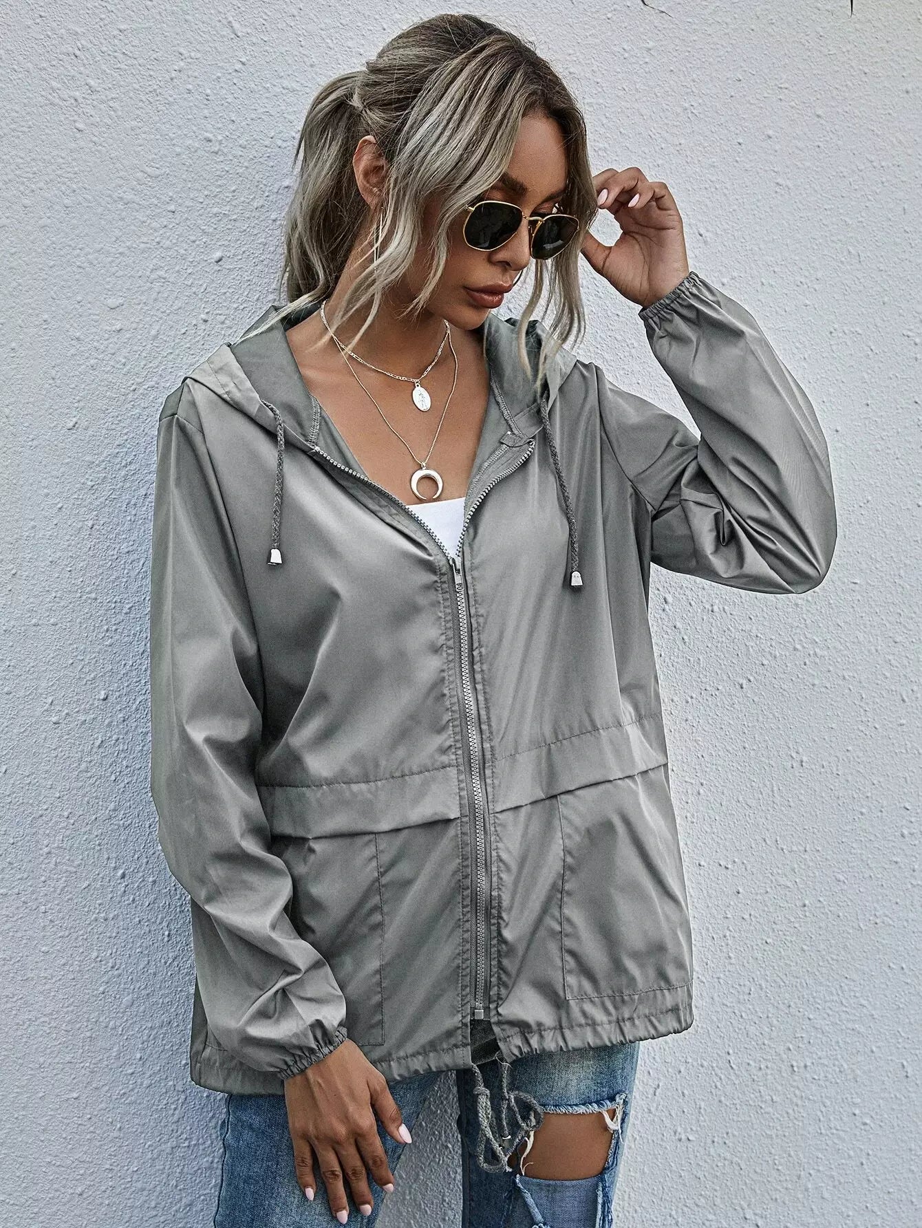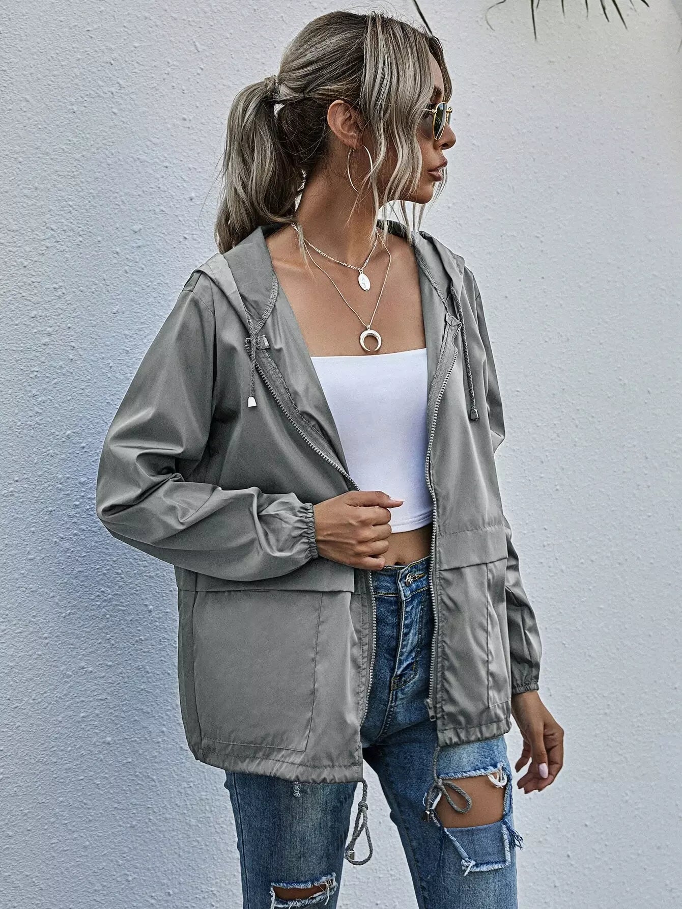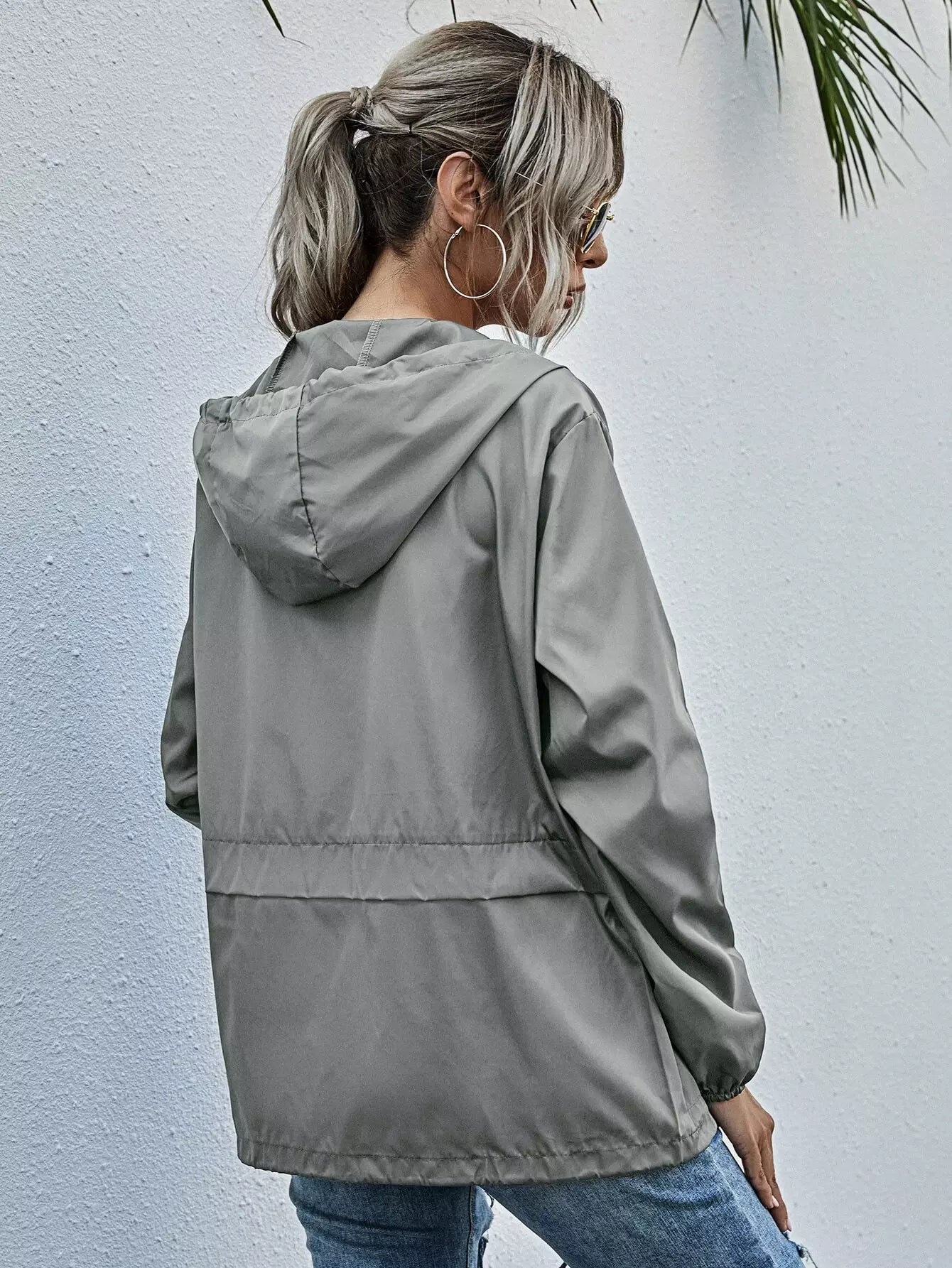 Zip-Up Drawstring Hooded Windbreaker Jacket