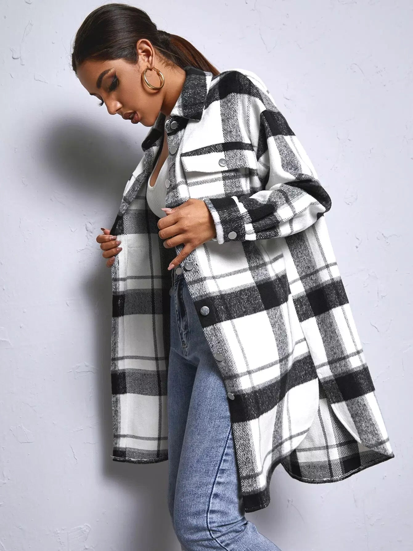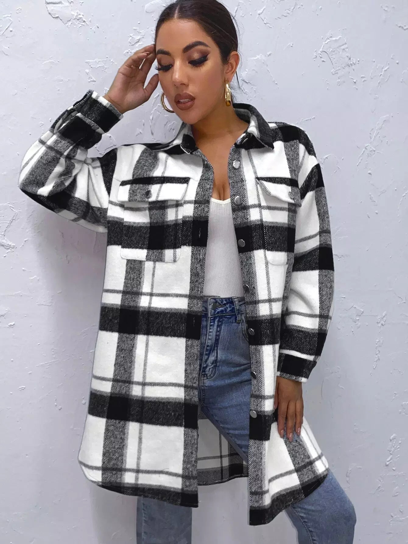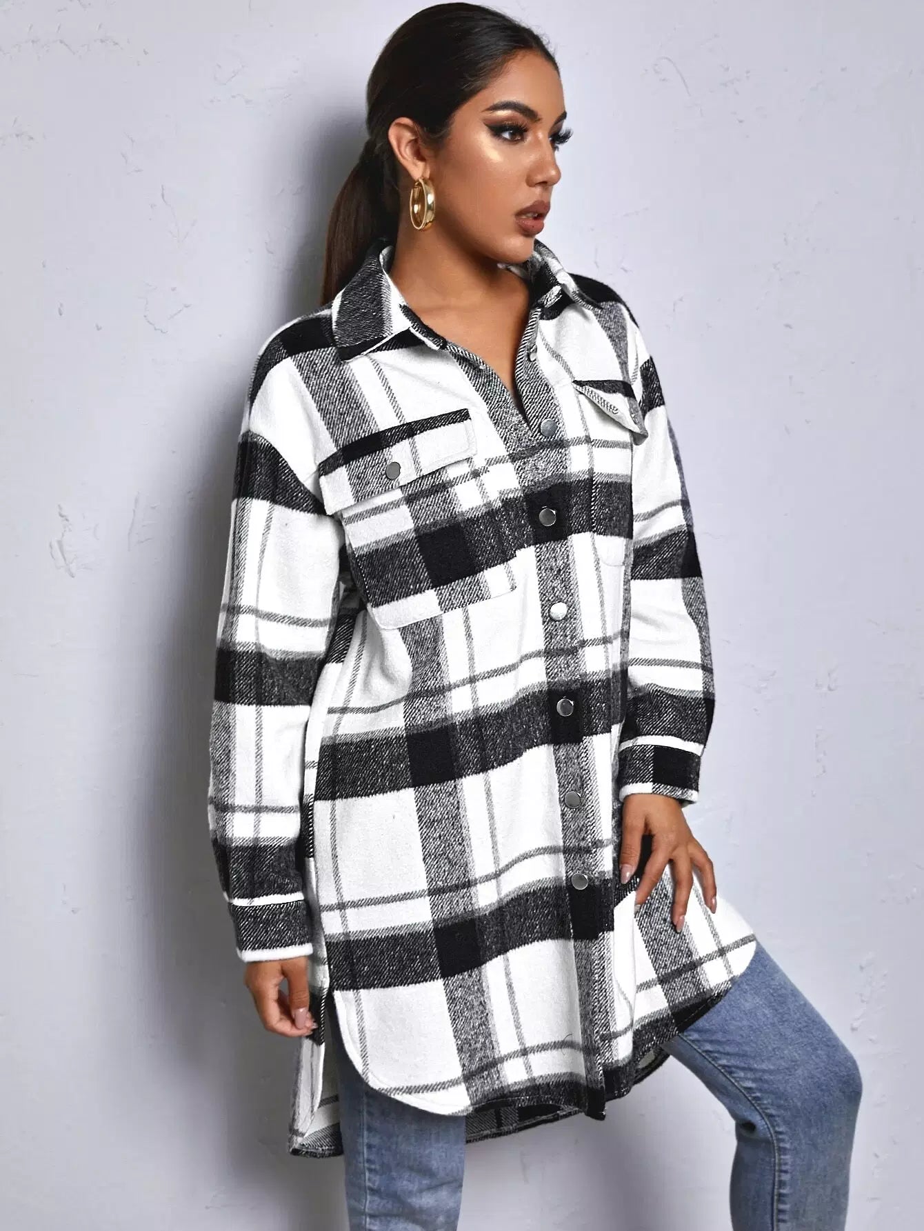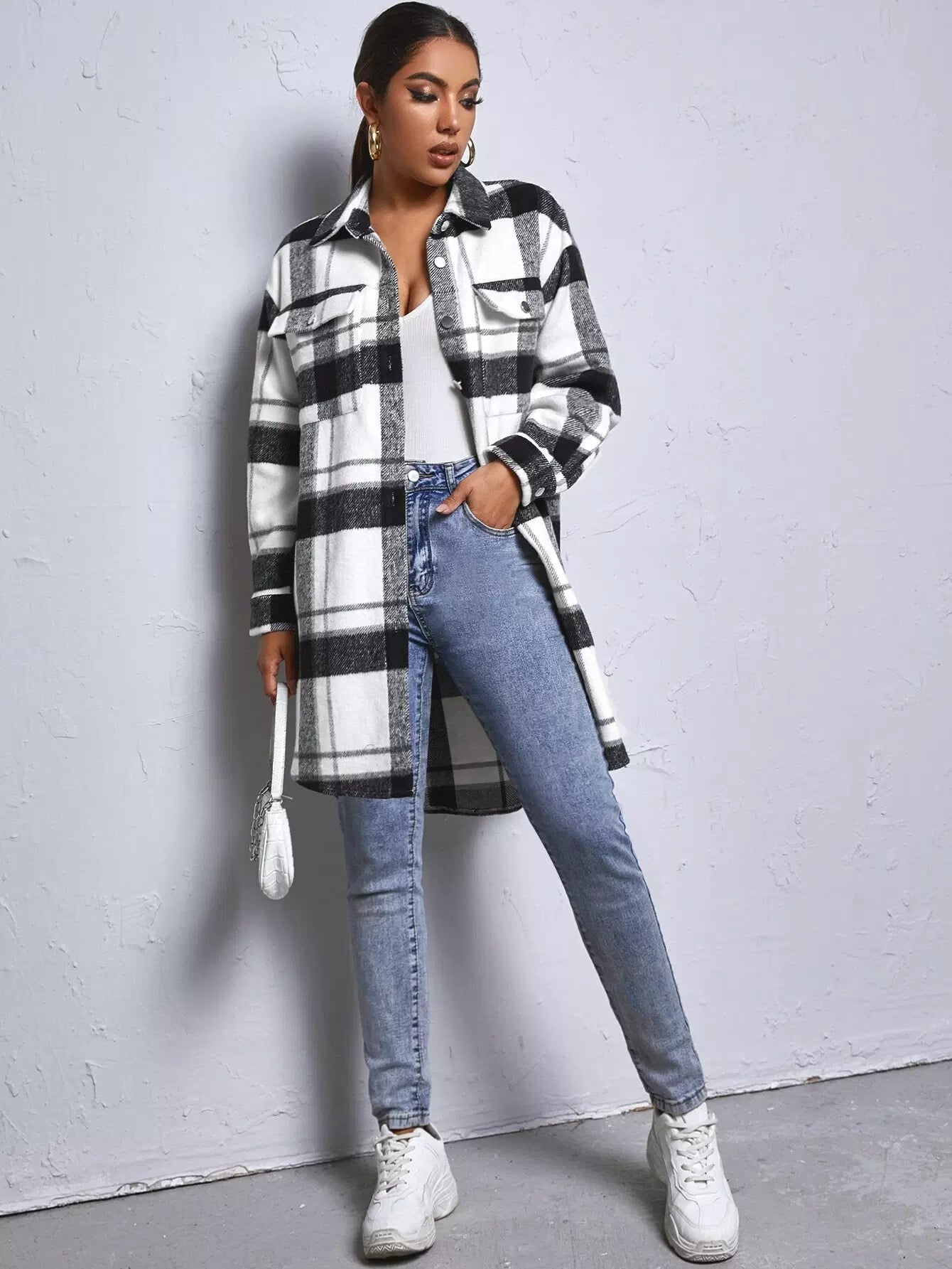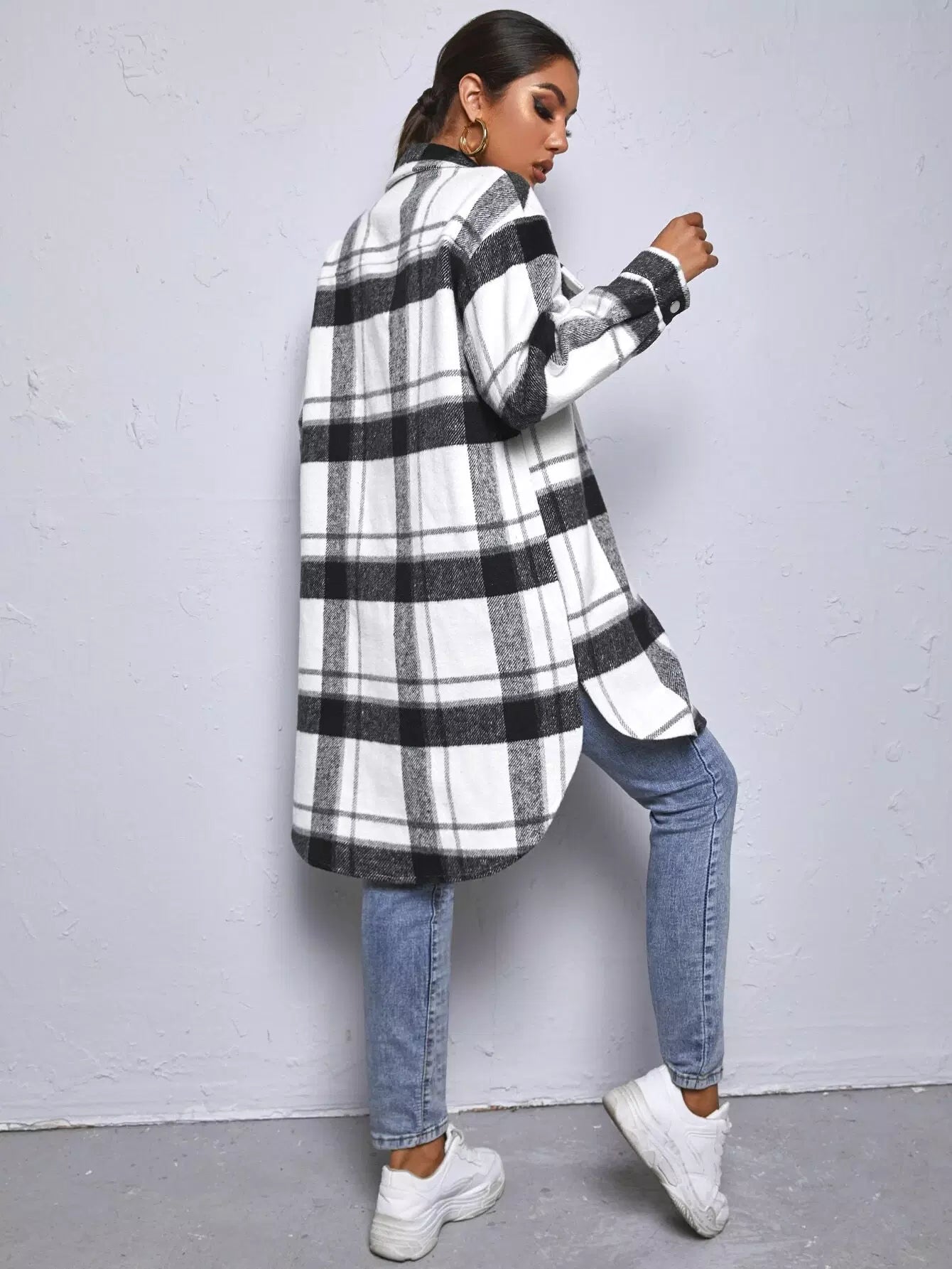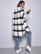 Collared Flap Pocket Front Curved Hem Plaid Coat
