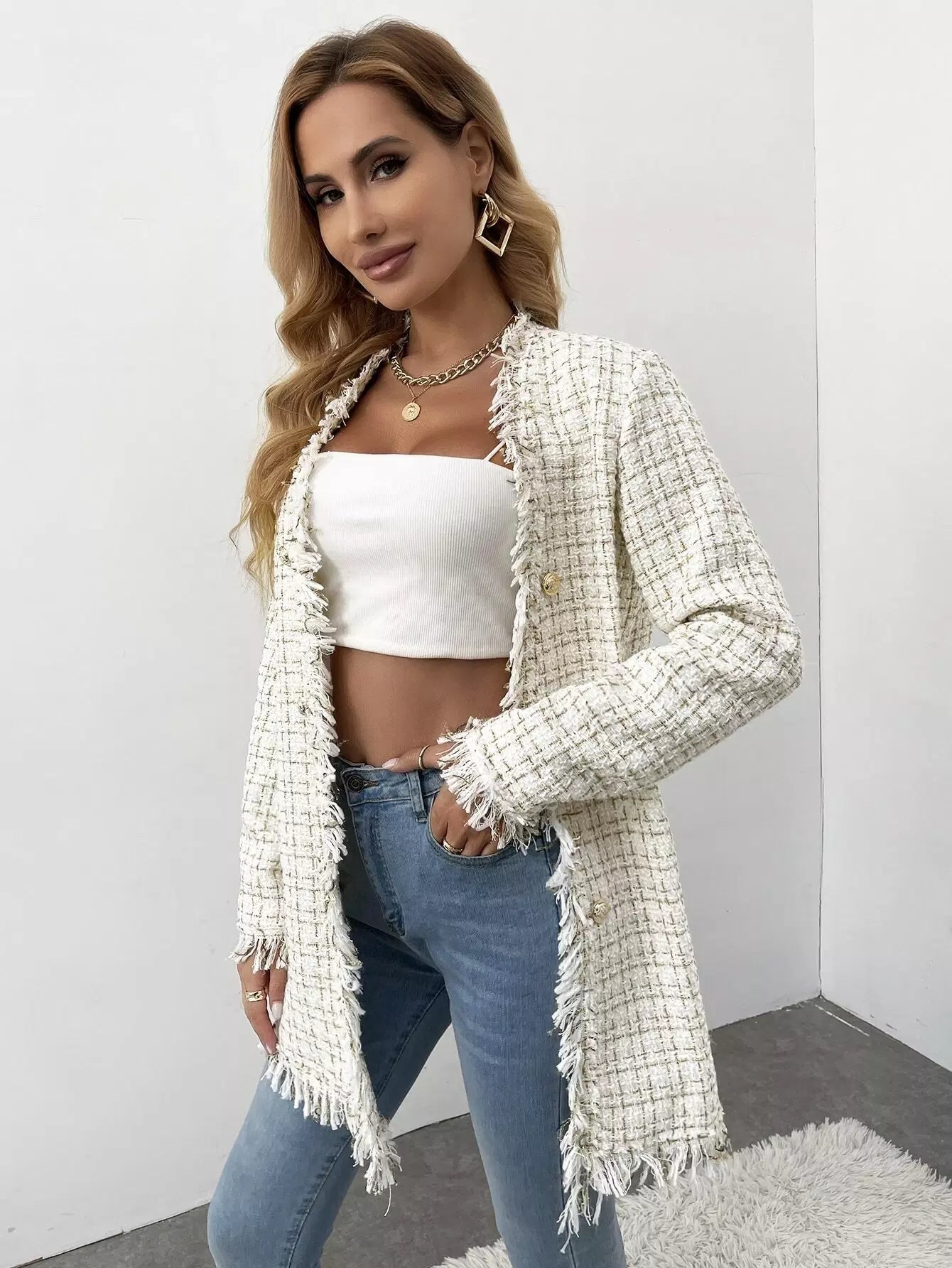 Double Breasted Raw Cut Plaid Tweed Overcoat