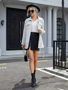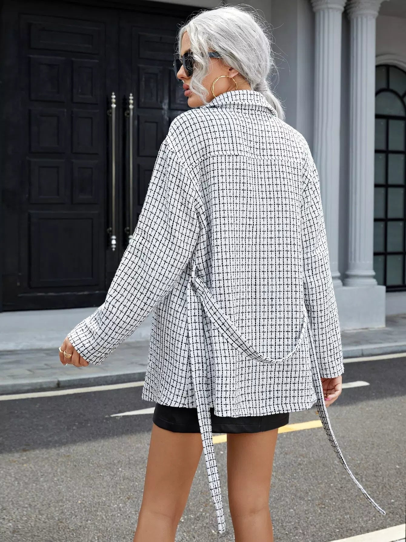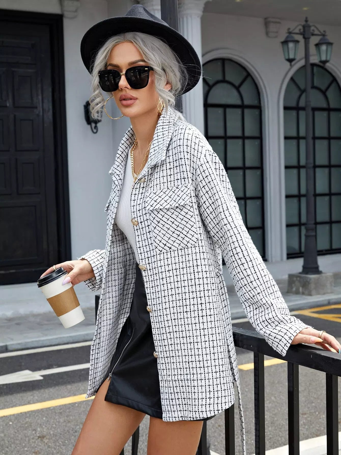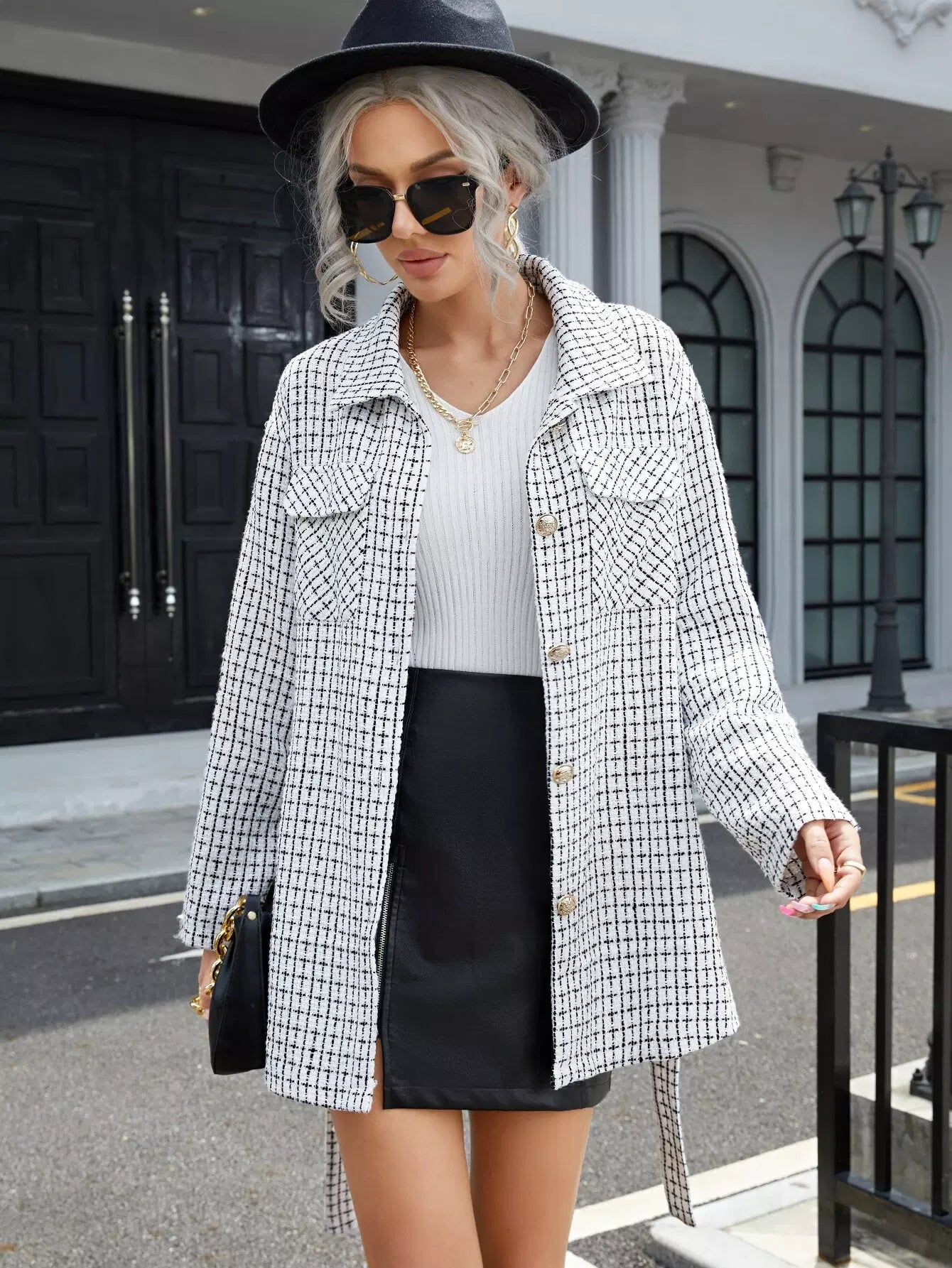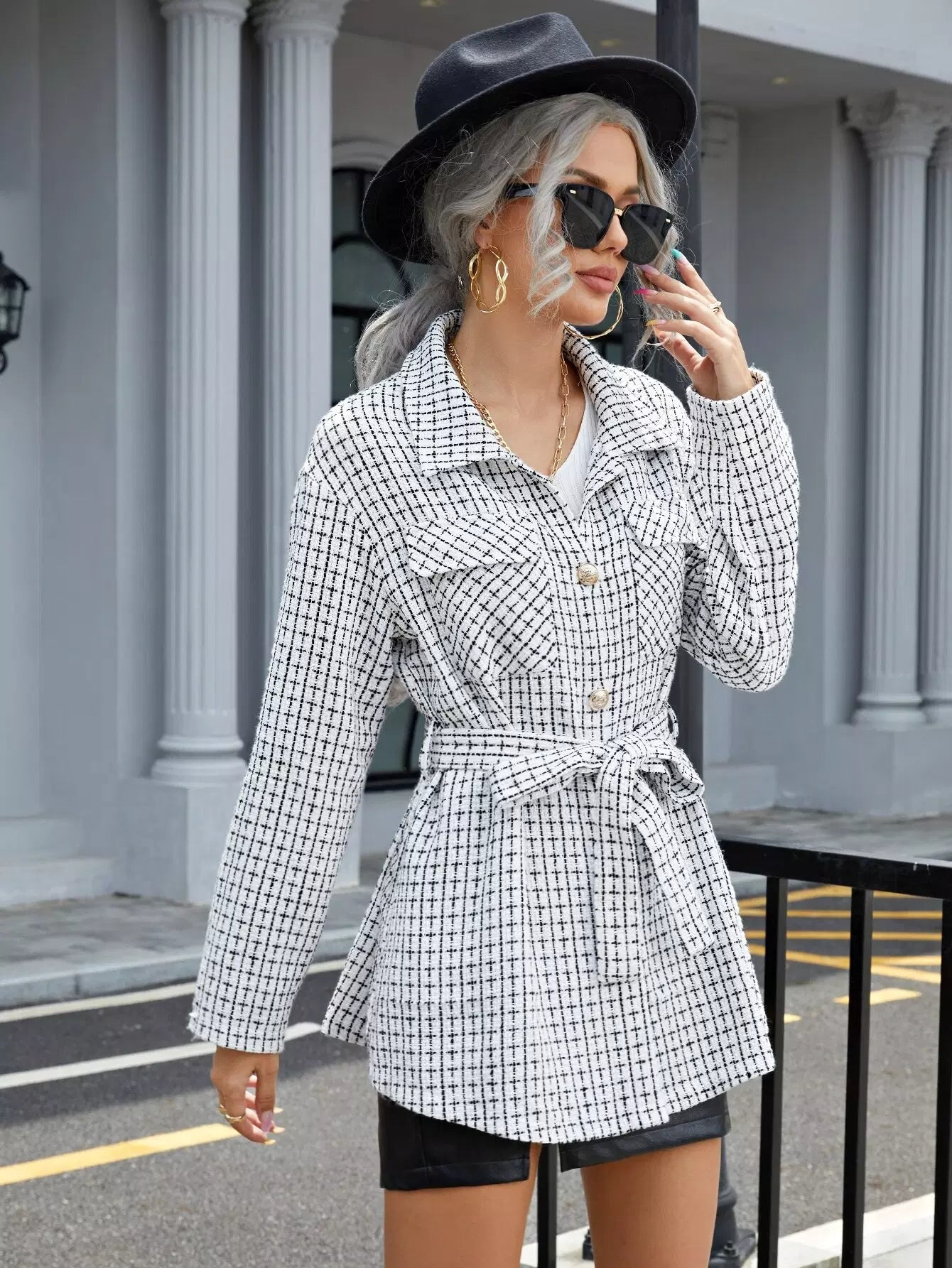 Flap Pocket Grid Pattern Tweed Coat Without Belt