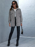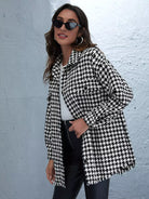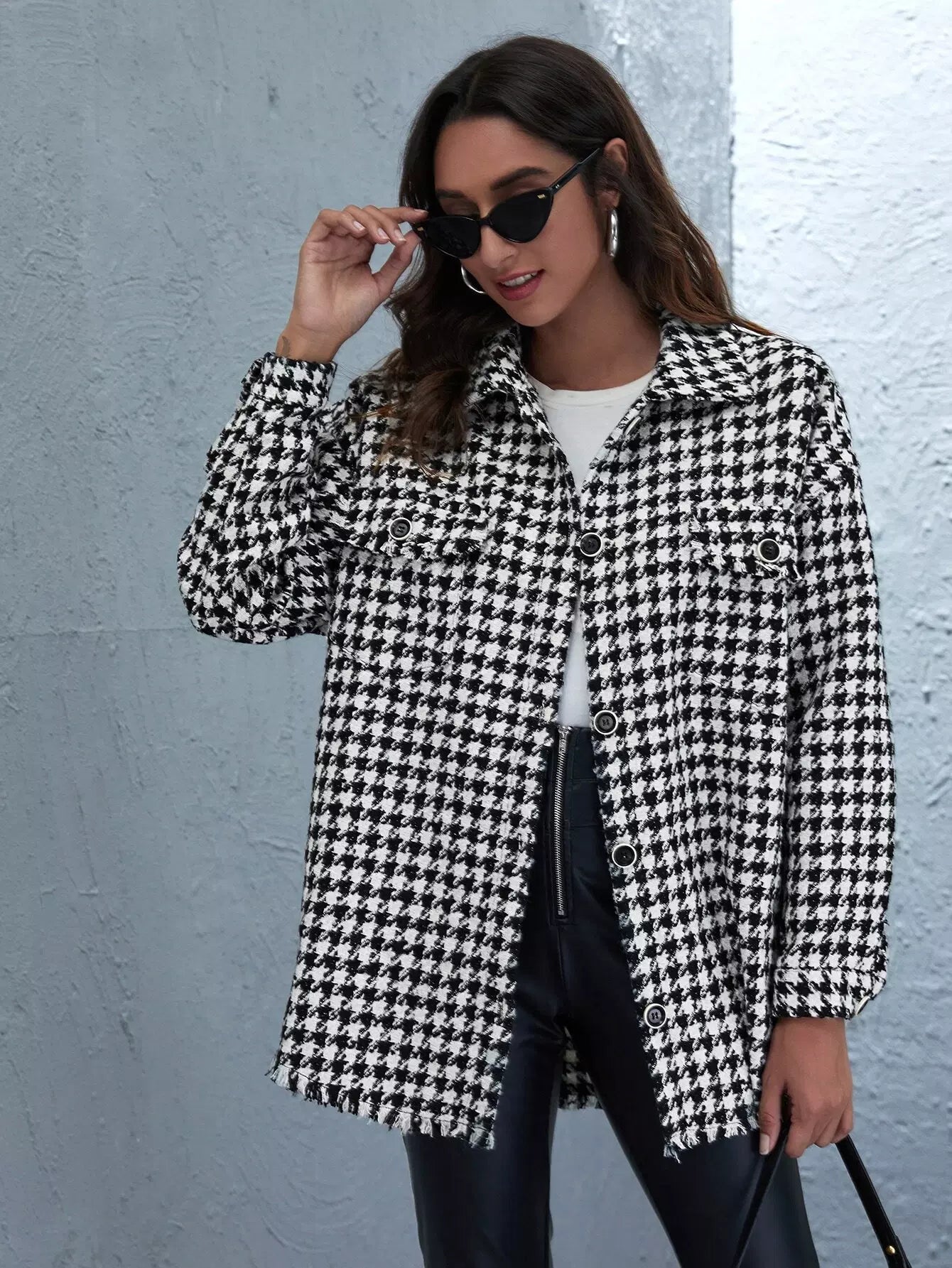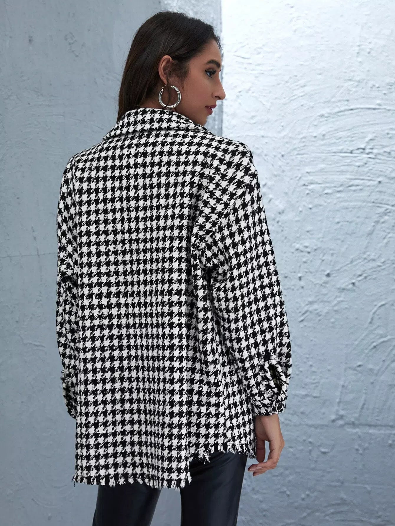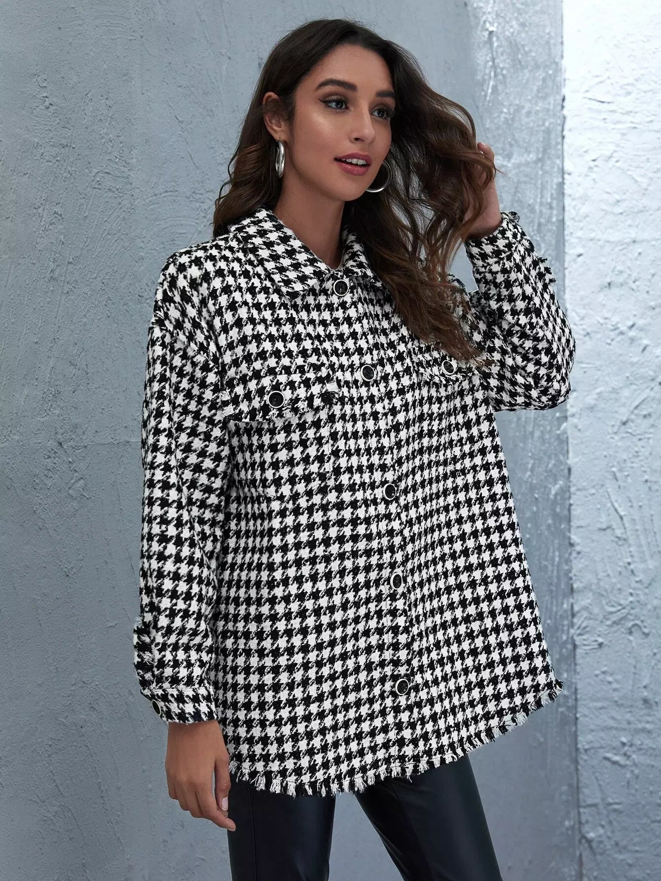 Houndstooth Button Through Raw Hem Tweed Coat