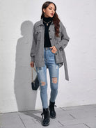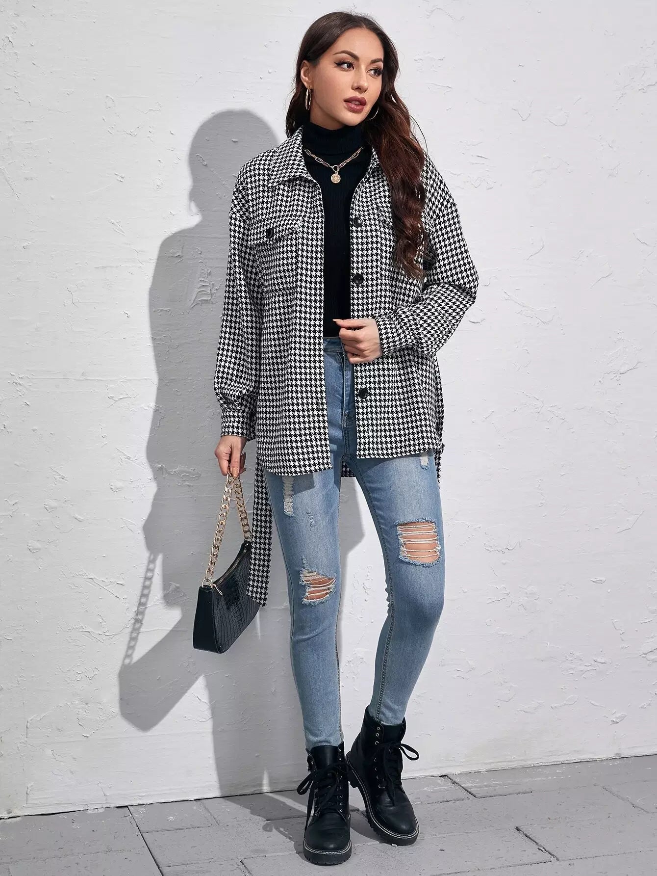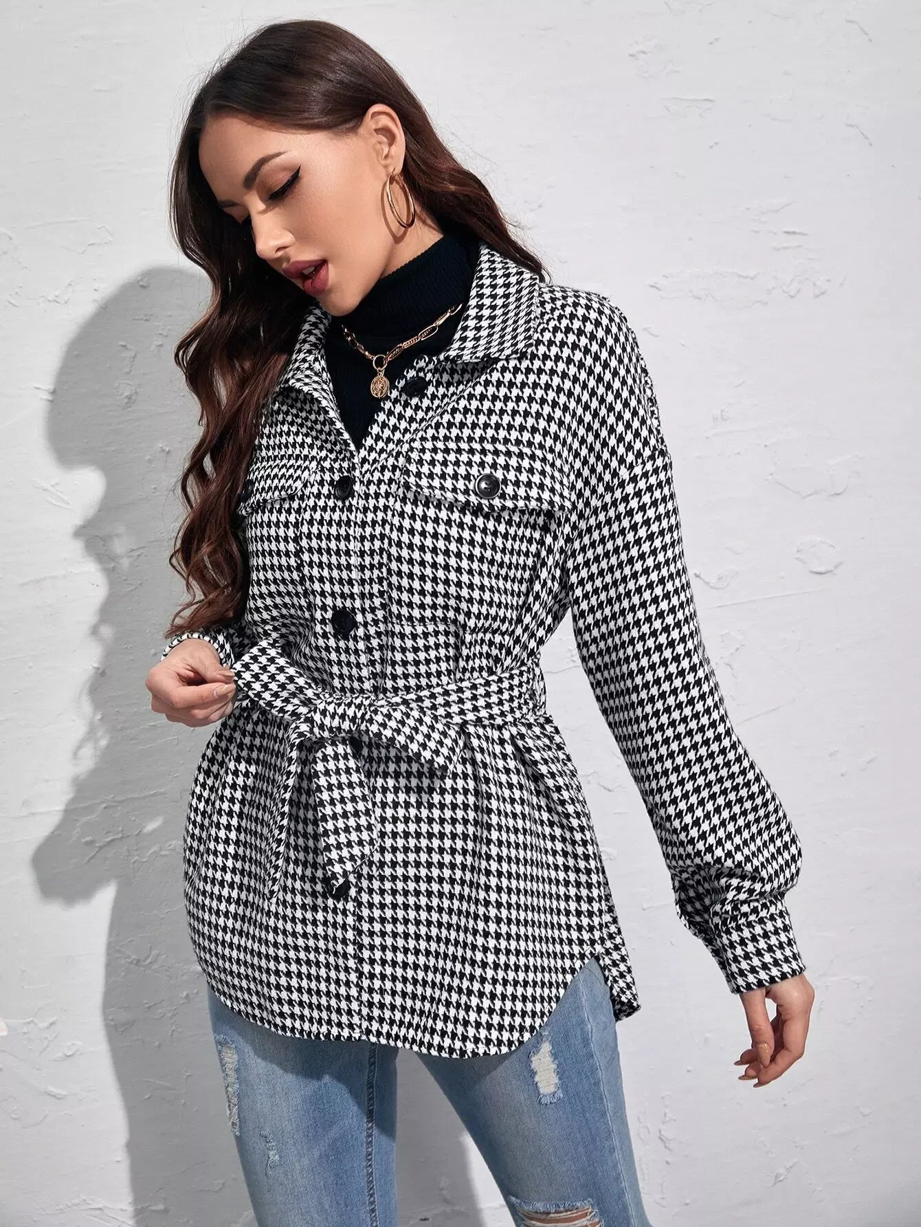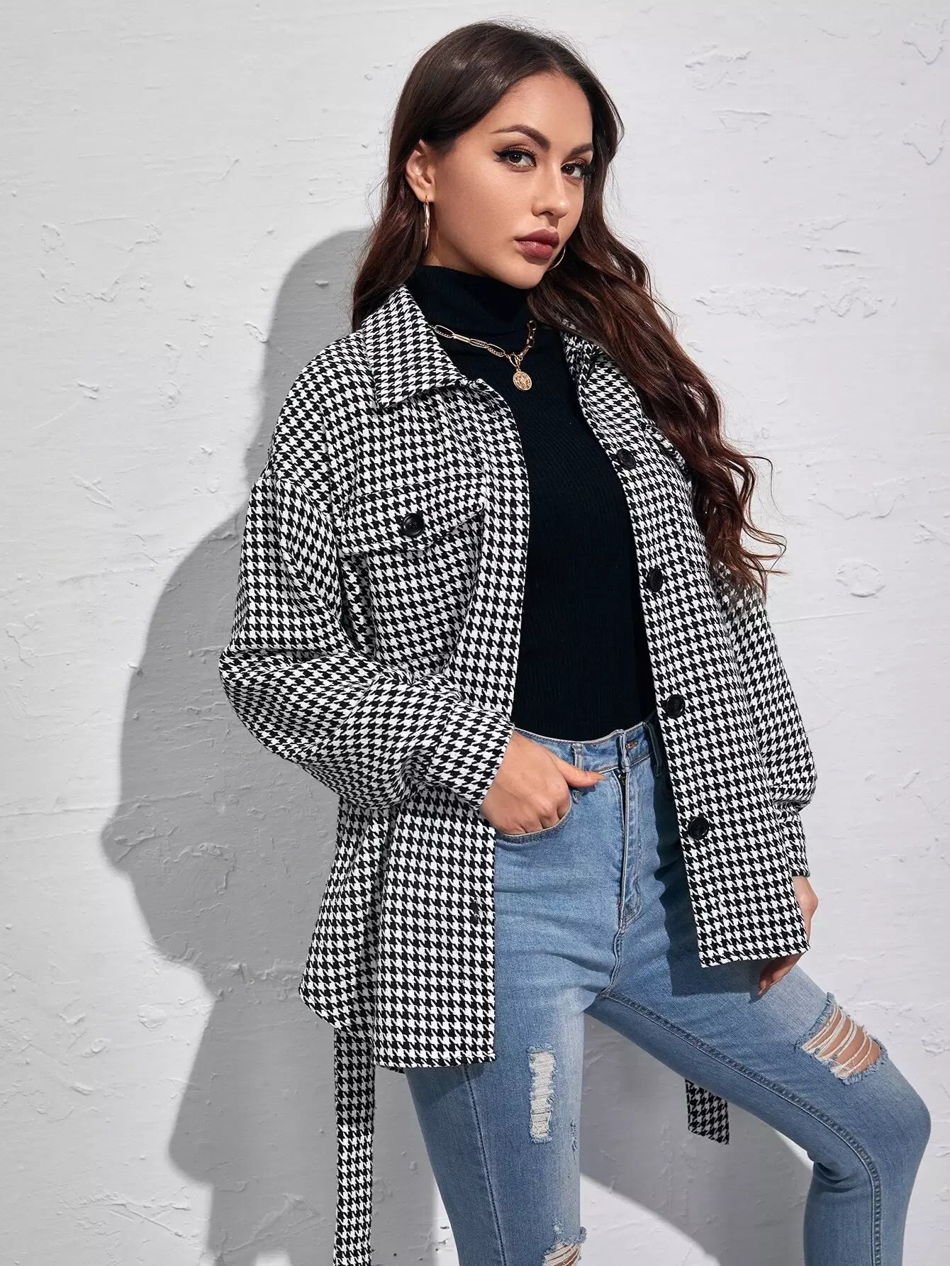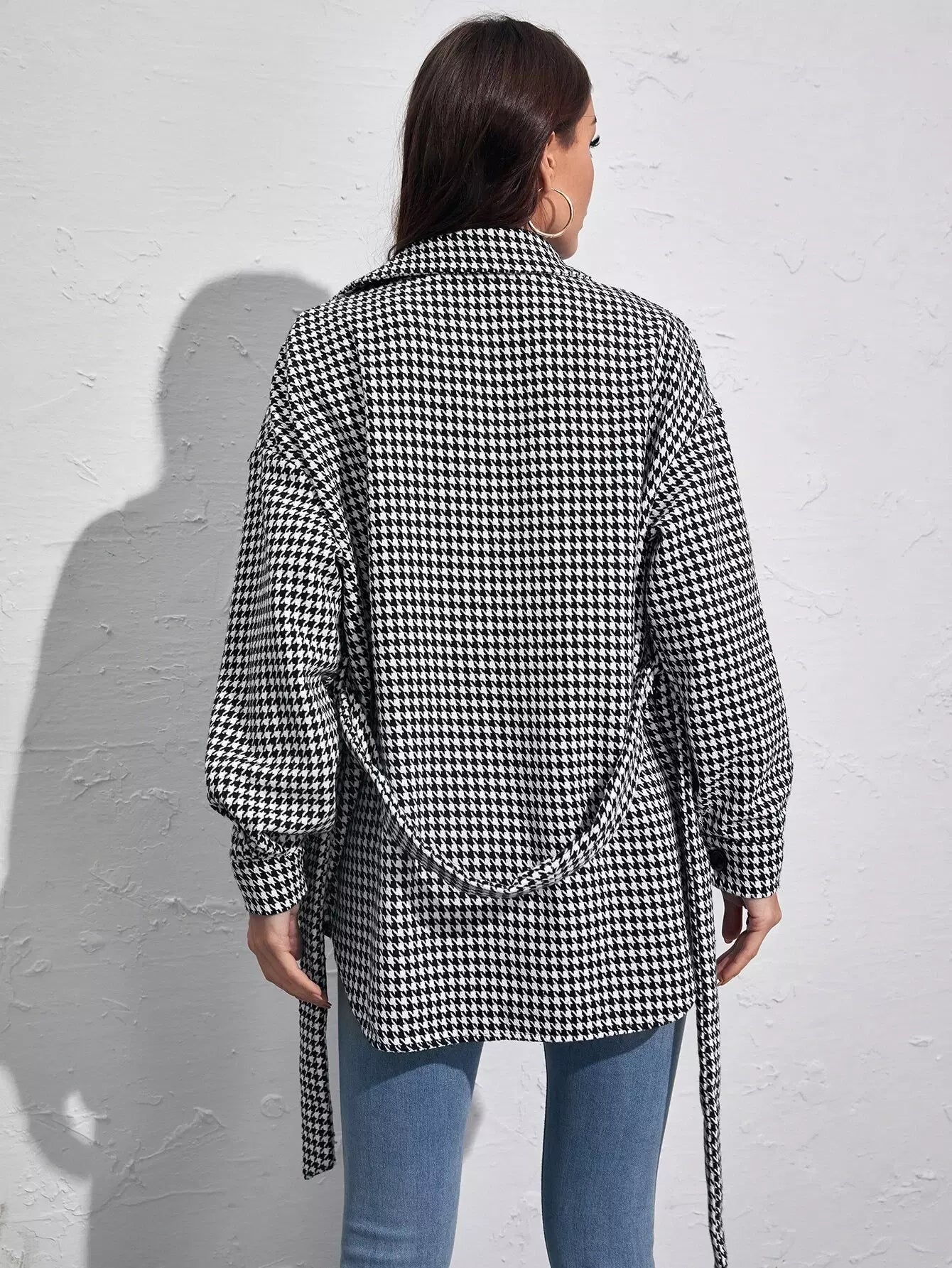 Houndstooth Flap Pocket Self Tie Overcoat