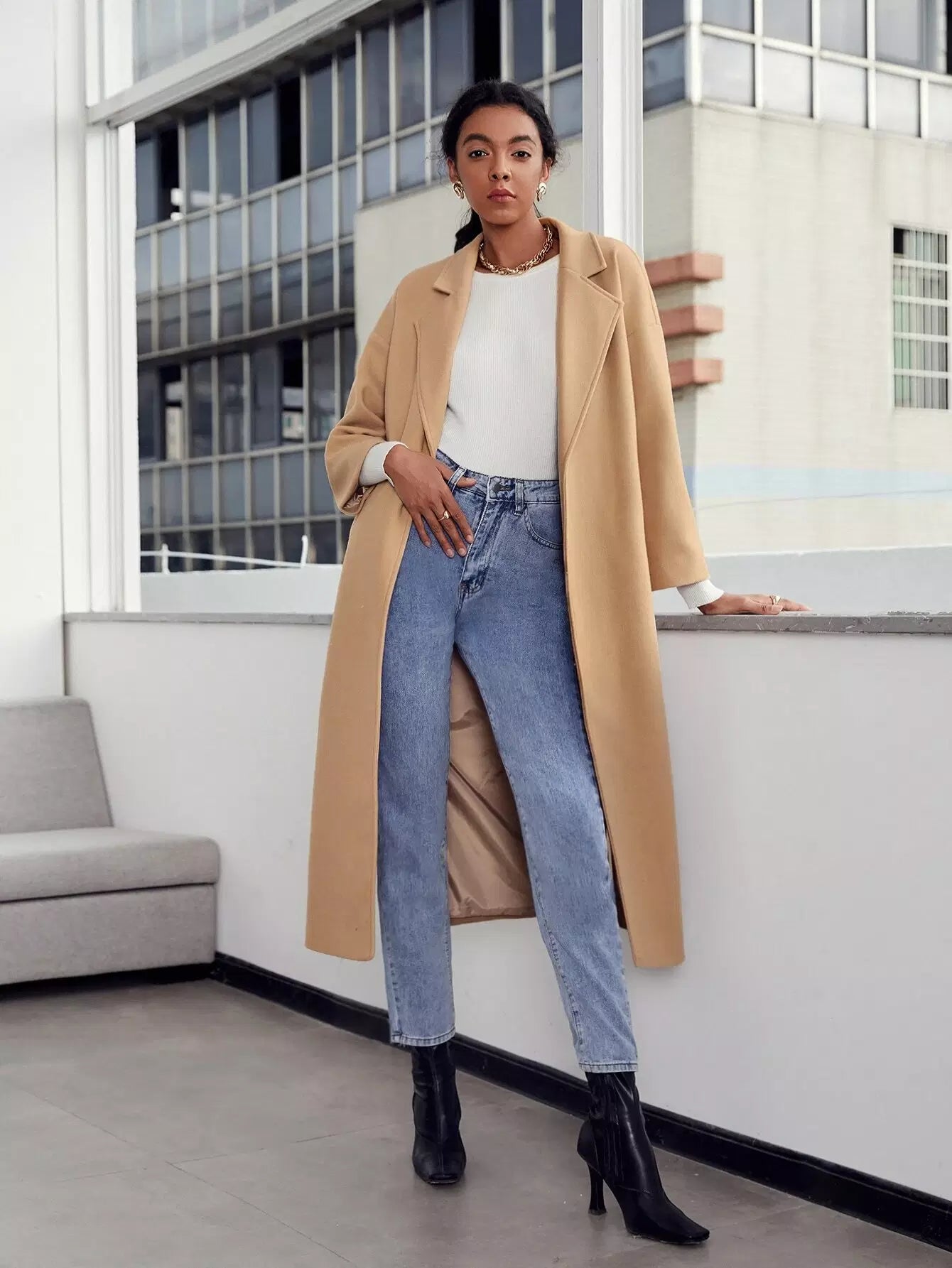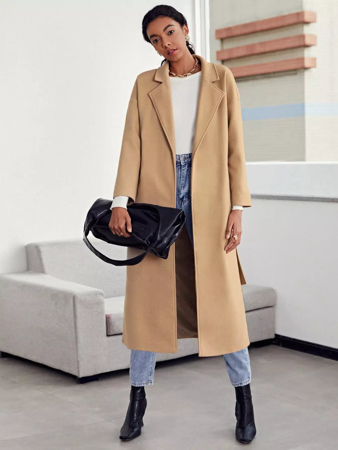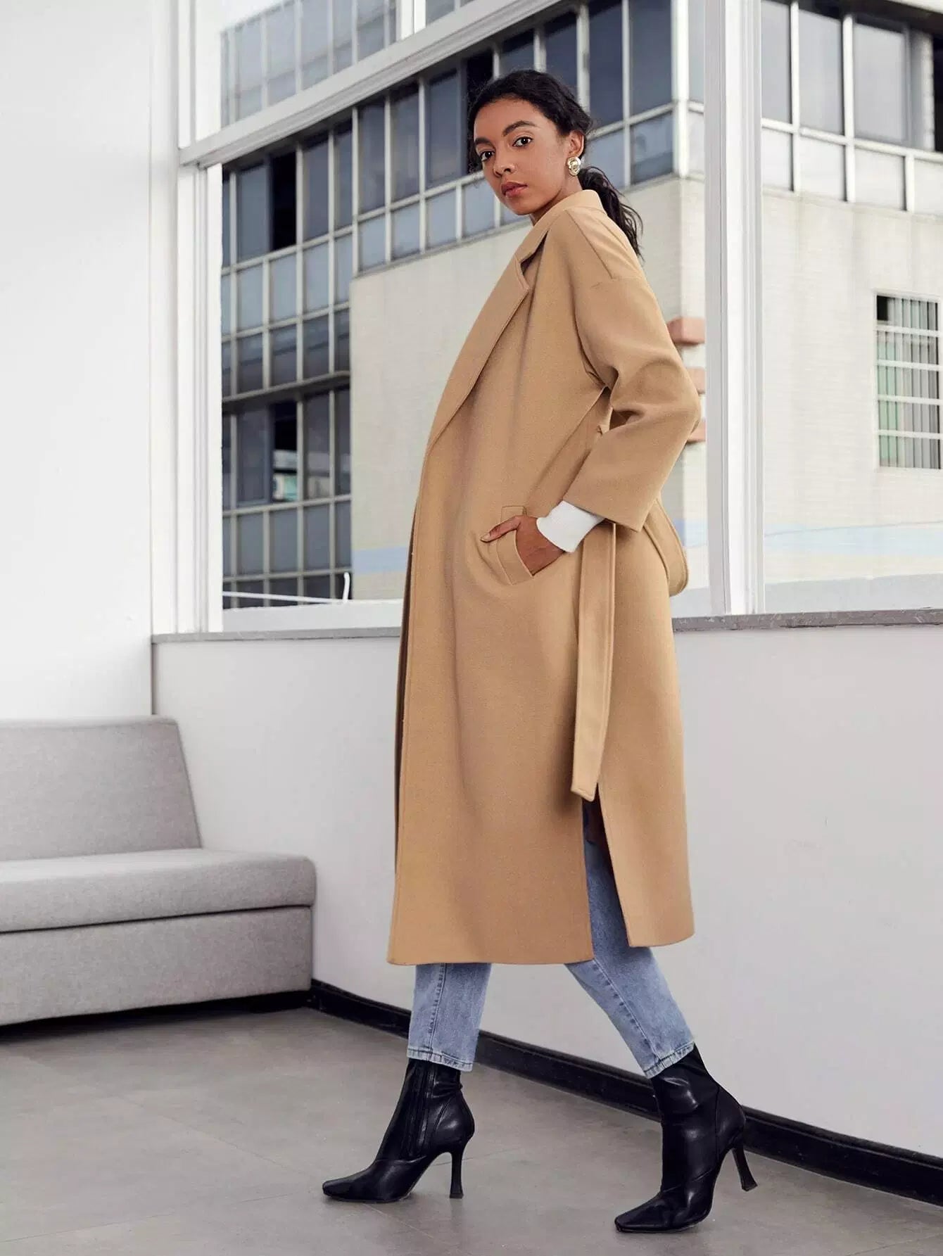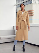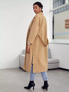 Notch Collar Split Hem Self Overcoat Without Belt