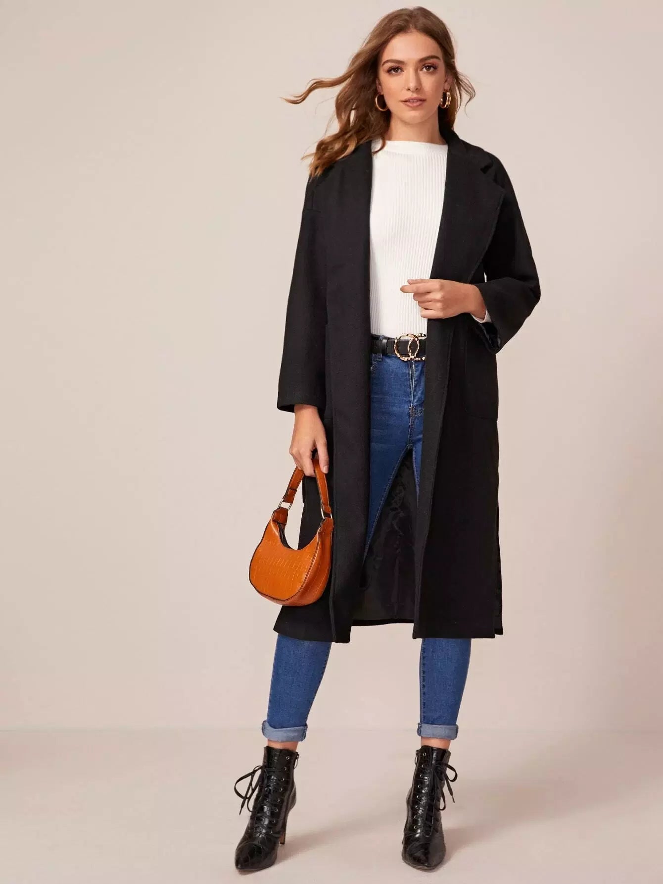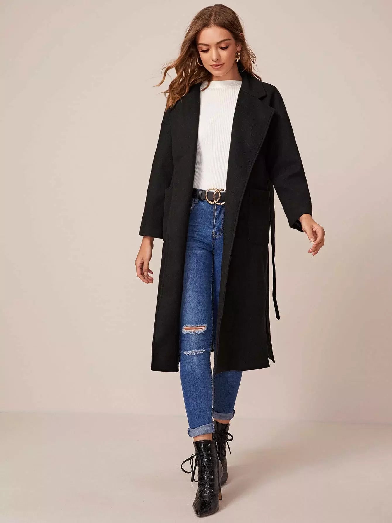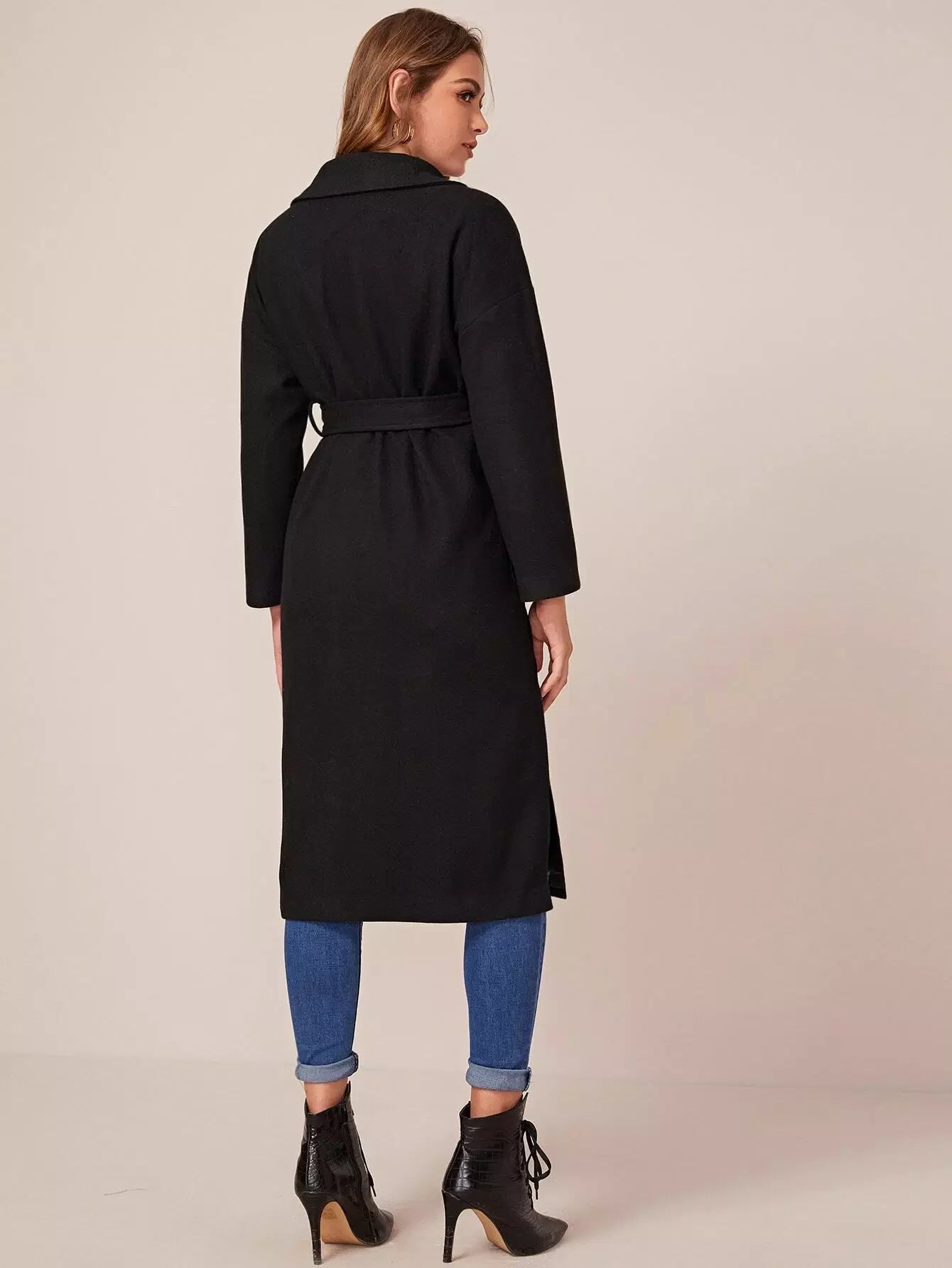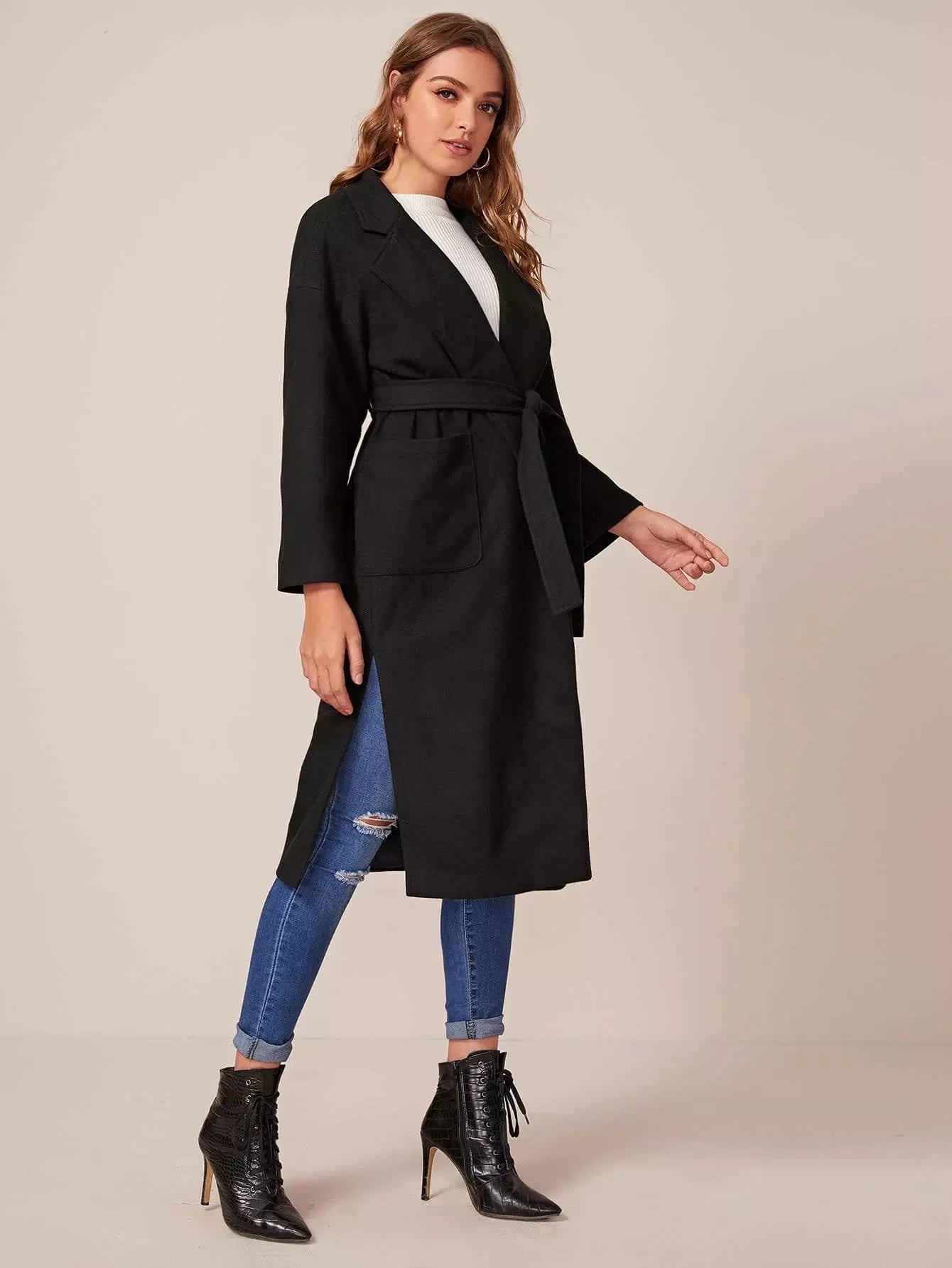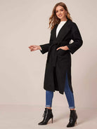 Notched Collar Self Pocket Front Split Side Coat Without Belt