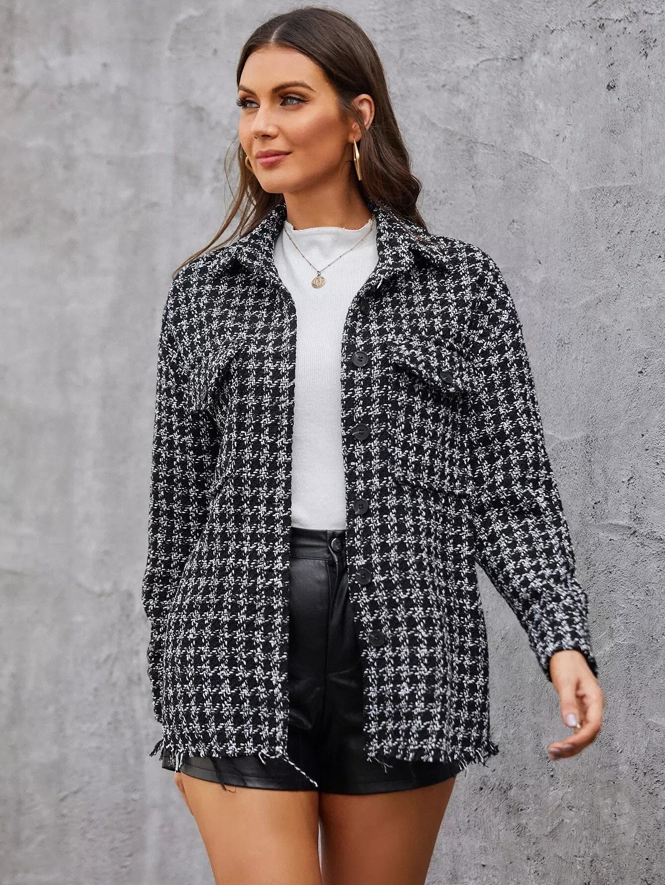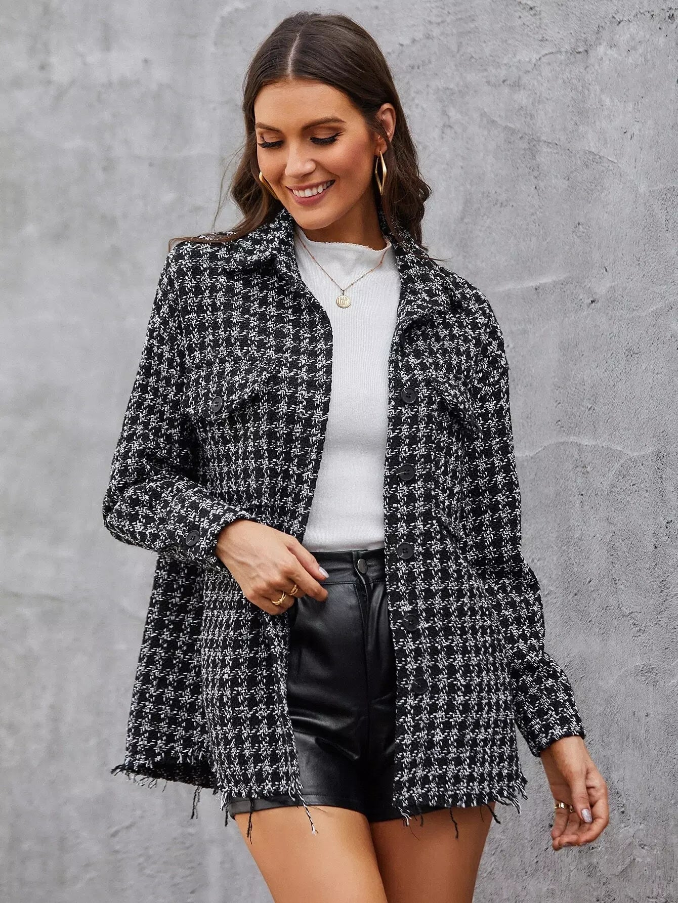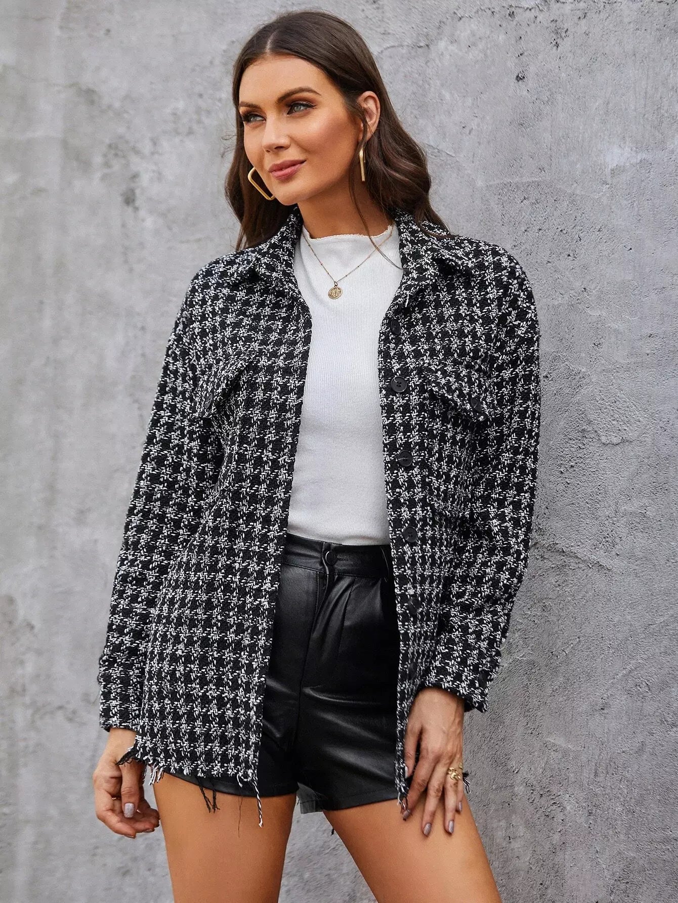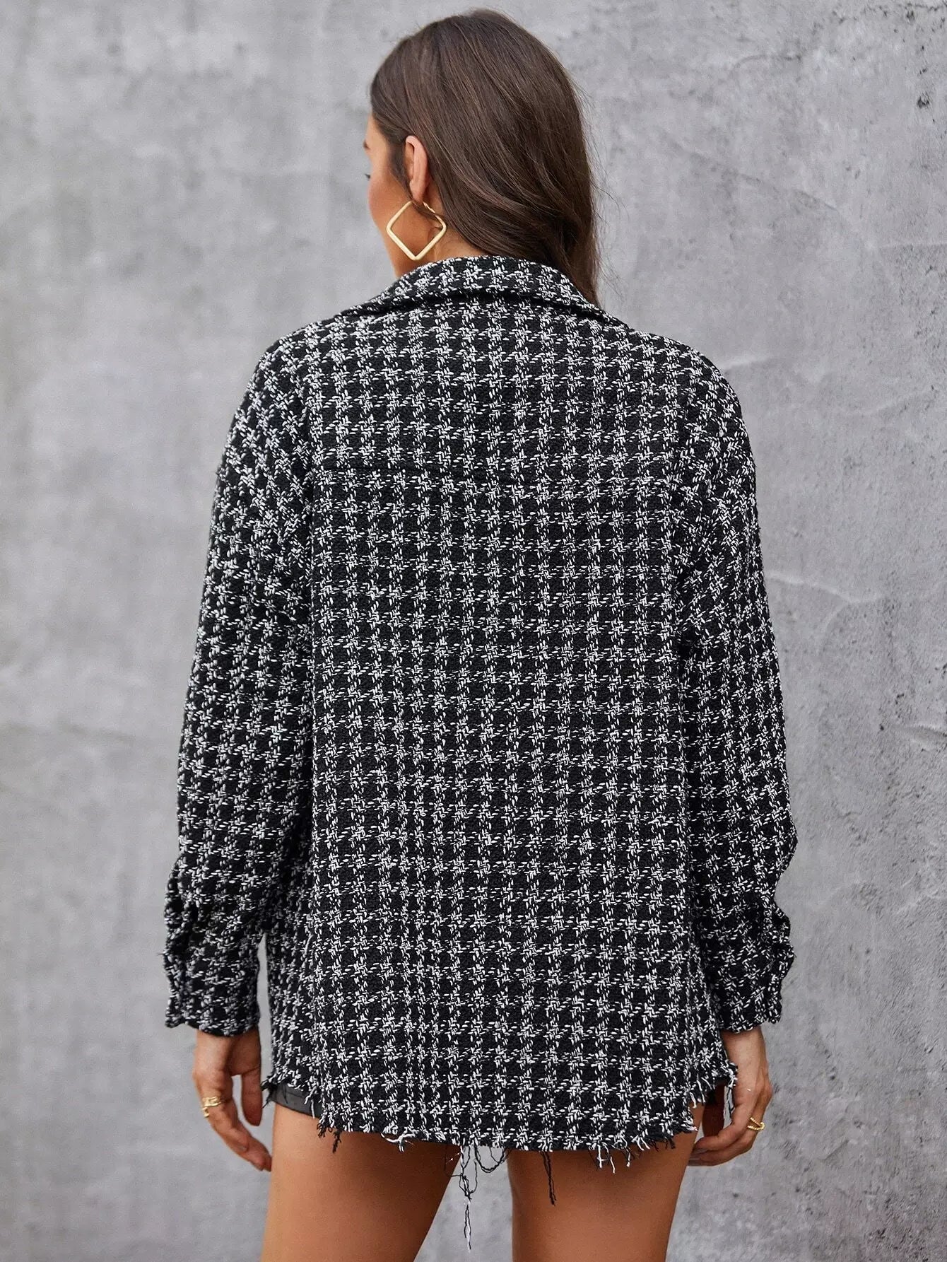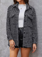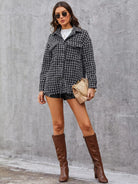 Plaid Print Flap Pocket Button Up Tweed Jacket
