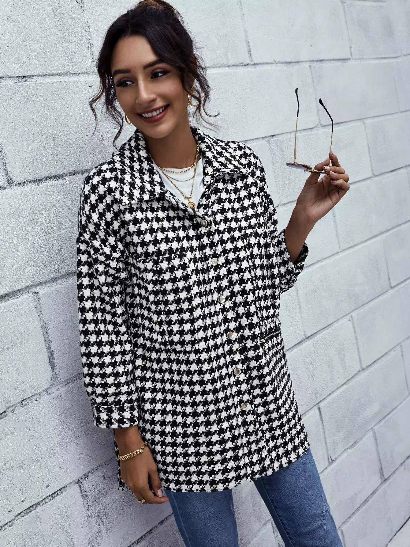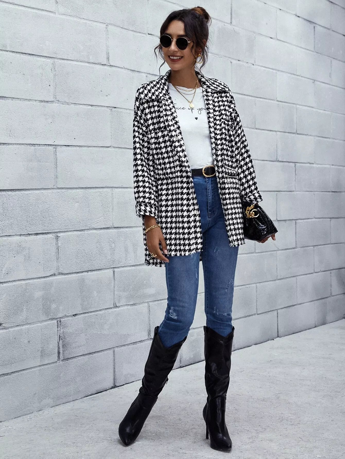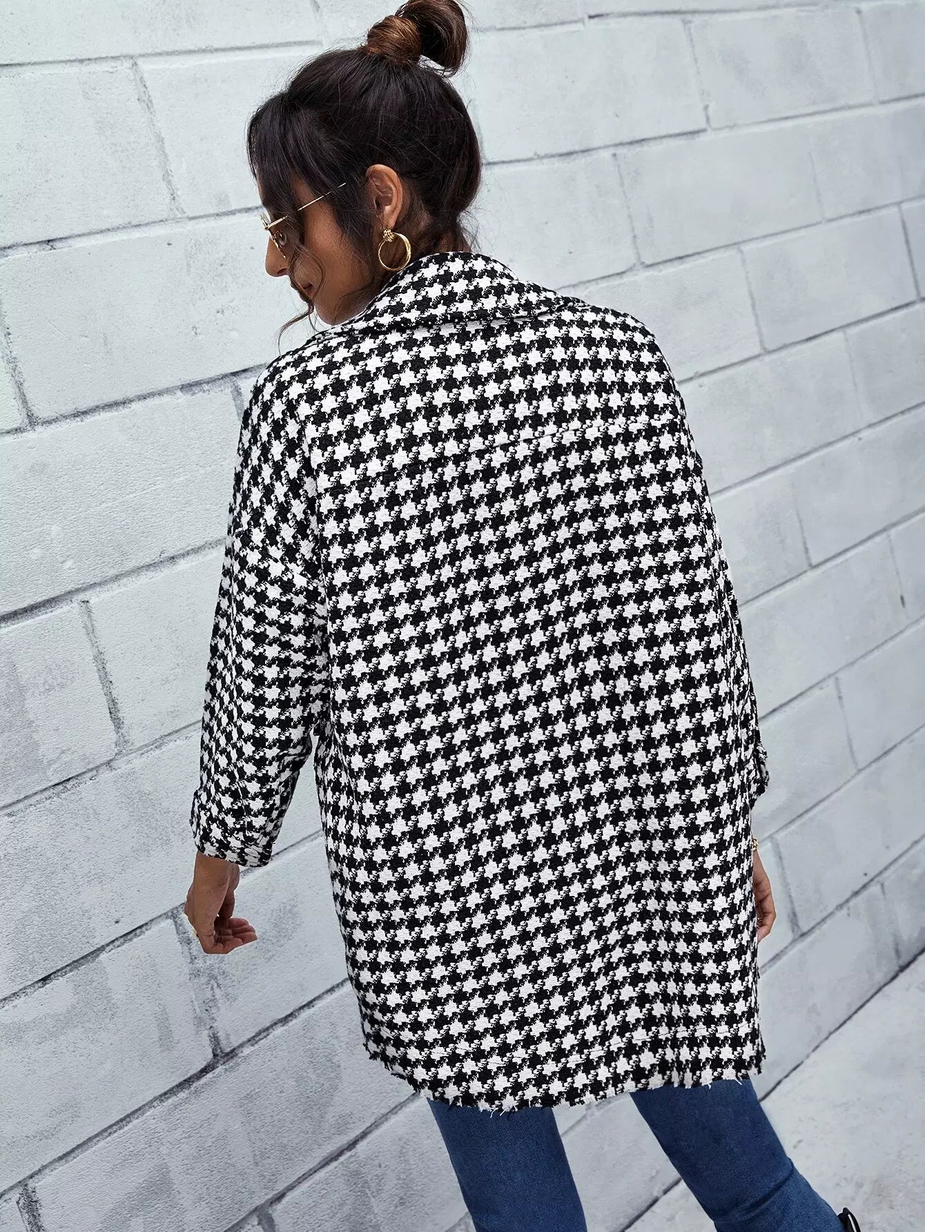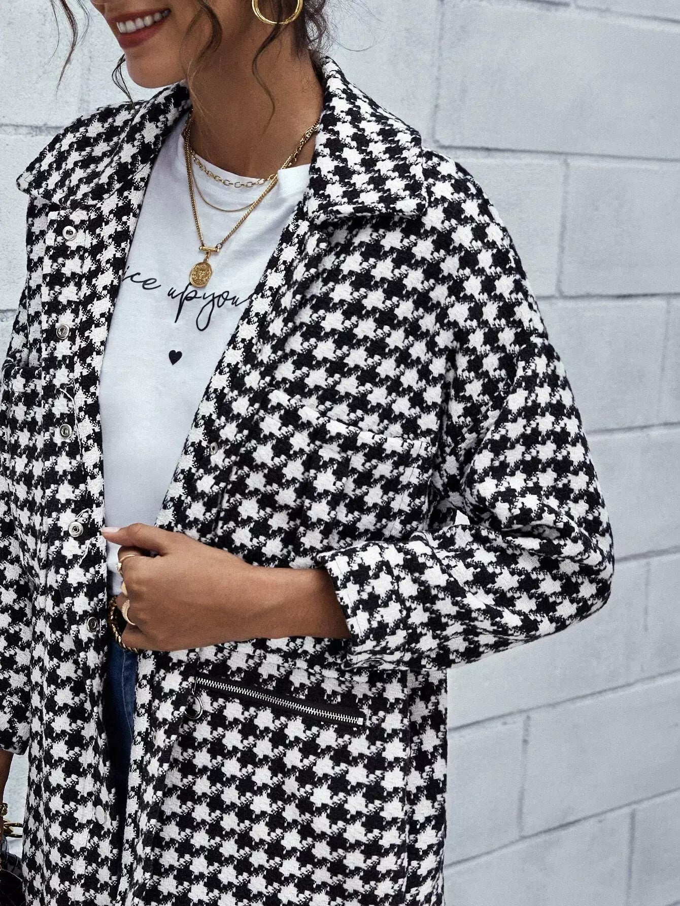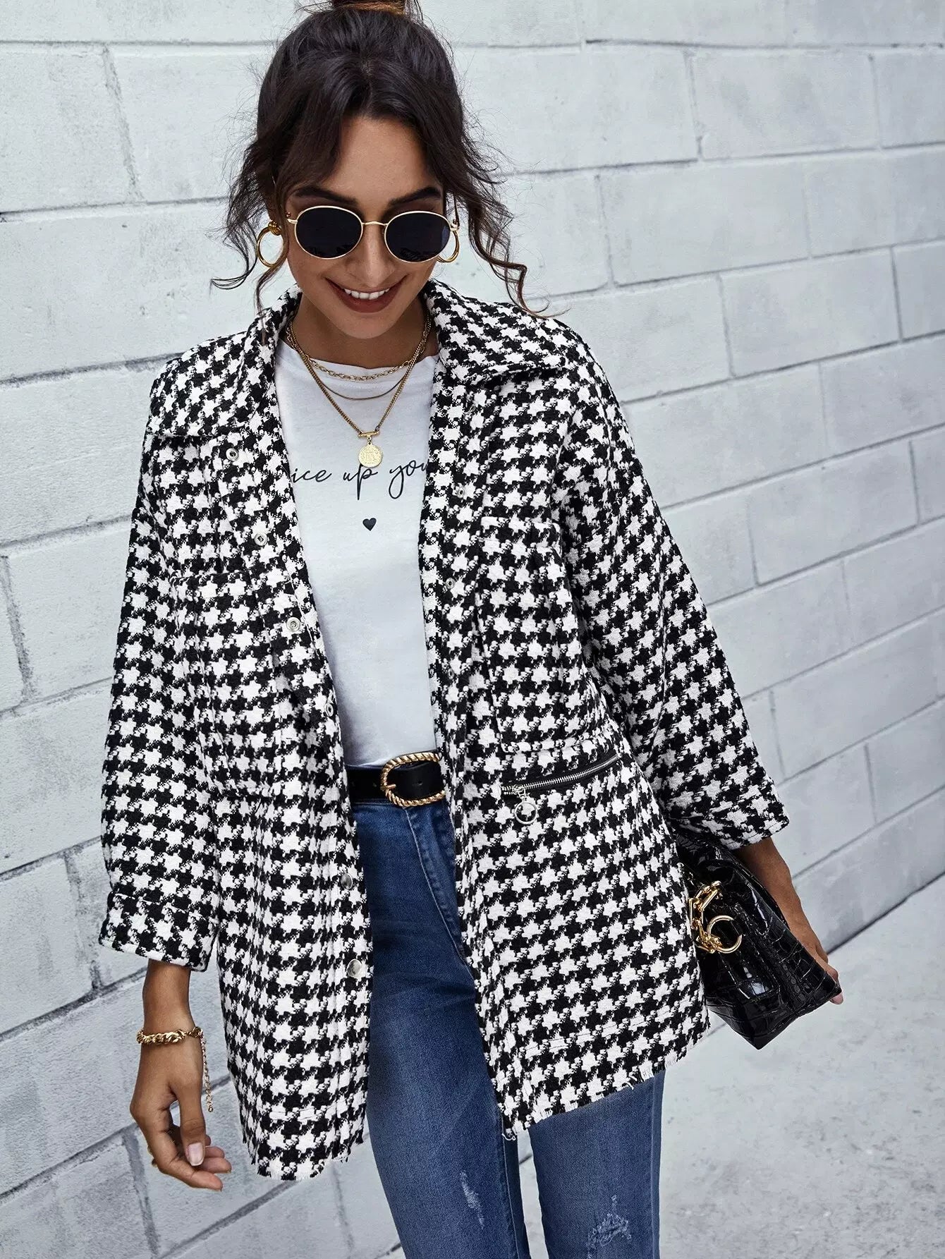 Tweed Houndstooth Zipper Detail Button Up Coat