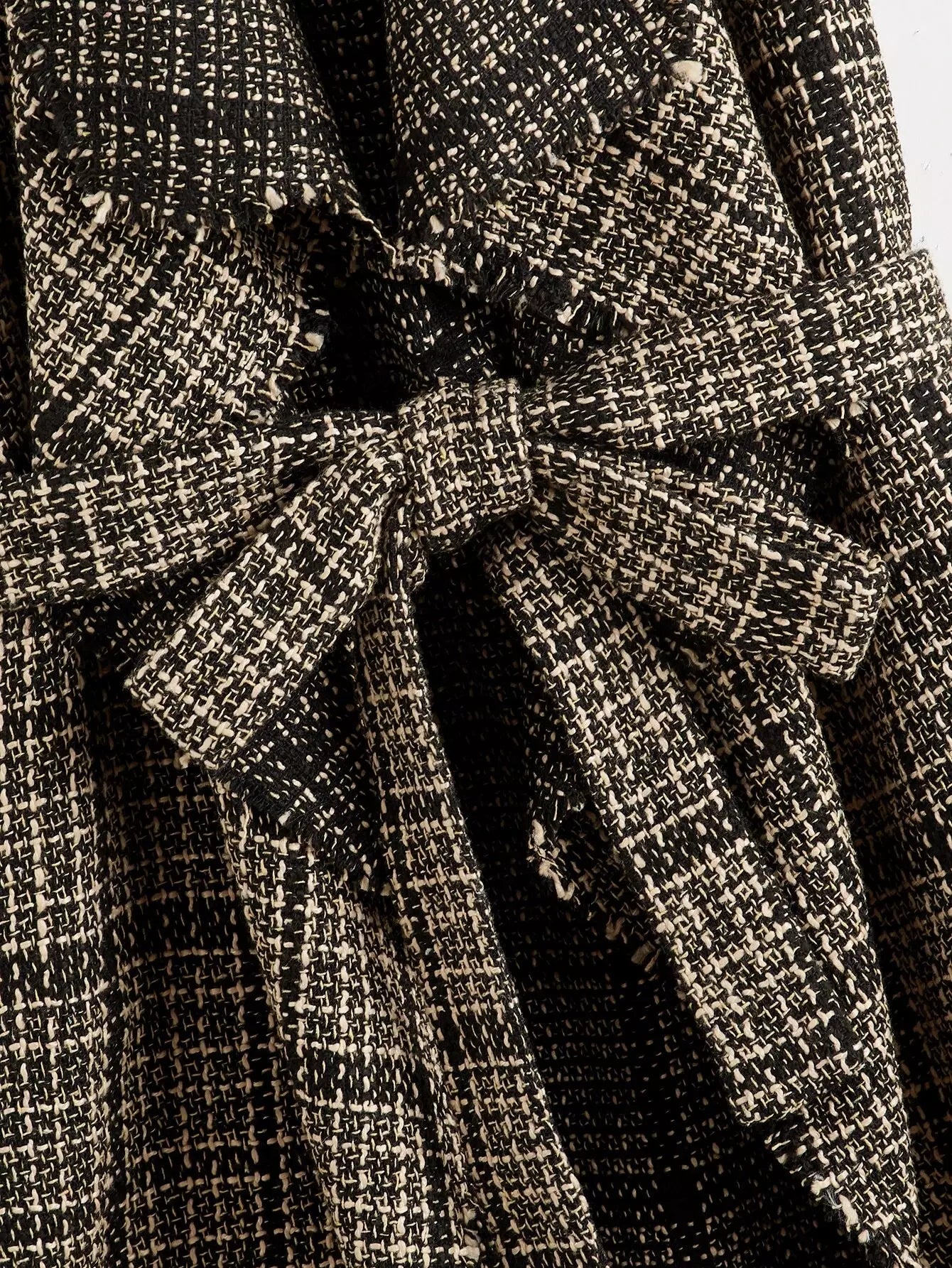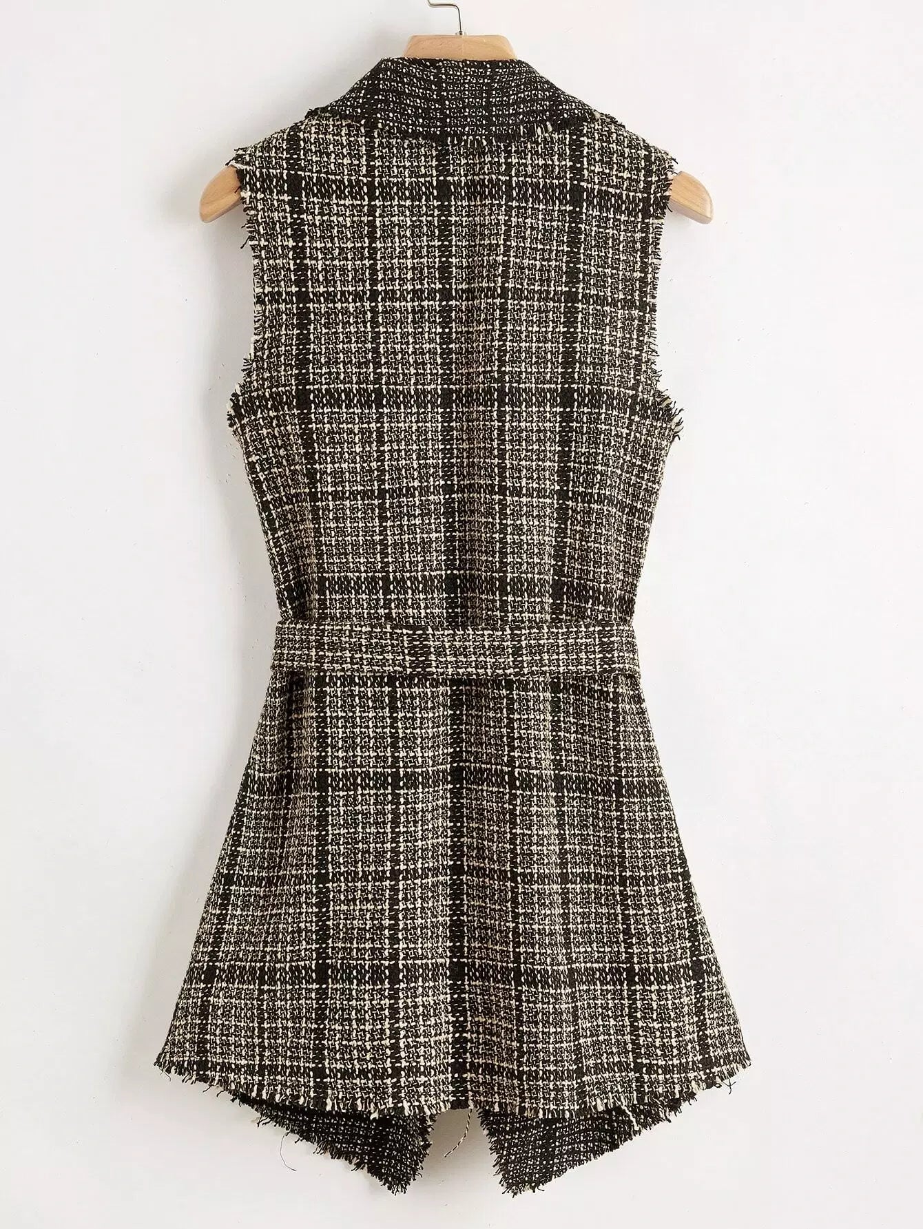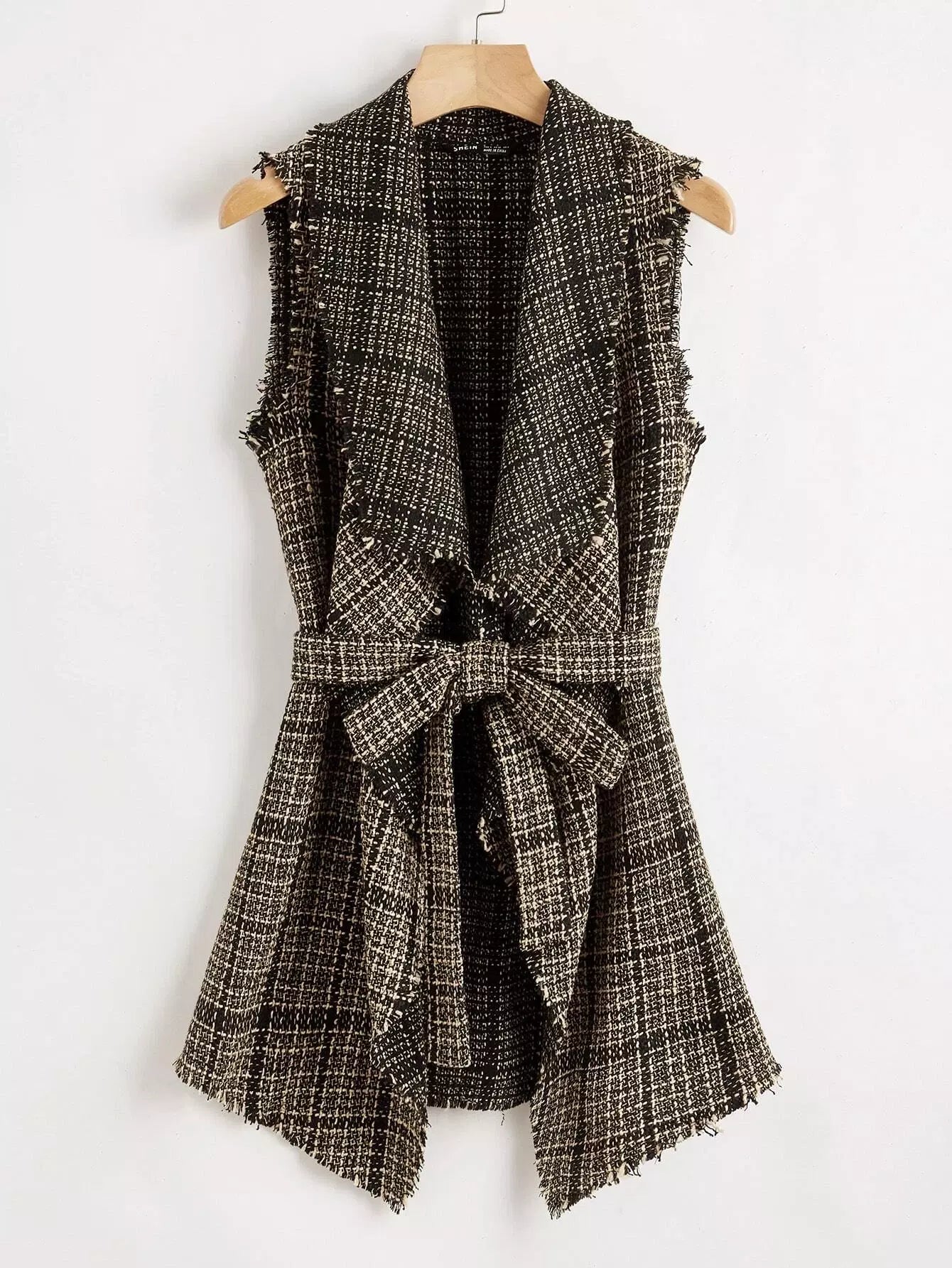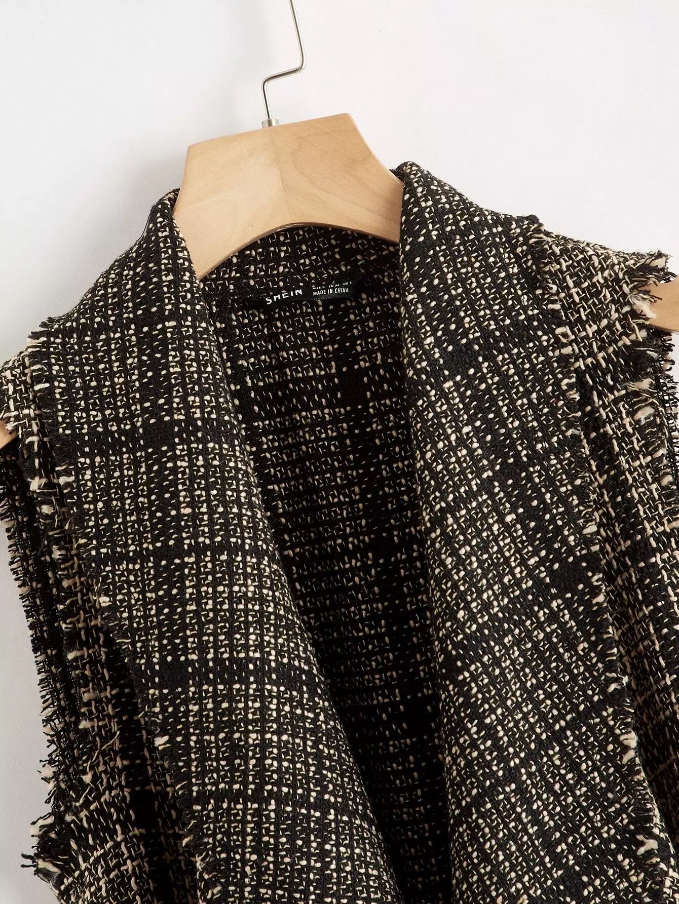 Waterfall Neck Raw Hem Tweed Vest Coat Without Belt
