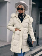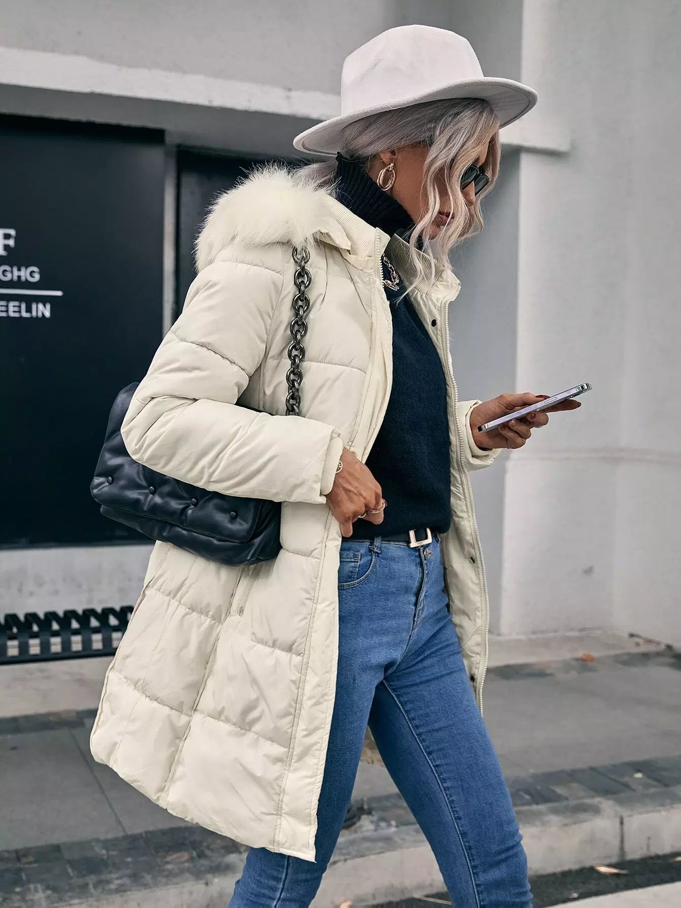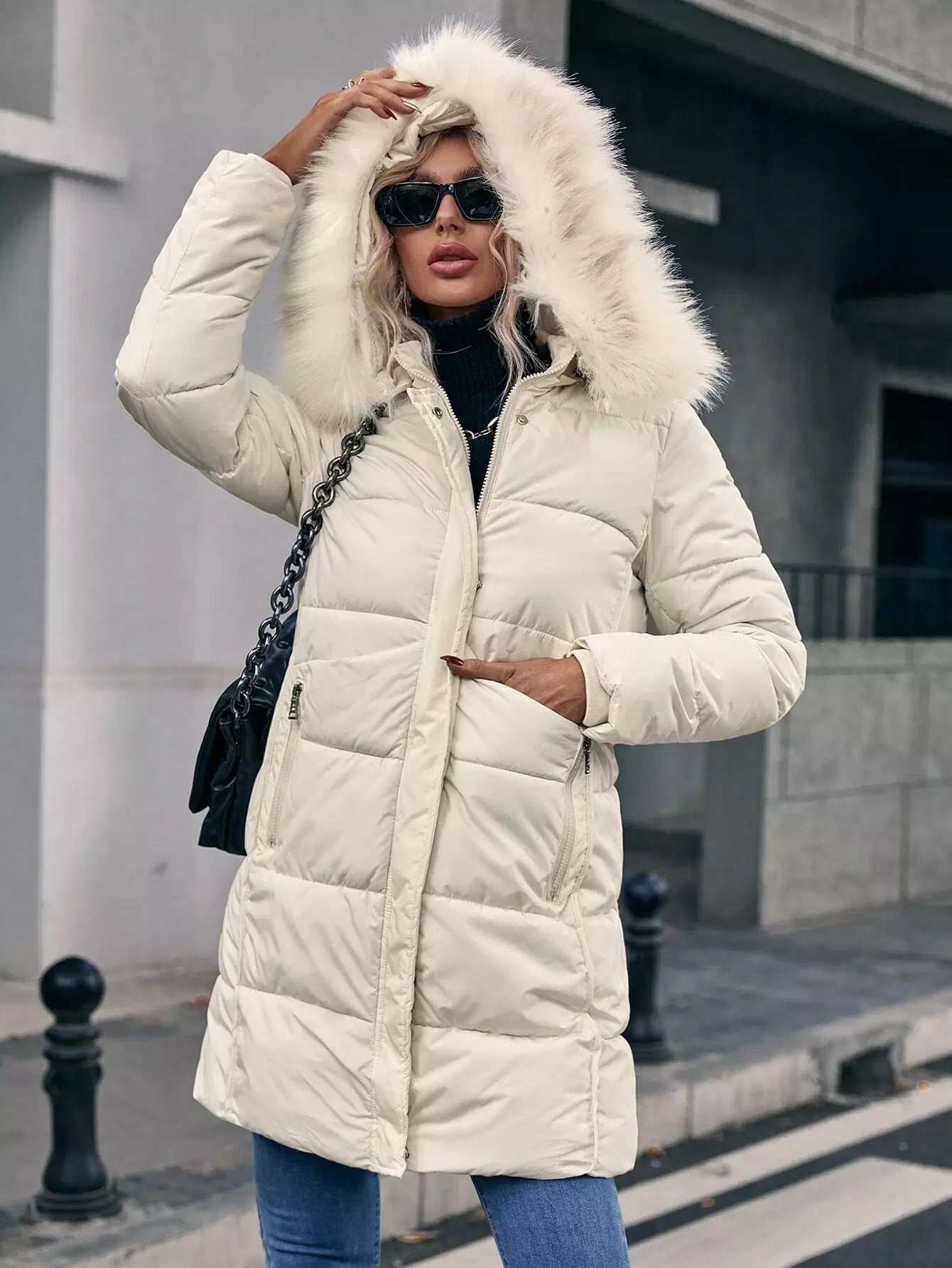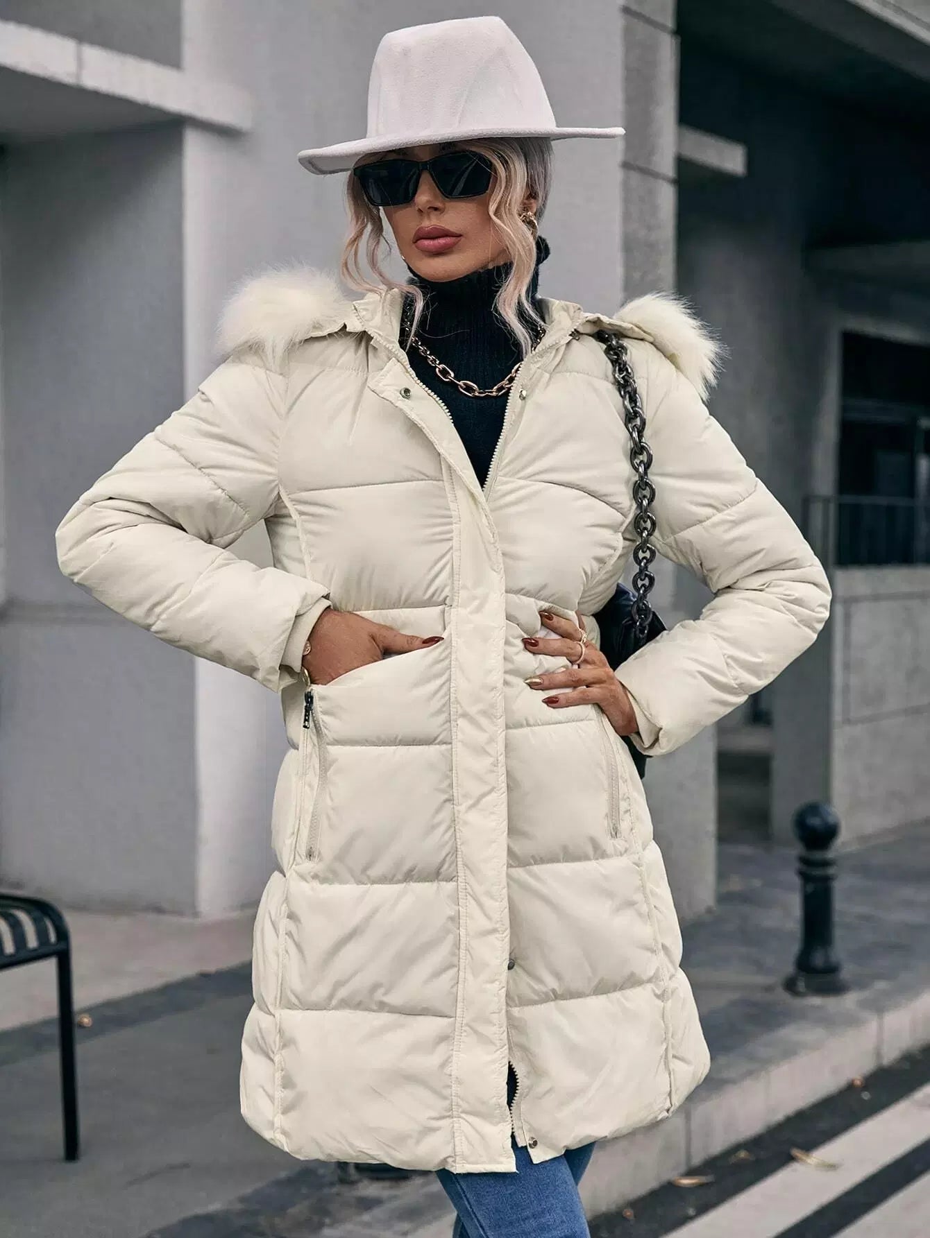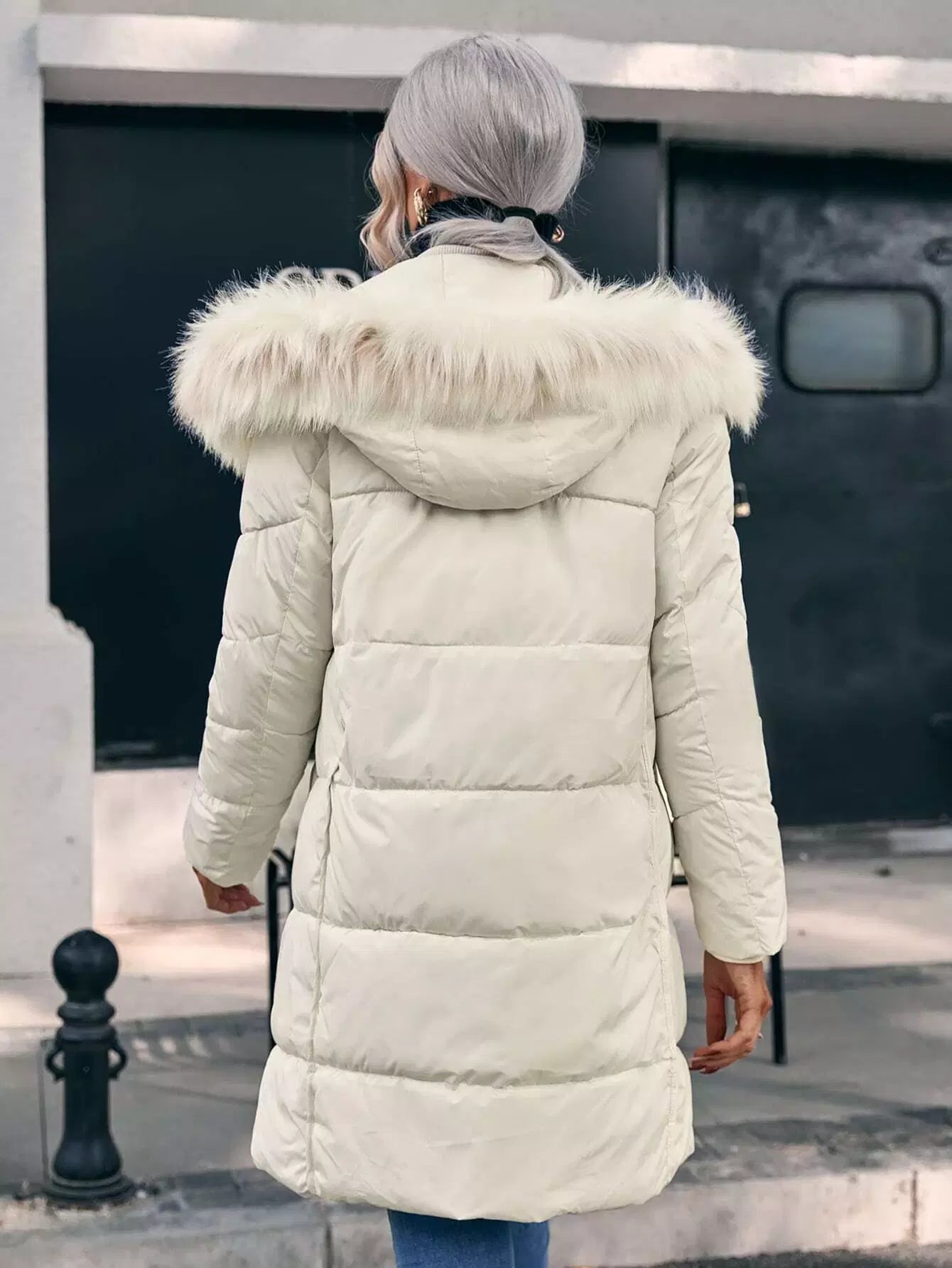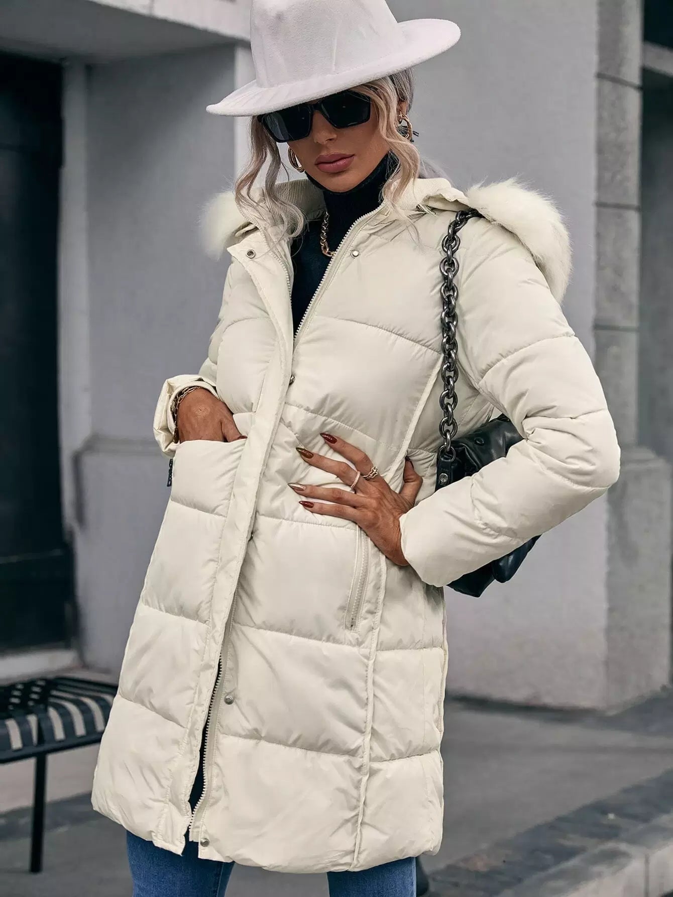 Fuzzy Trim Hooded Zipper Puffer Coat