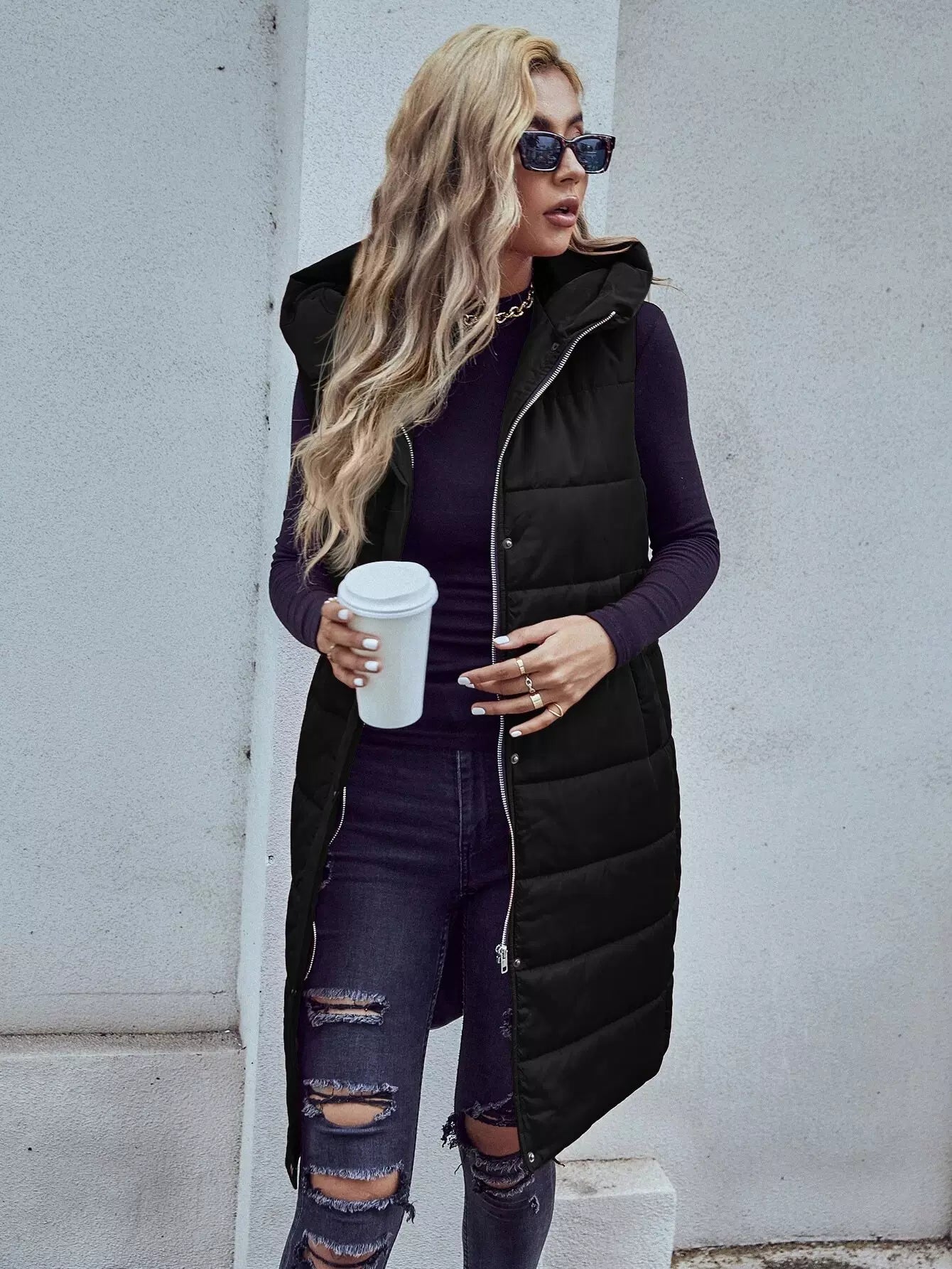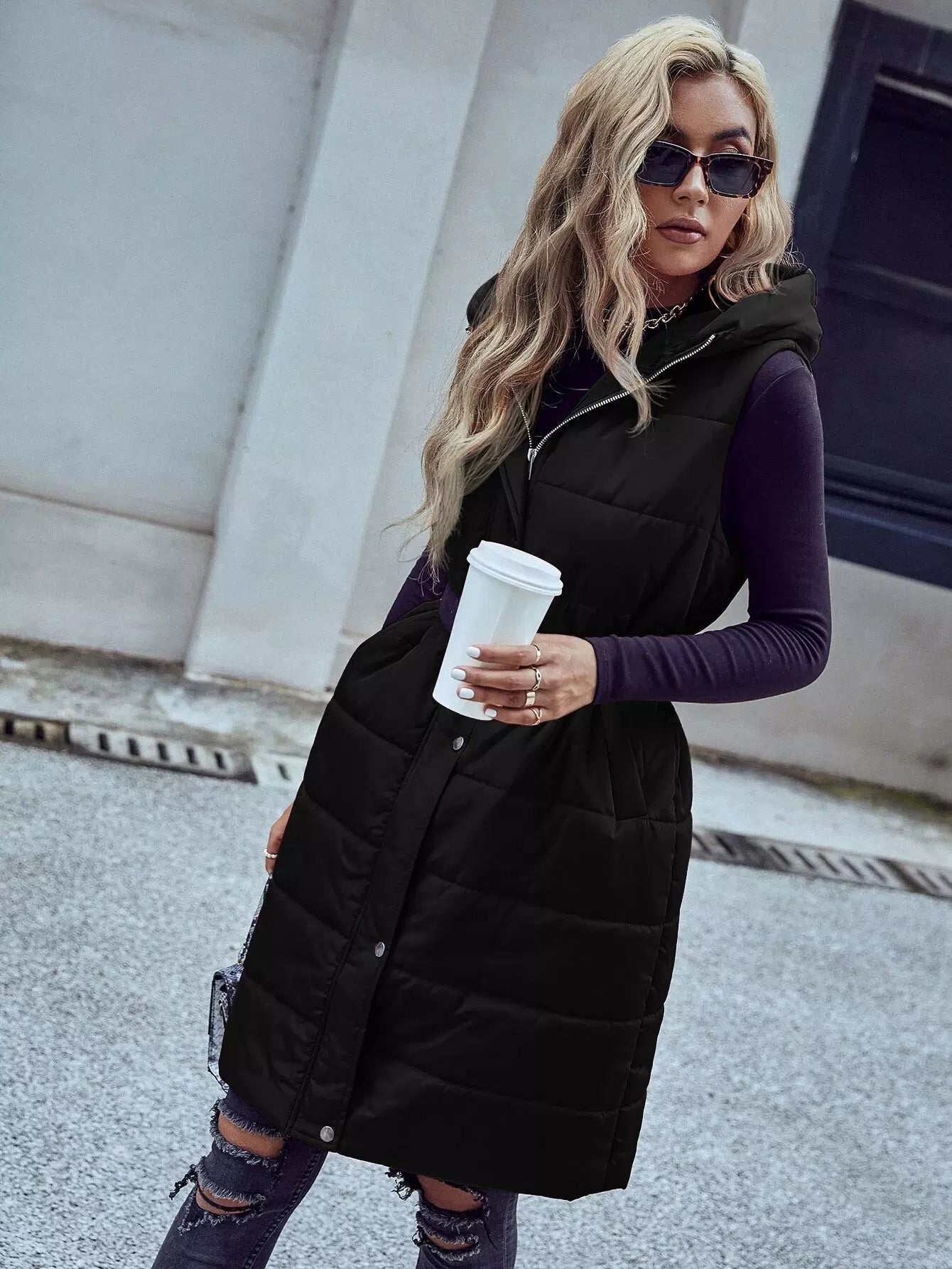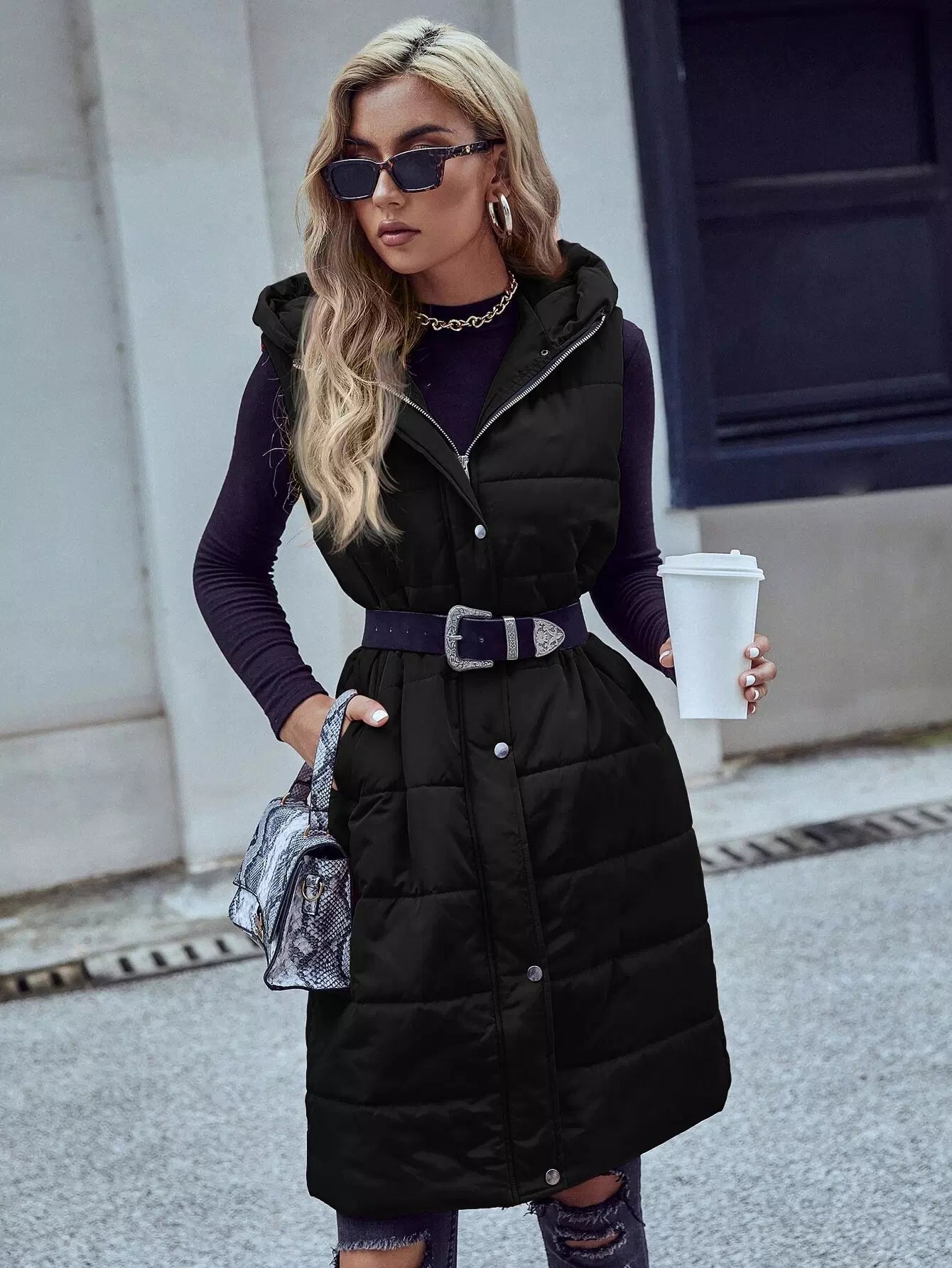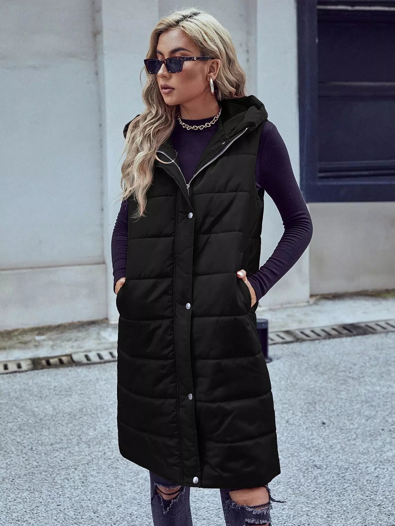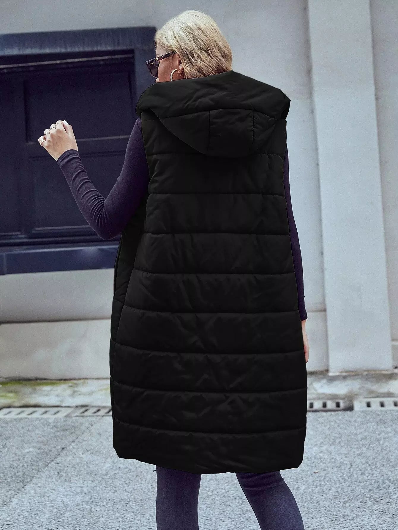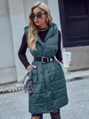 Slant Pocket Zipper Hooded Vest Puffer Coat Without Belt