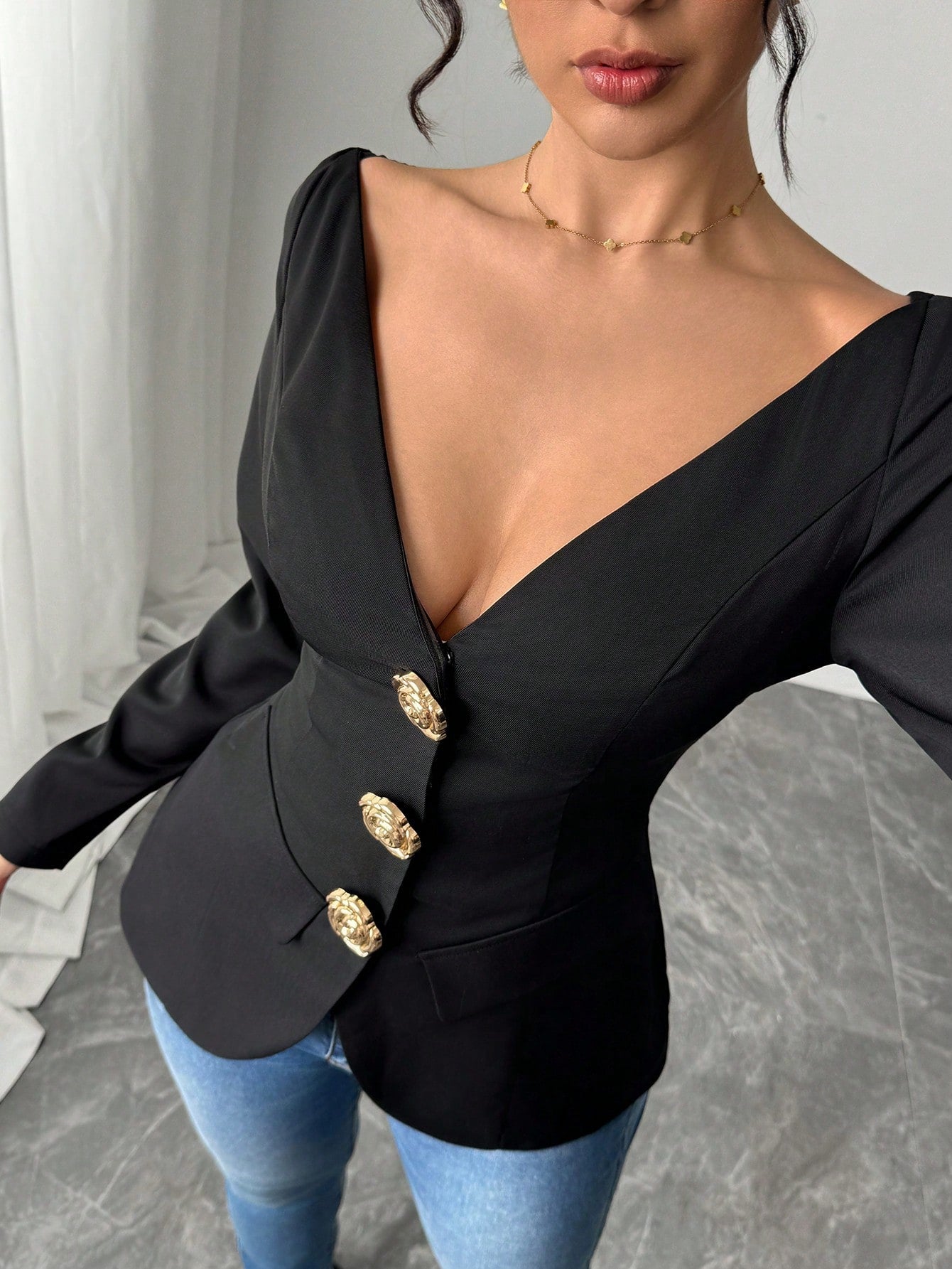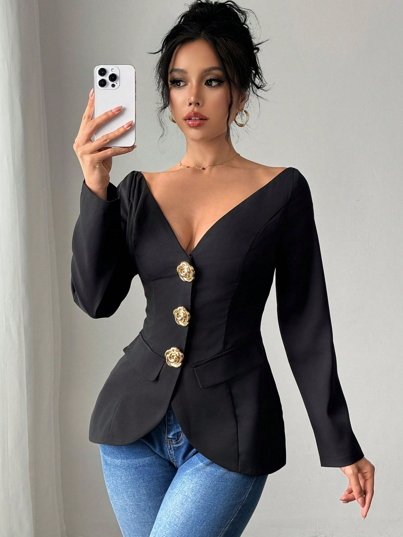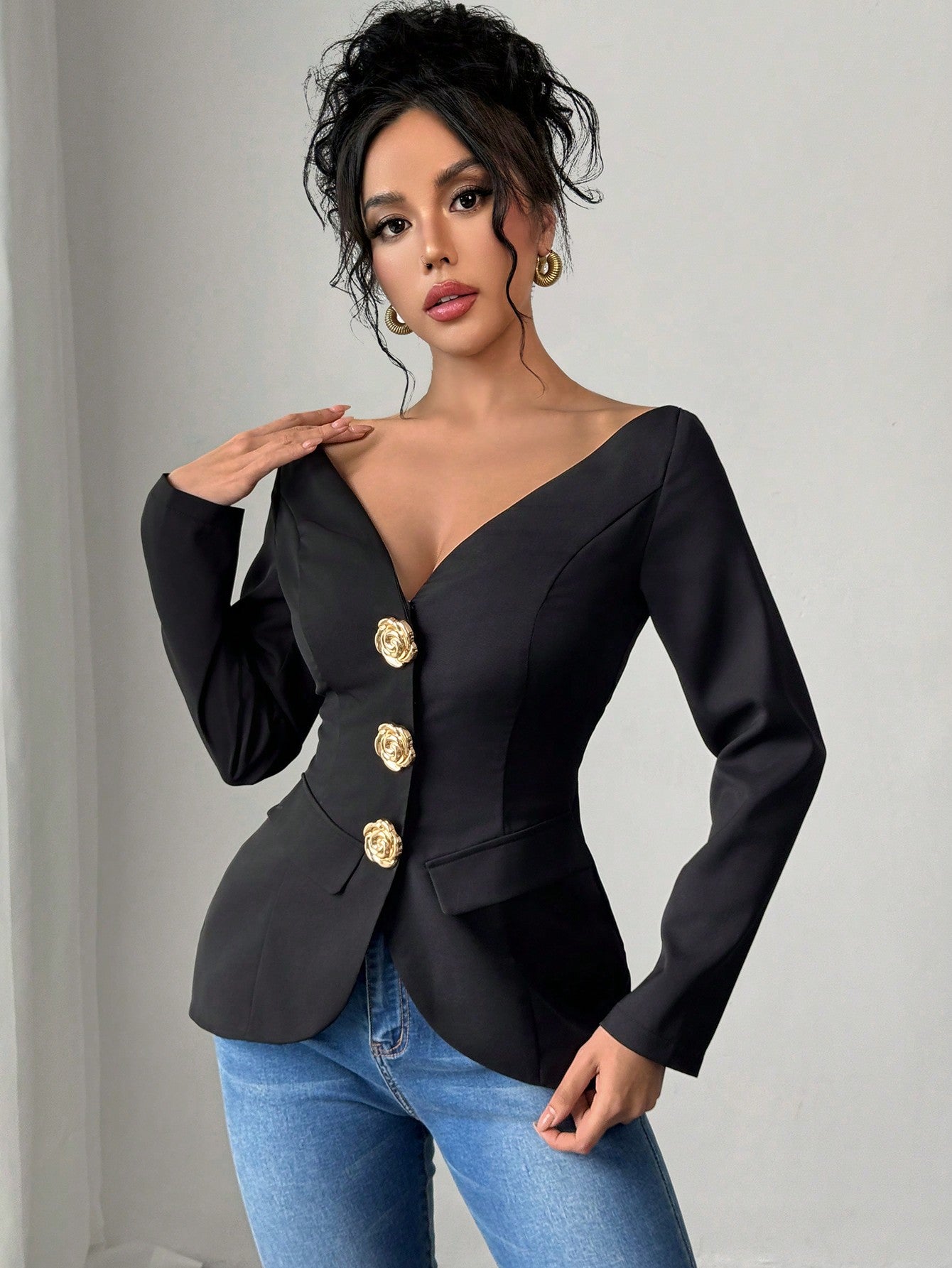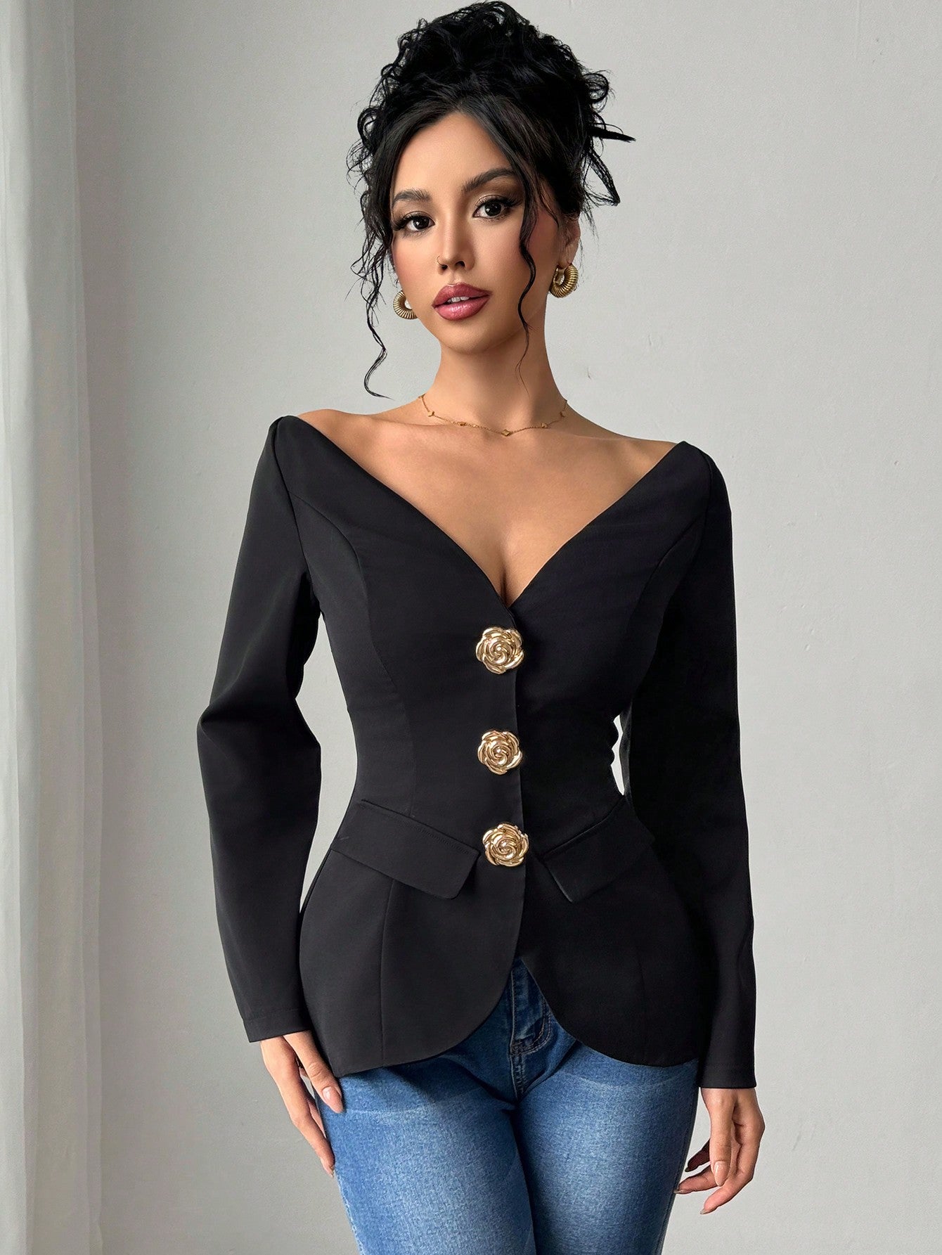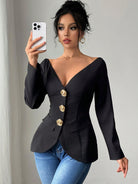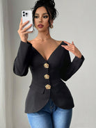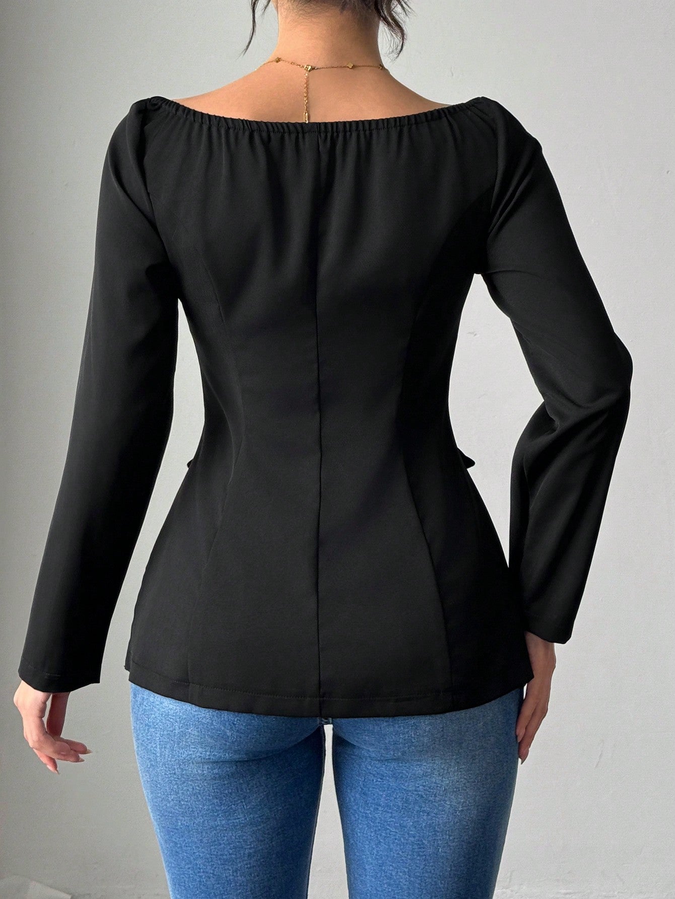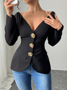 Firerie Spring New Elegant Fashion Off Shoulder Metal Buckle Slim Fit Long Sleeve Black Cinched Waist
