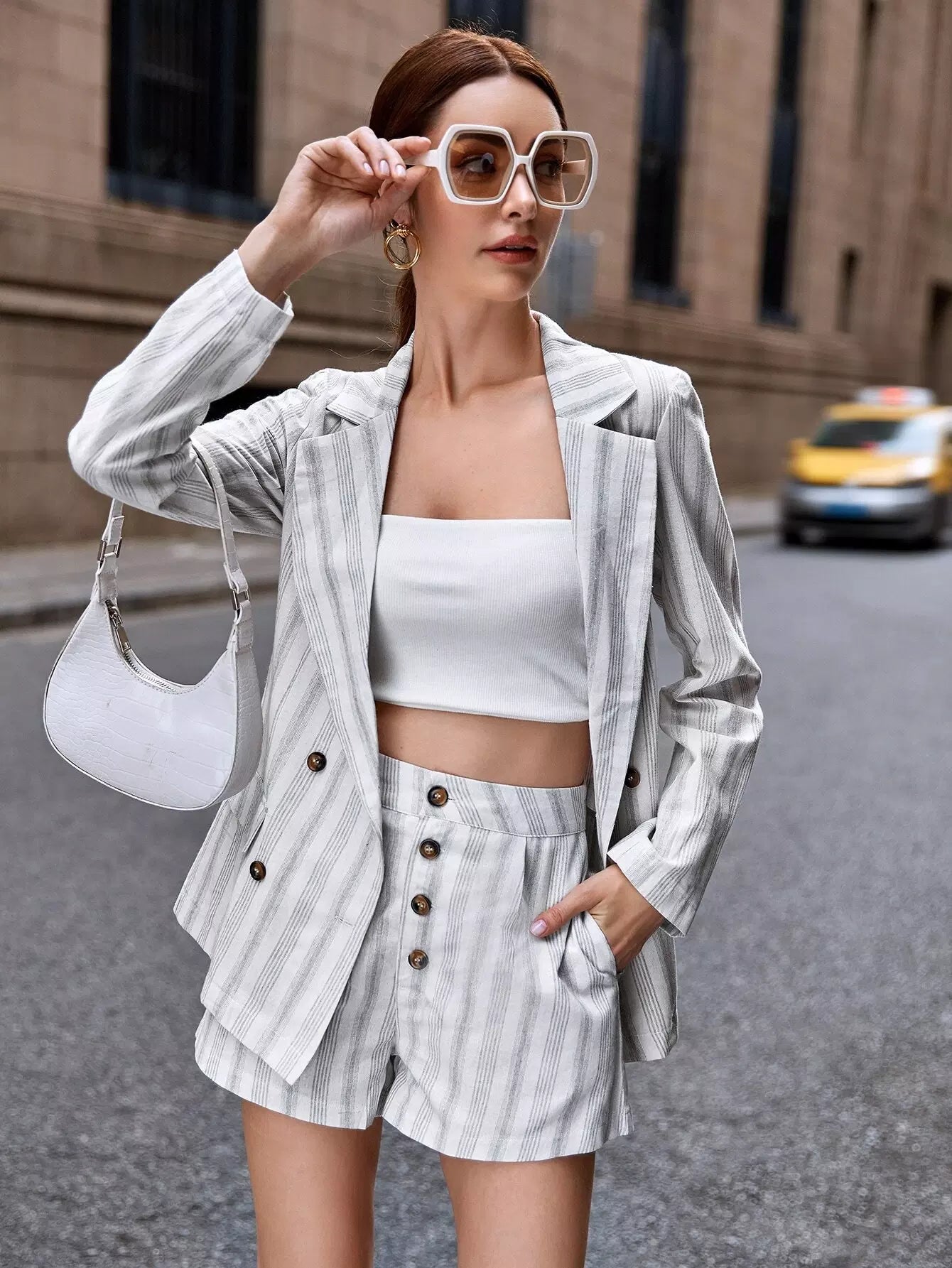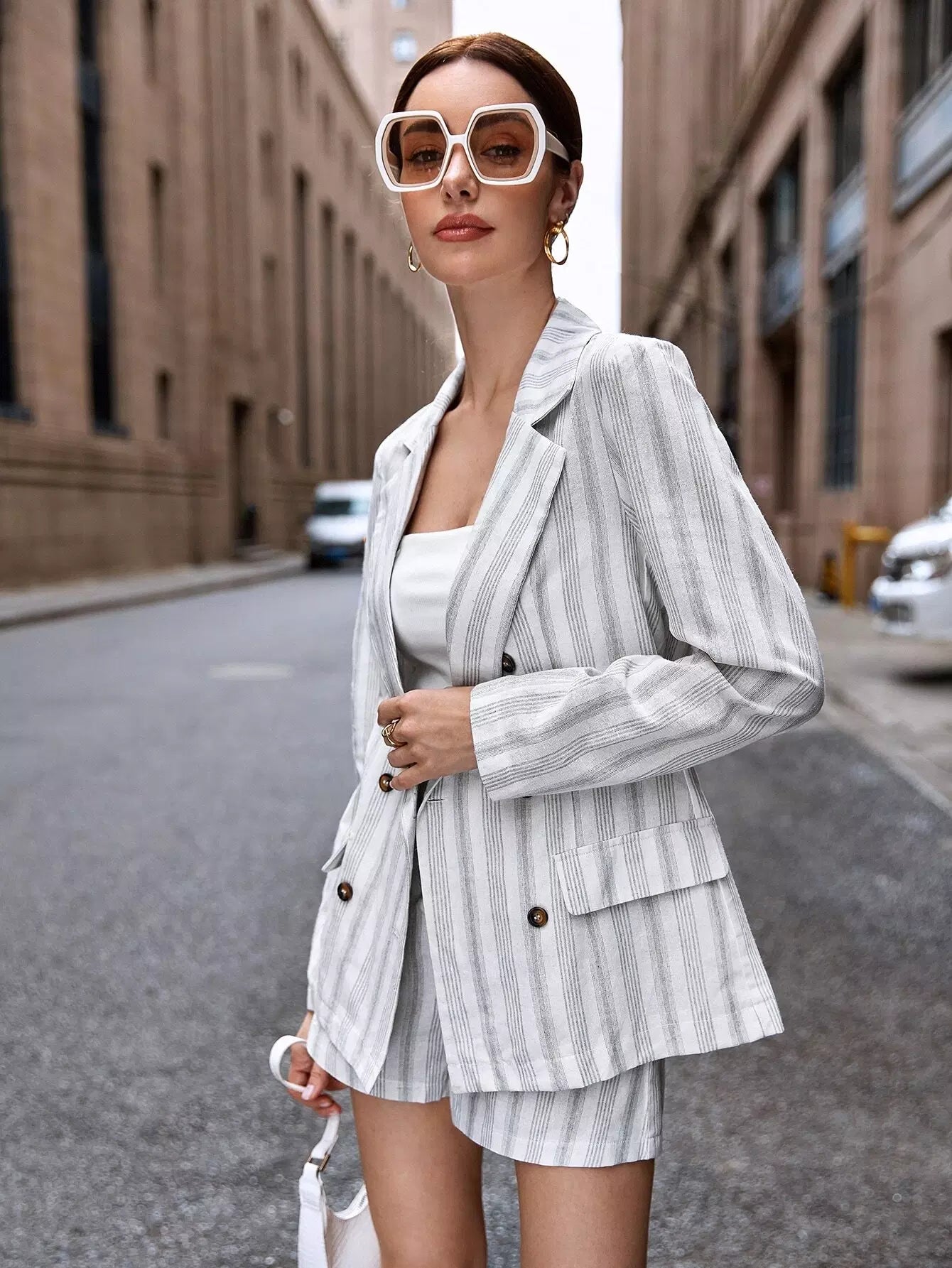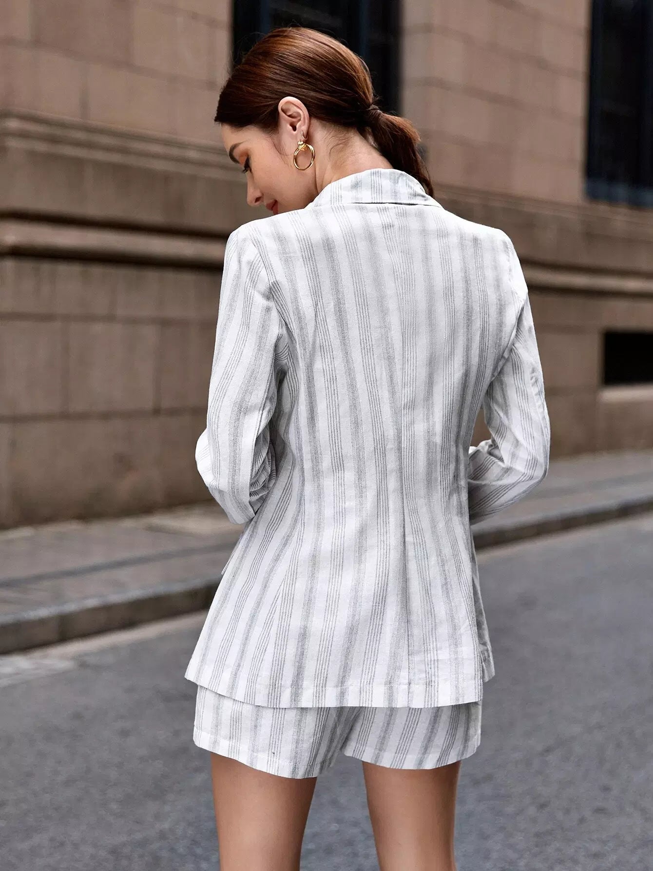 Striped Print Double Button Blazer & Shorts Set