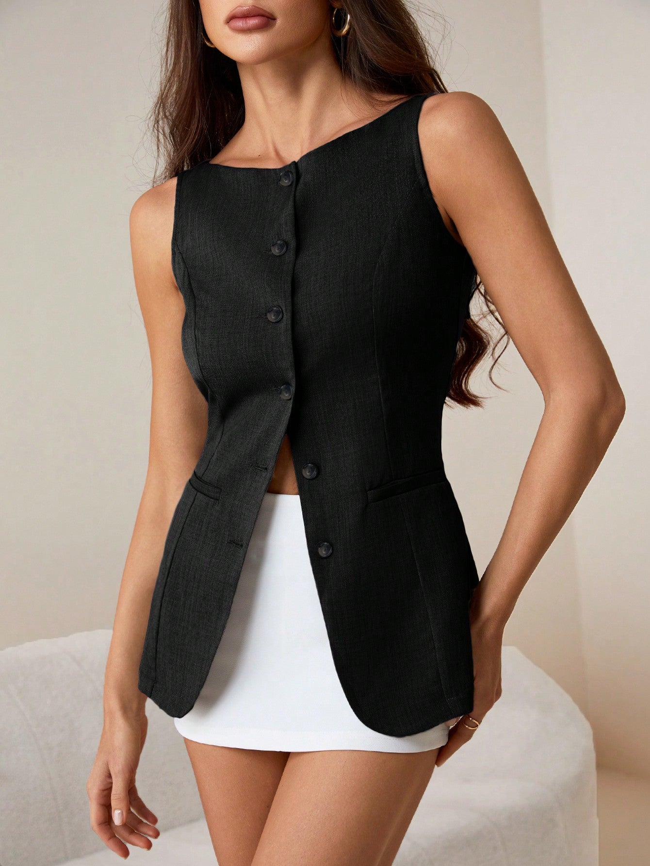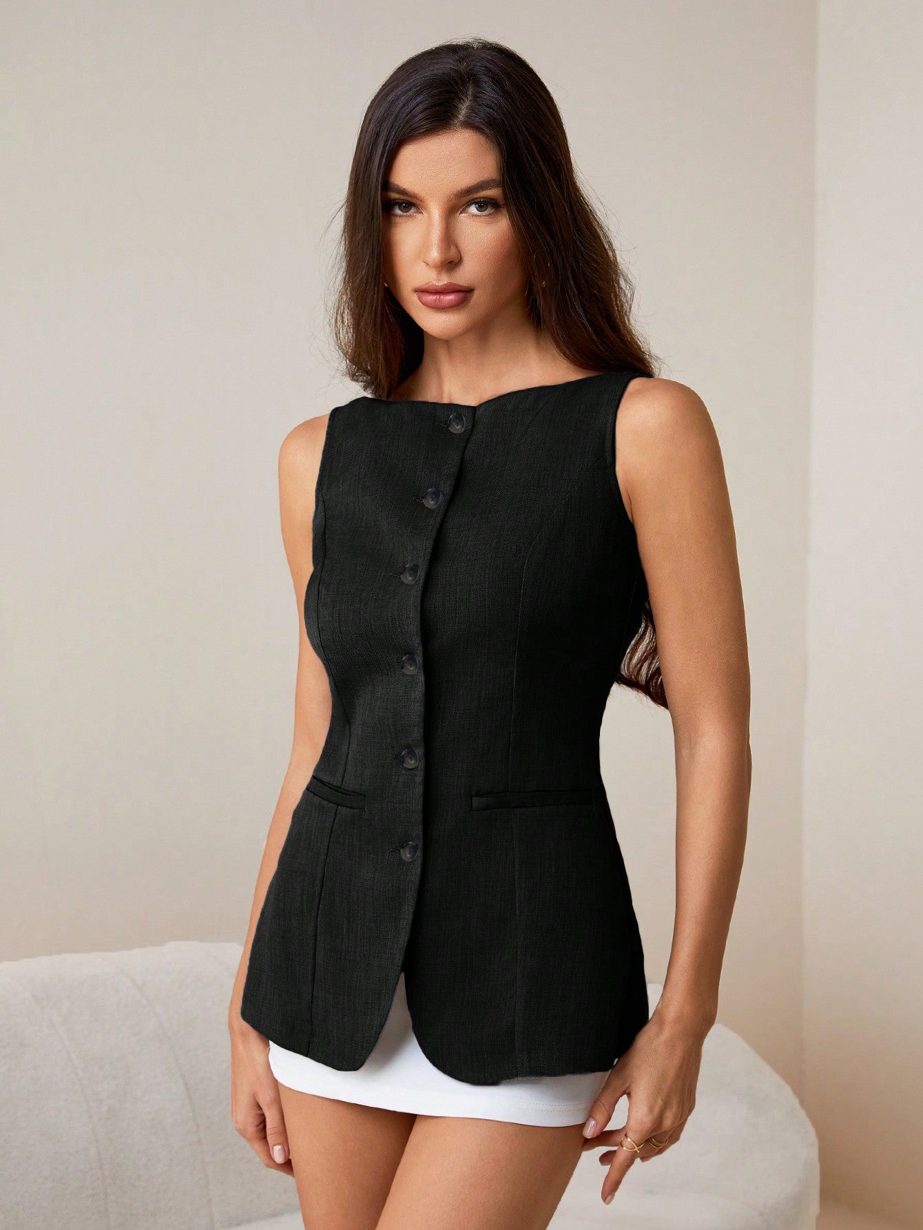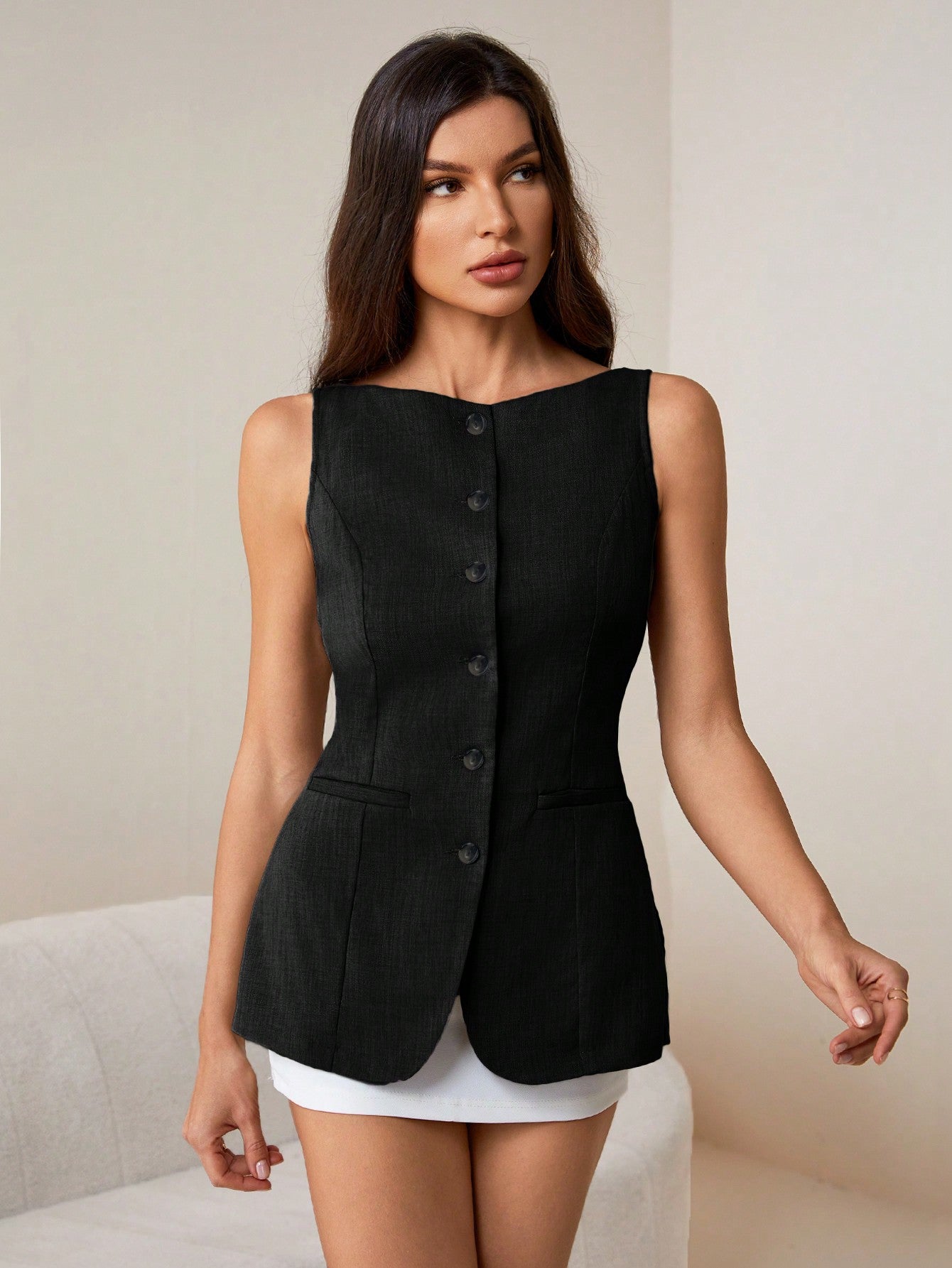 Tall Women's Commuting Fake Pockets Decorated Boat Neck Khaki Suit Vest Open Placket Blazer In