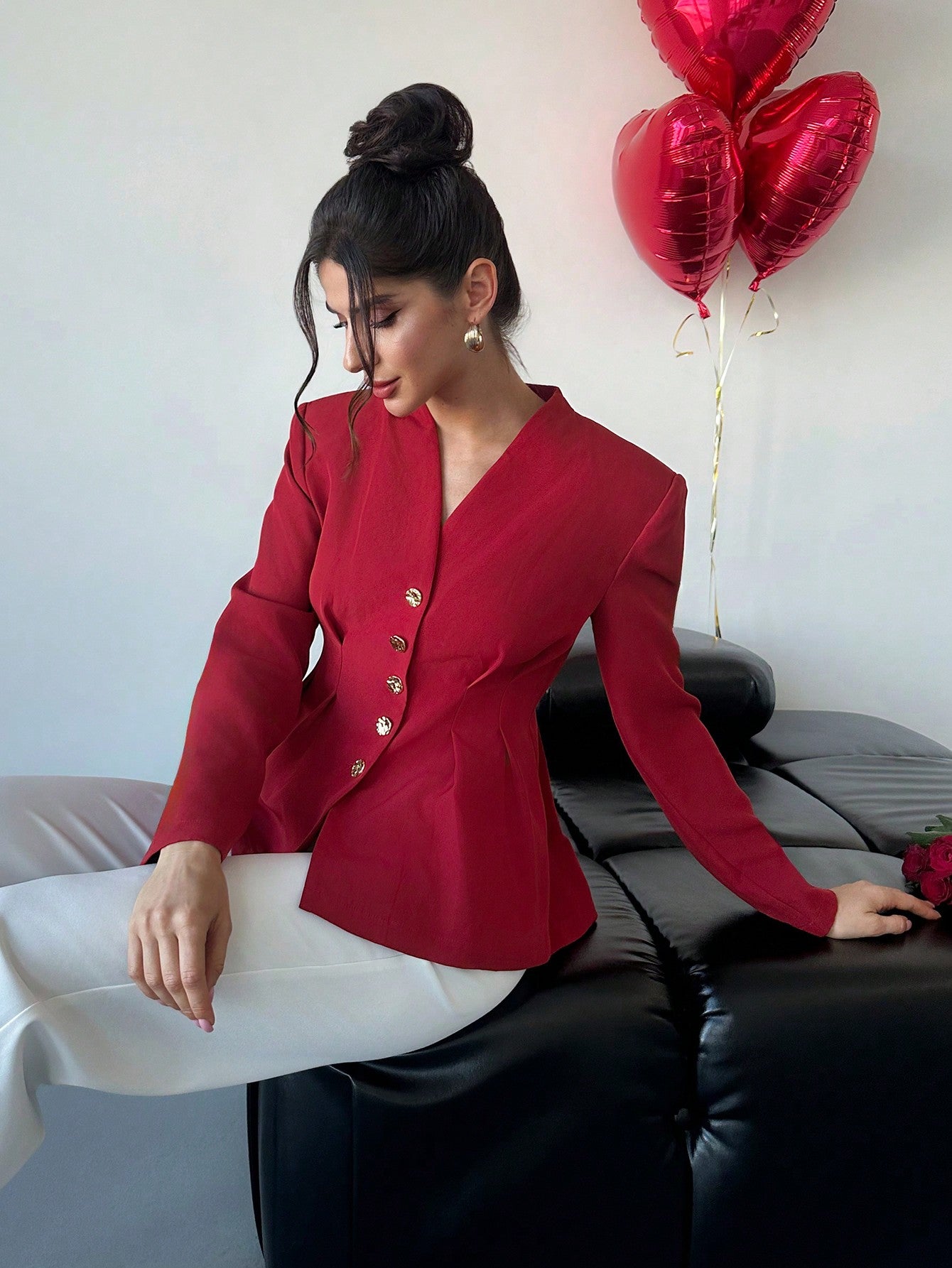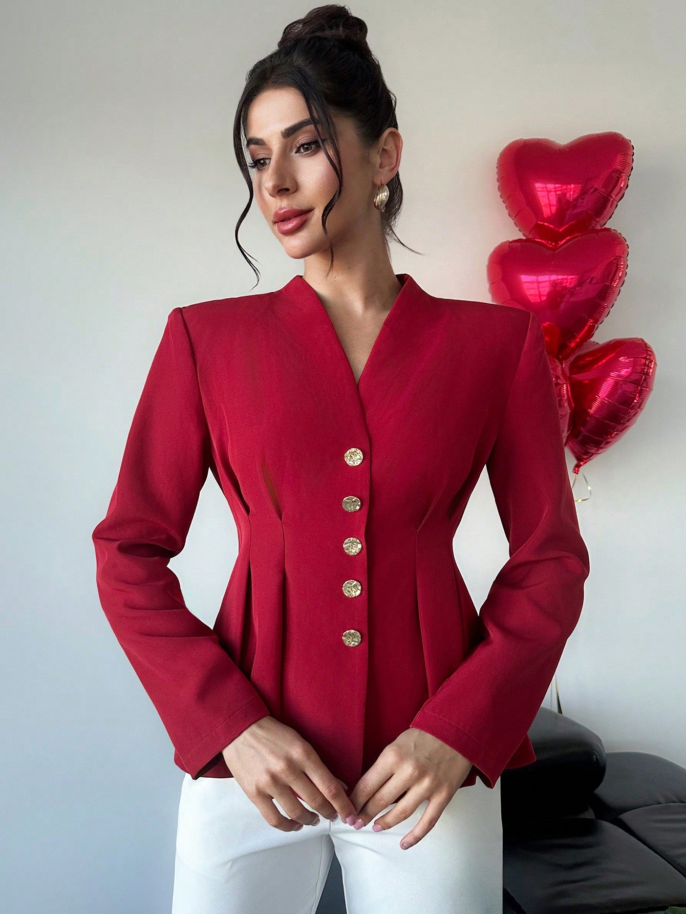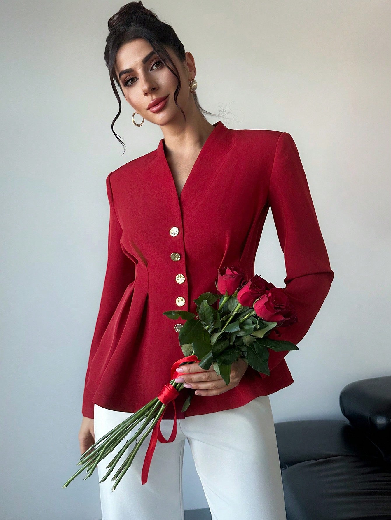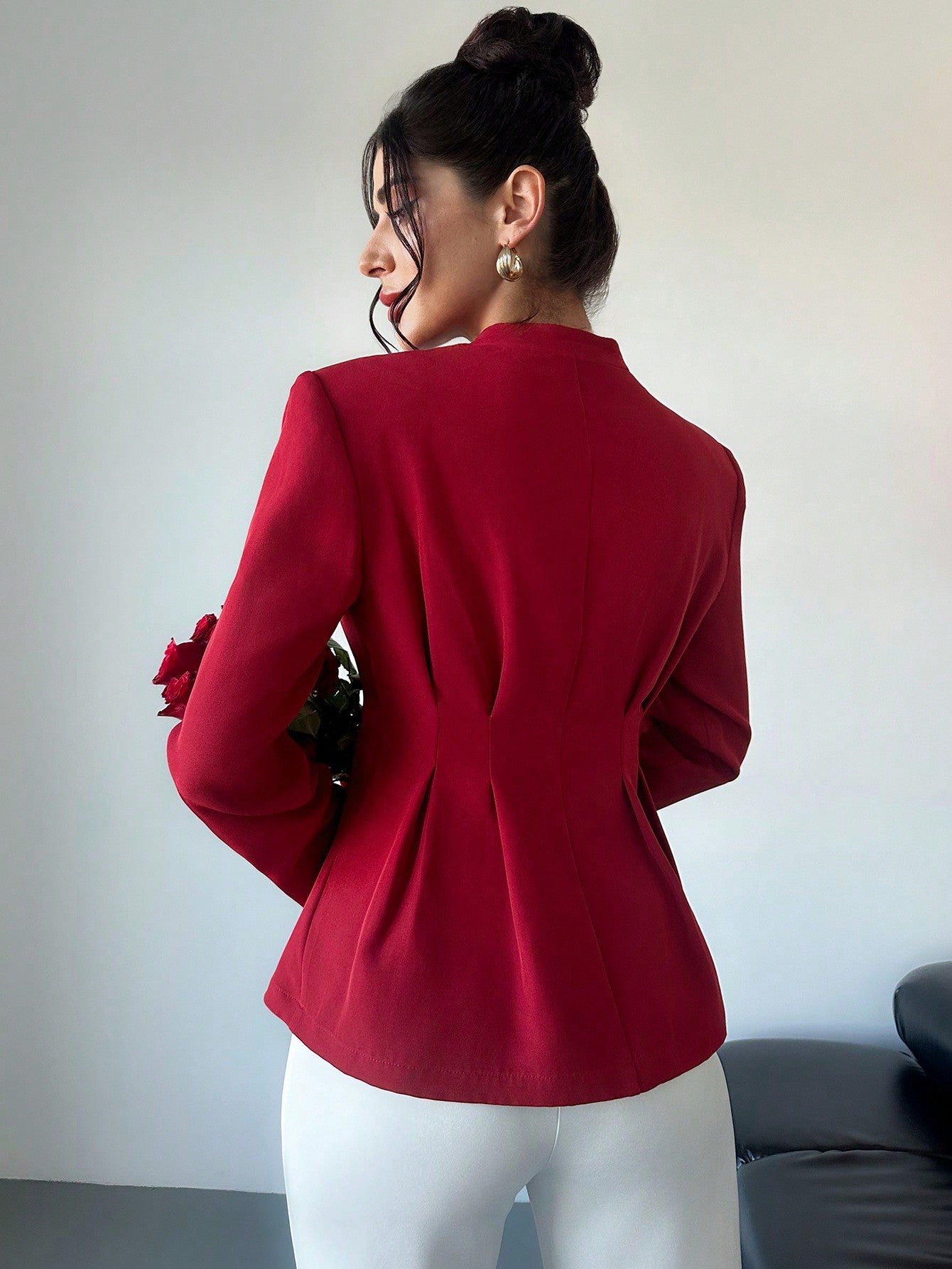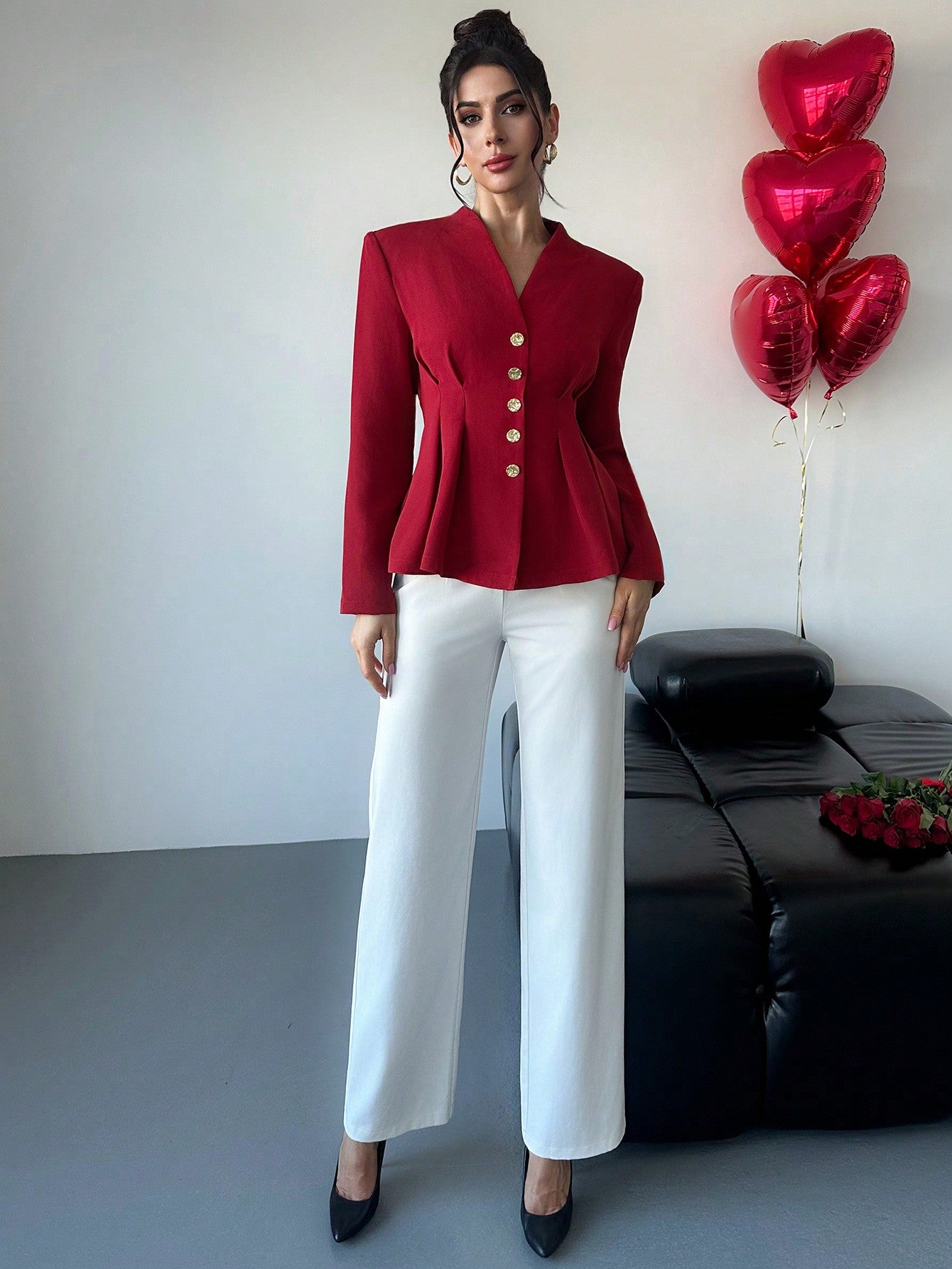 Privï½ Women's Elegant Red Padded Shoulder Pleated Cinched Waist Blazer Jacket ,Wine Red Waist Cinching