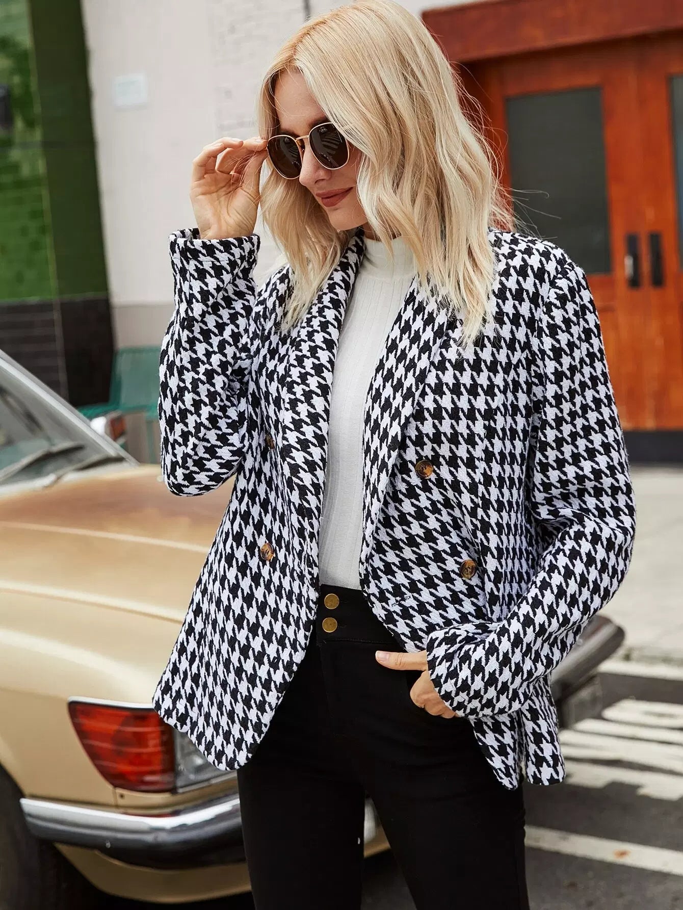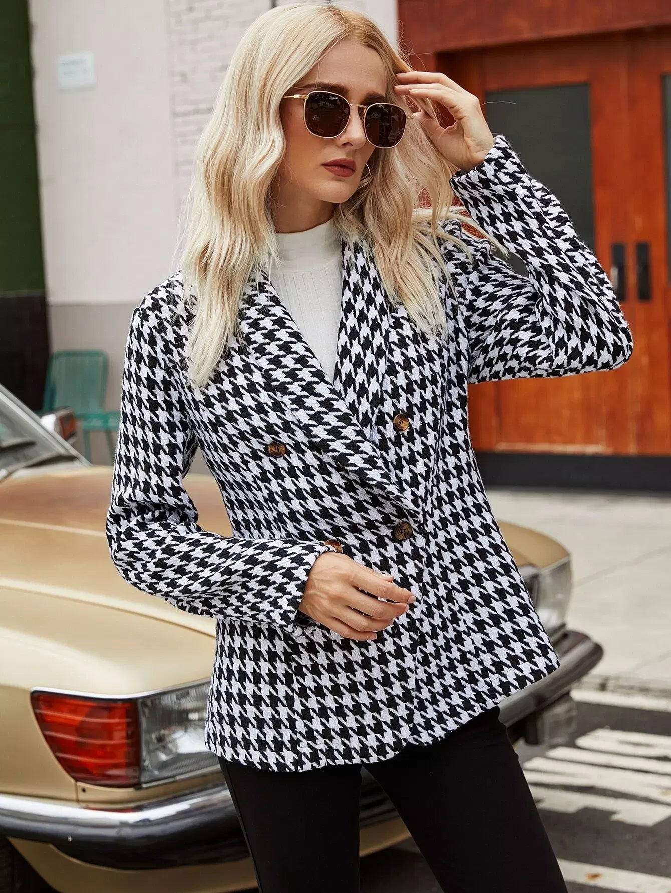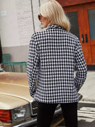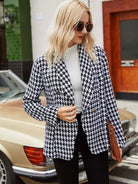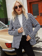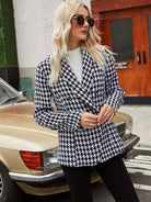 Shawl Neck Houndstooth Print Double Breasted Tweed Blazer