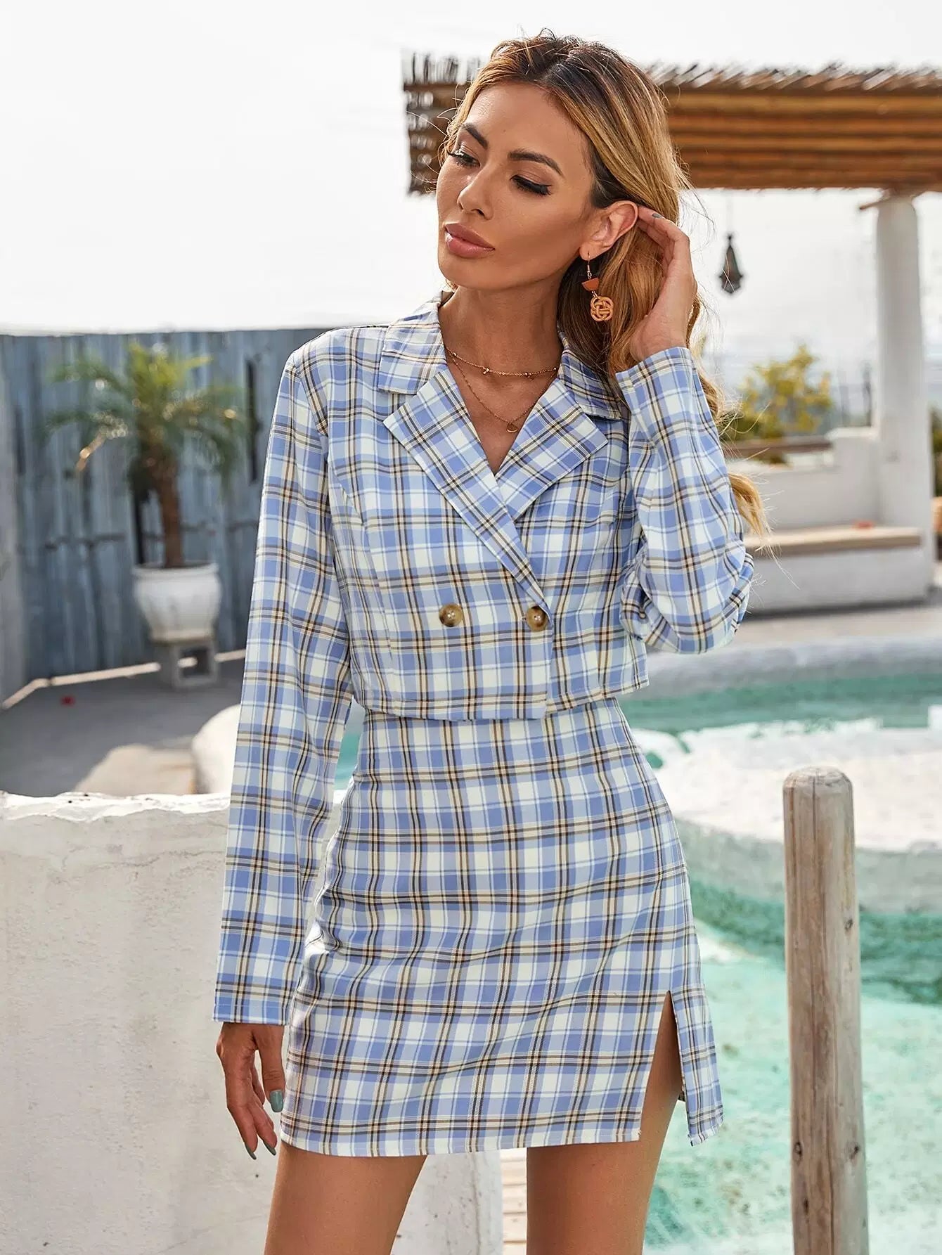 Plaid Double Breasted Blazer & Split Hem Skirt