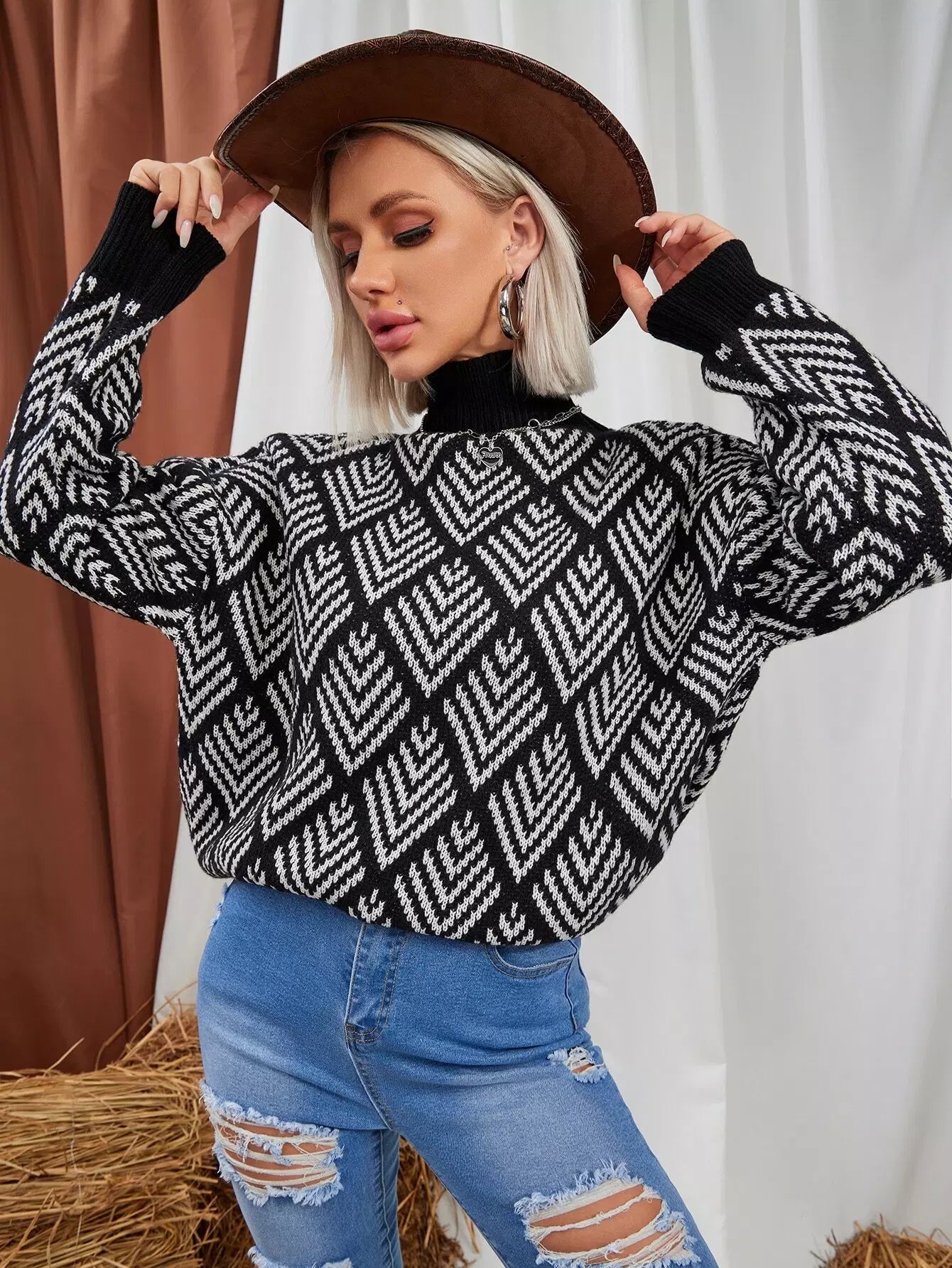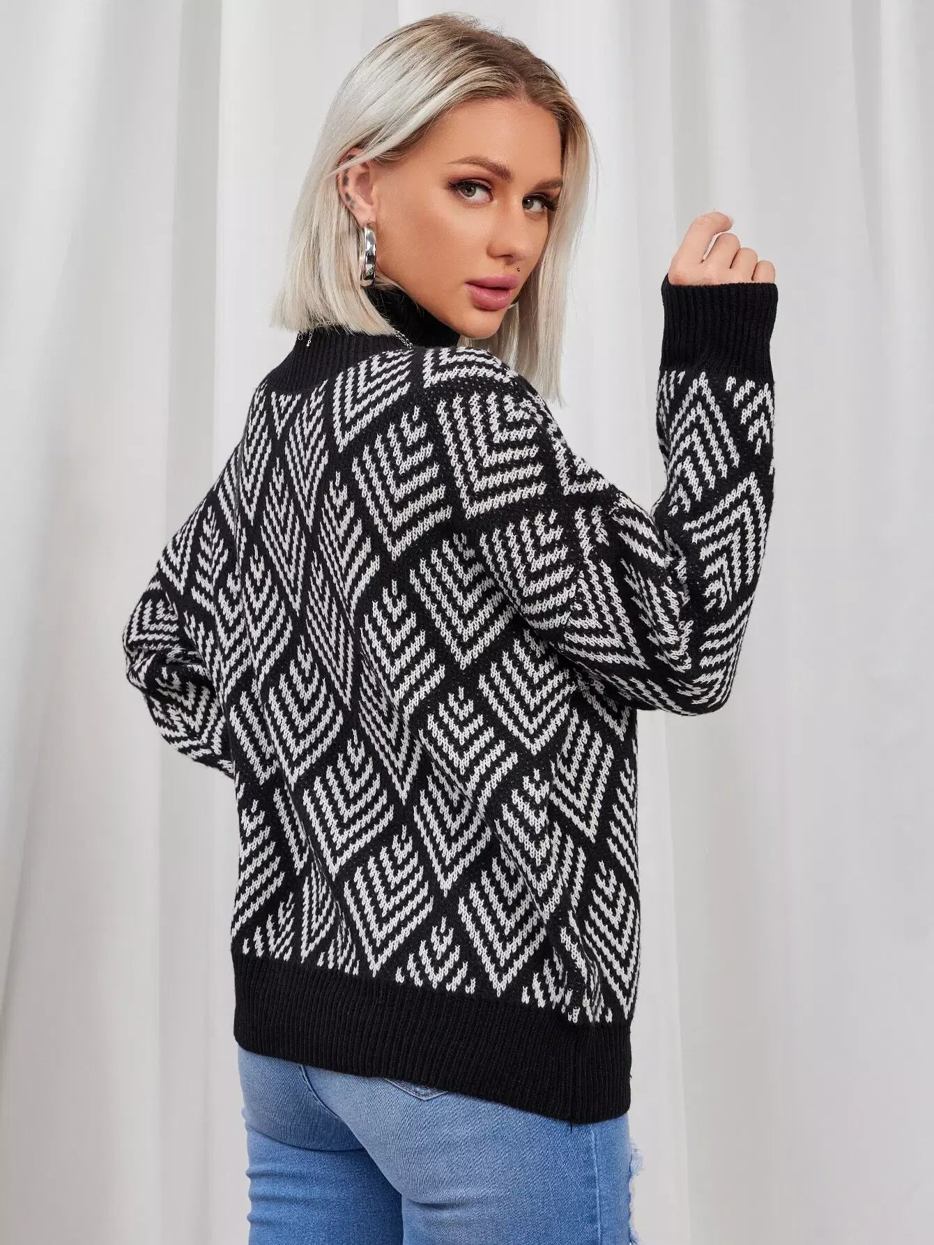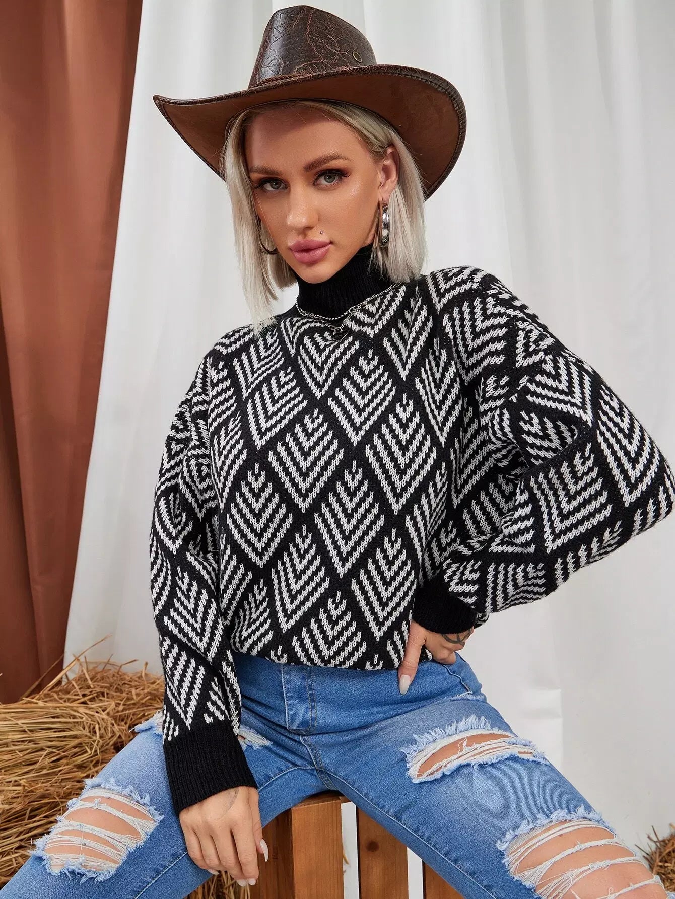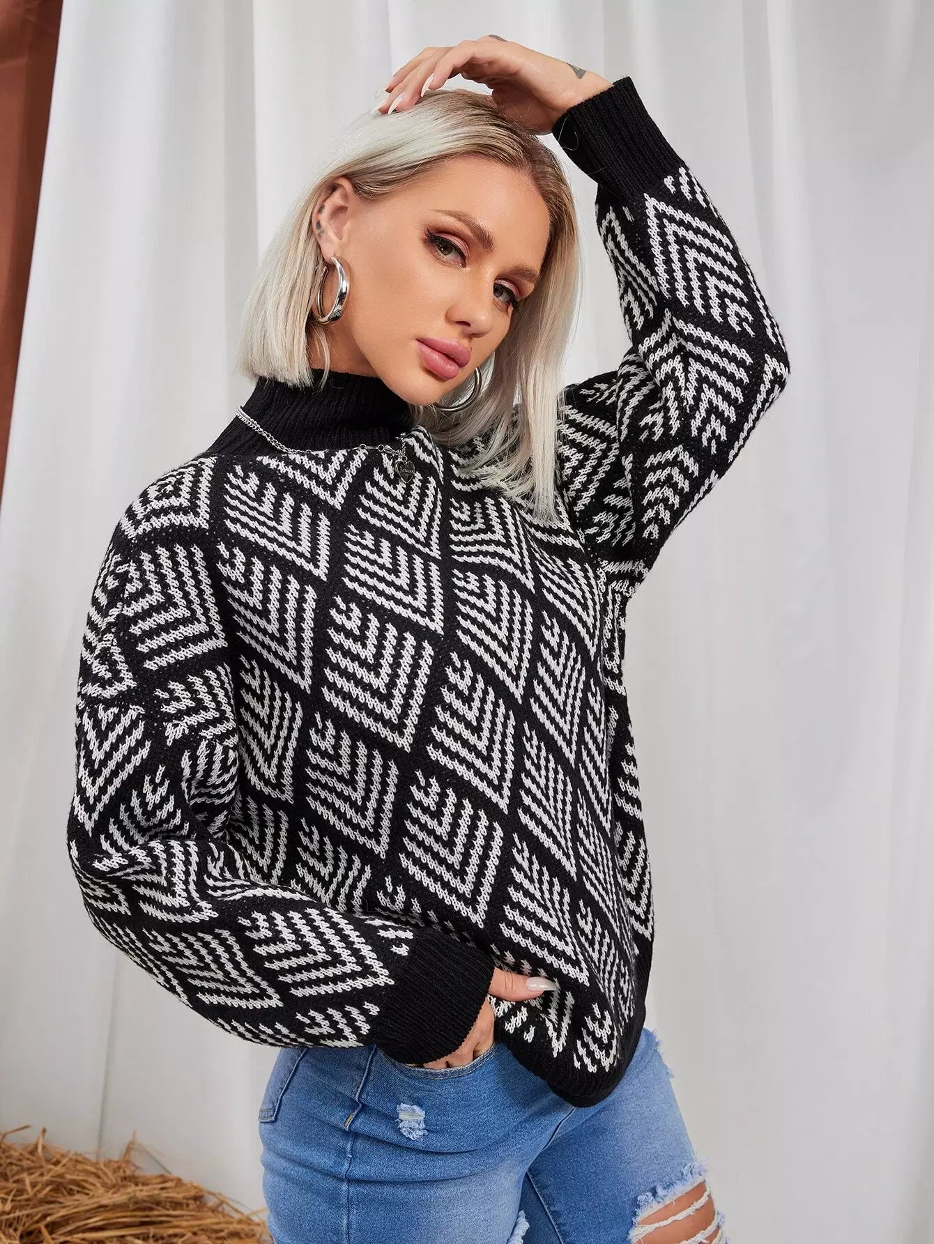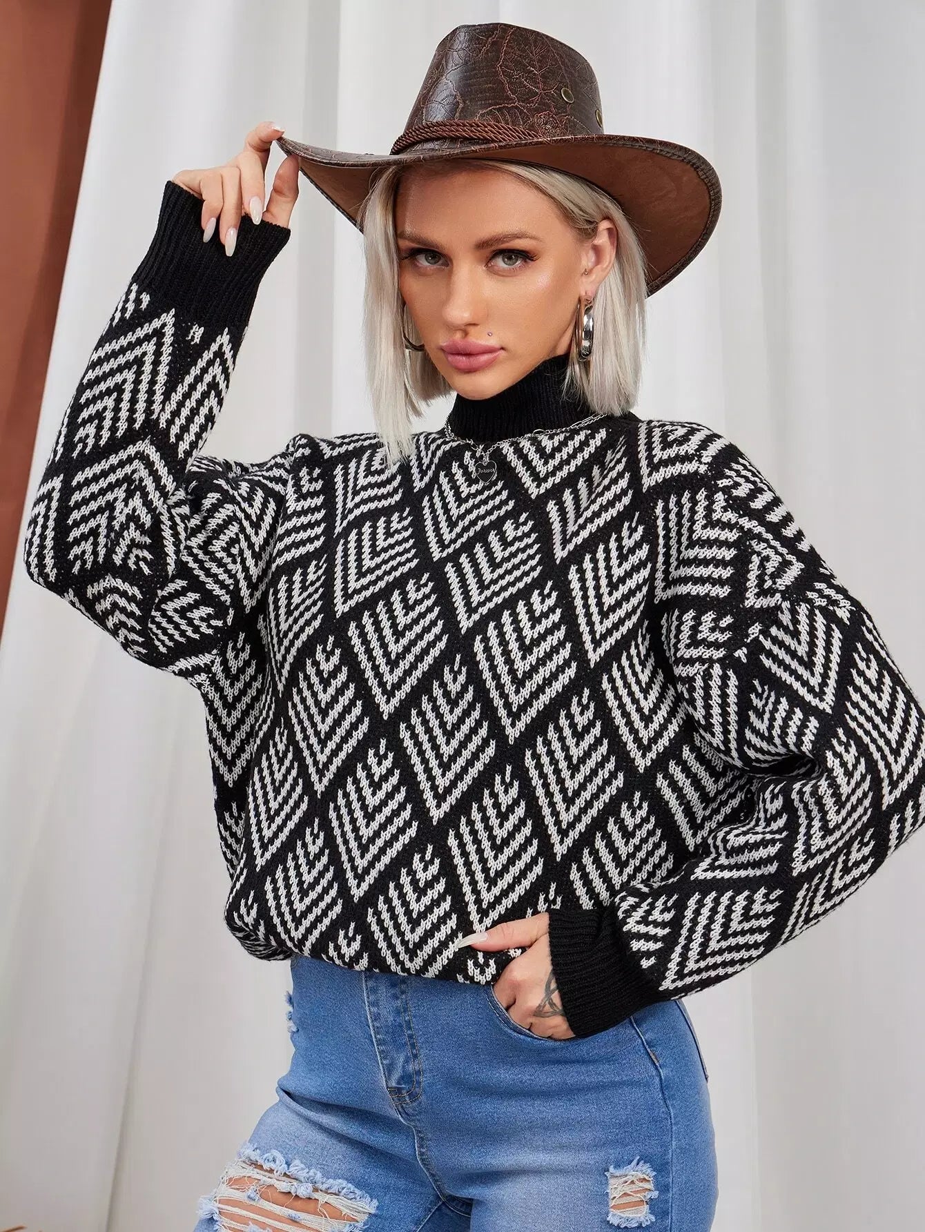 Women - Argyle Pattern High Neck Drop Shoulder Sweater