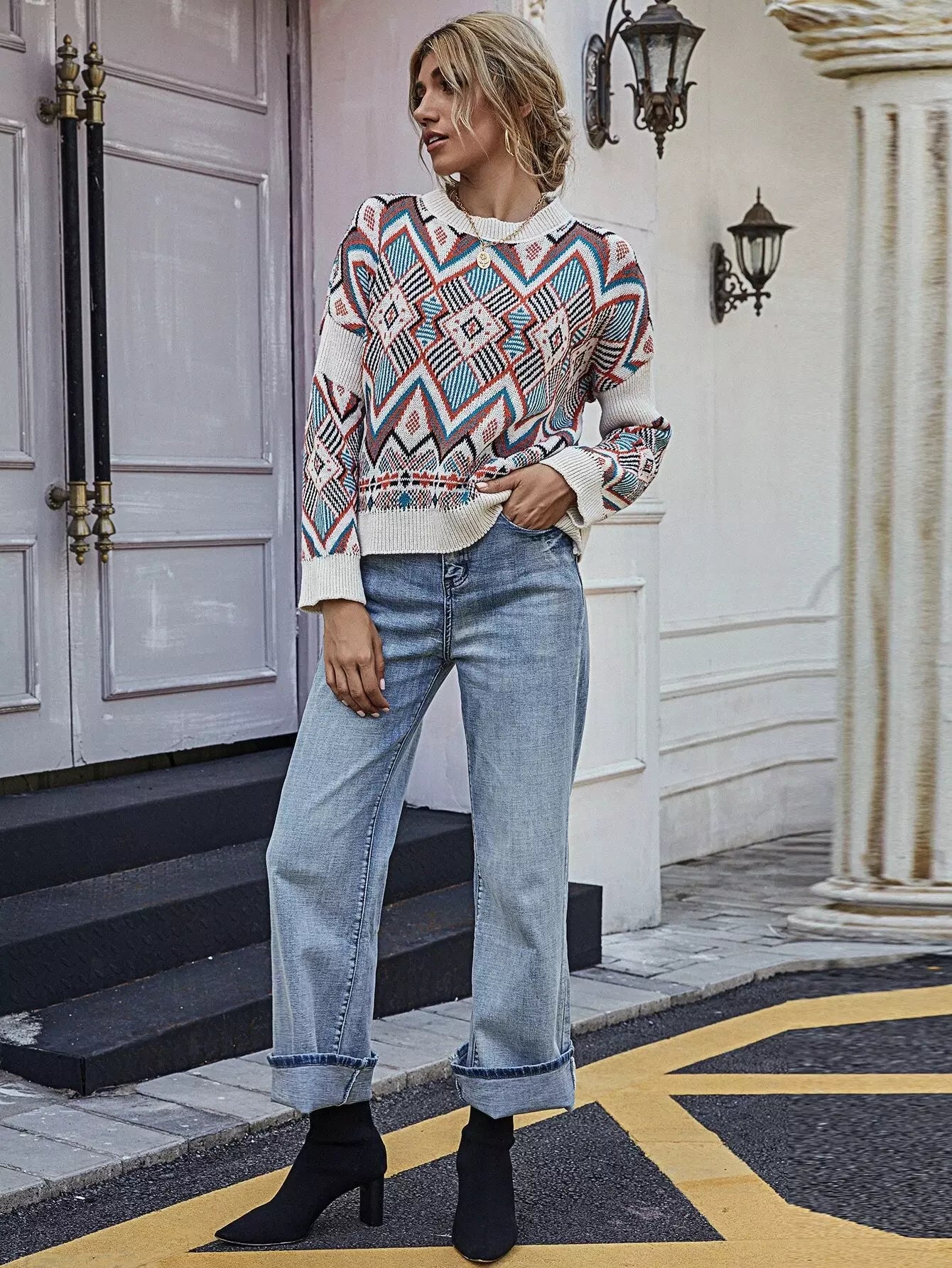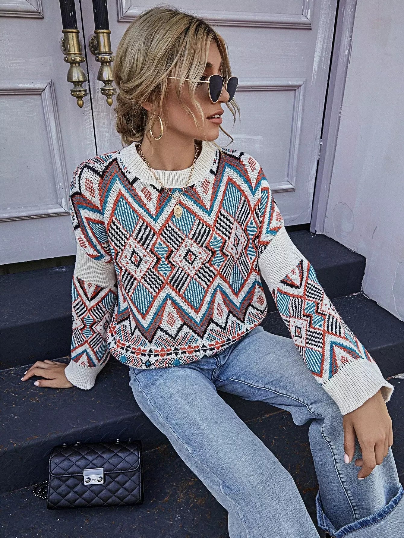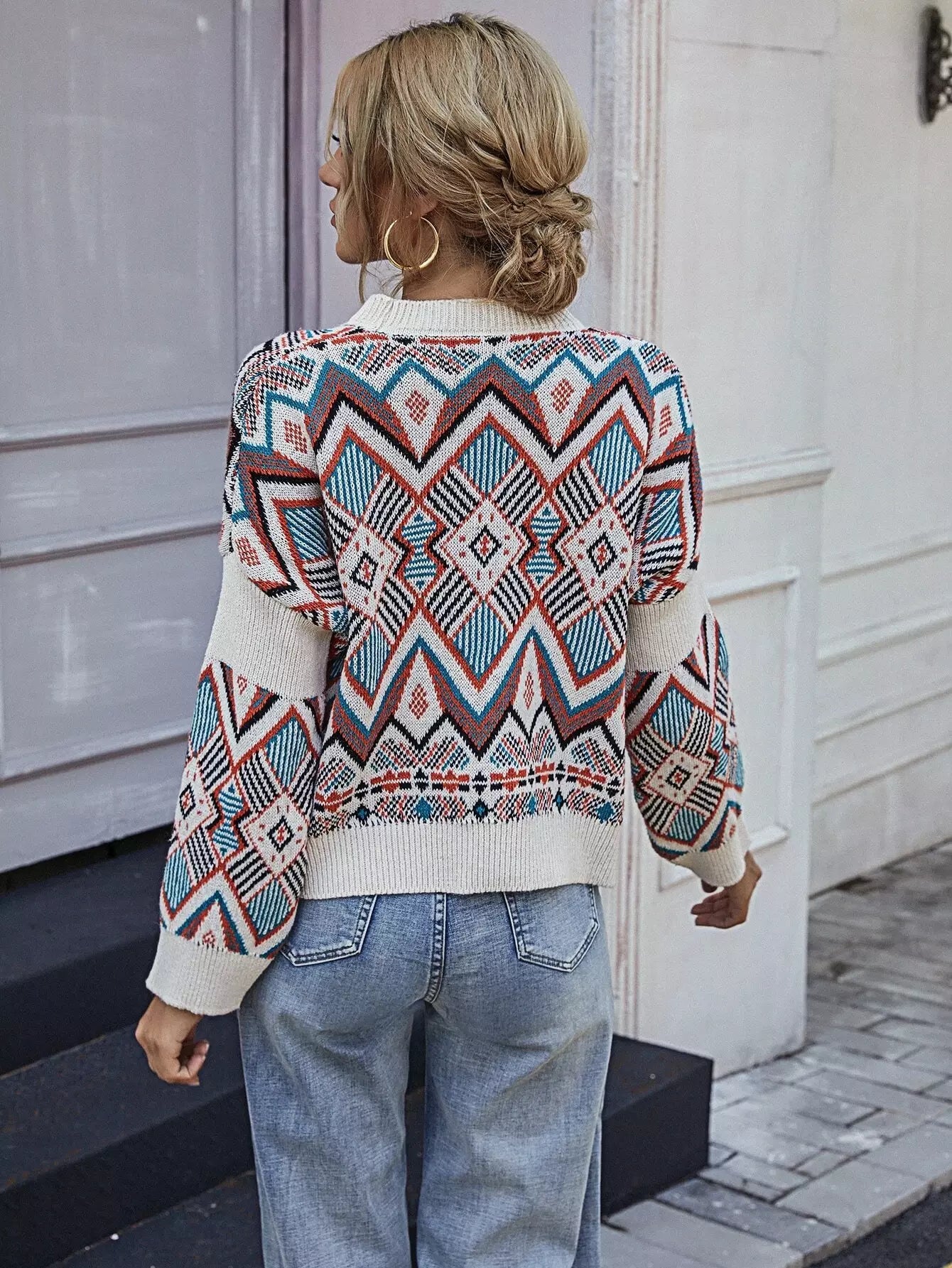 Argyle Pattern Rib-knit Mock Neck Sweater
