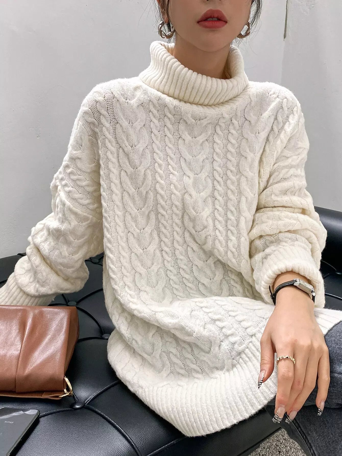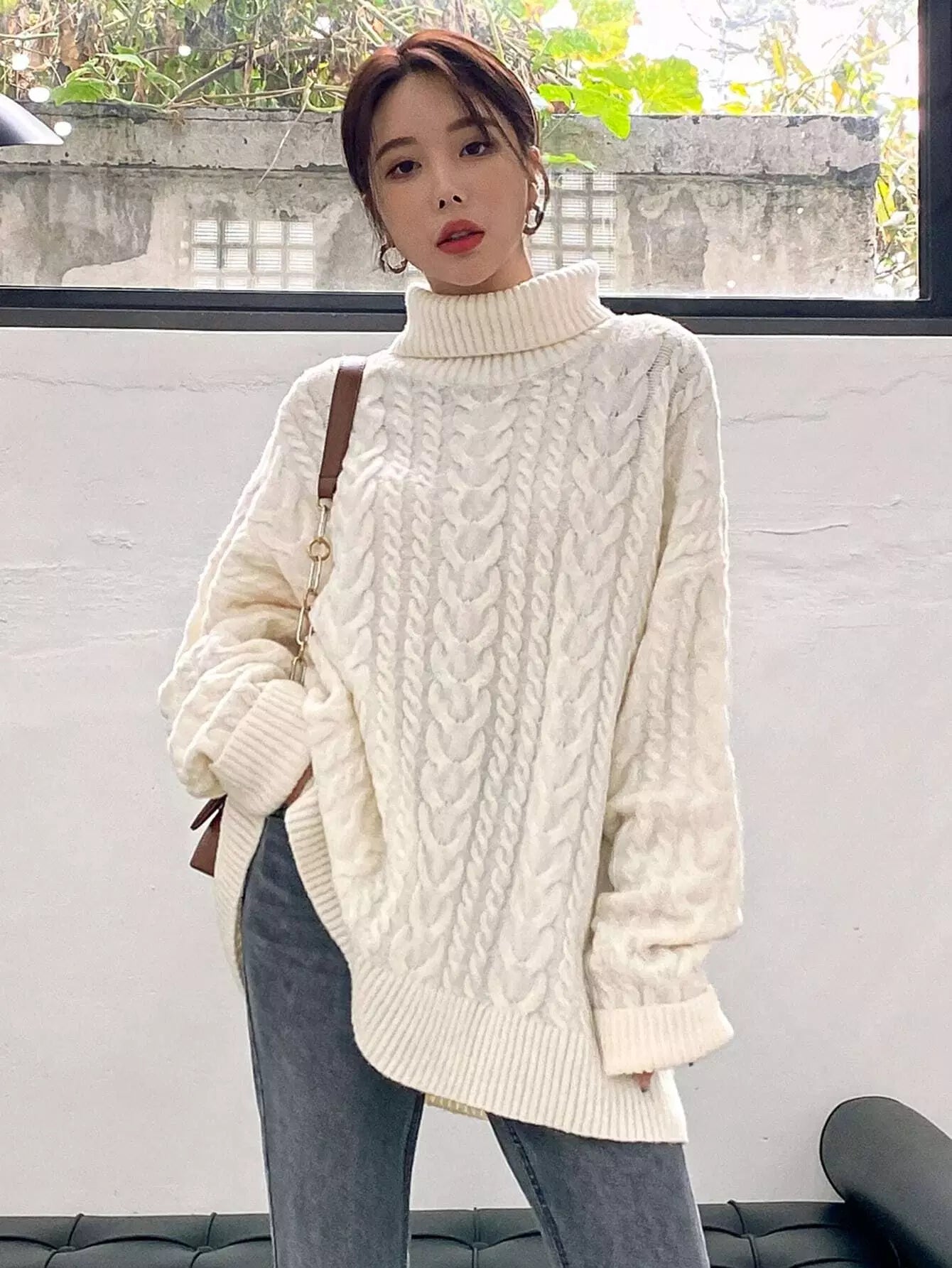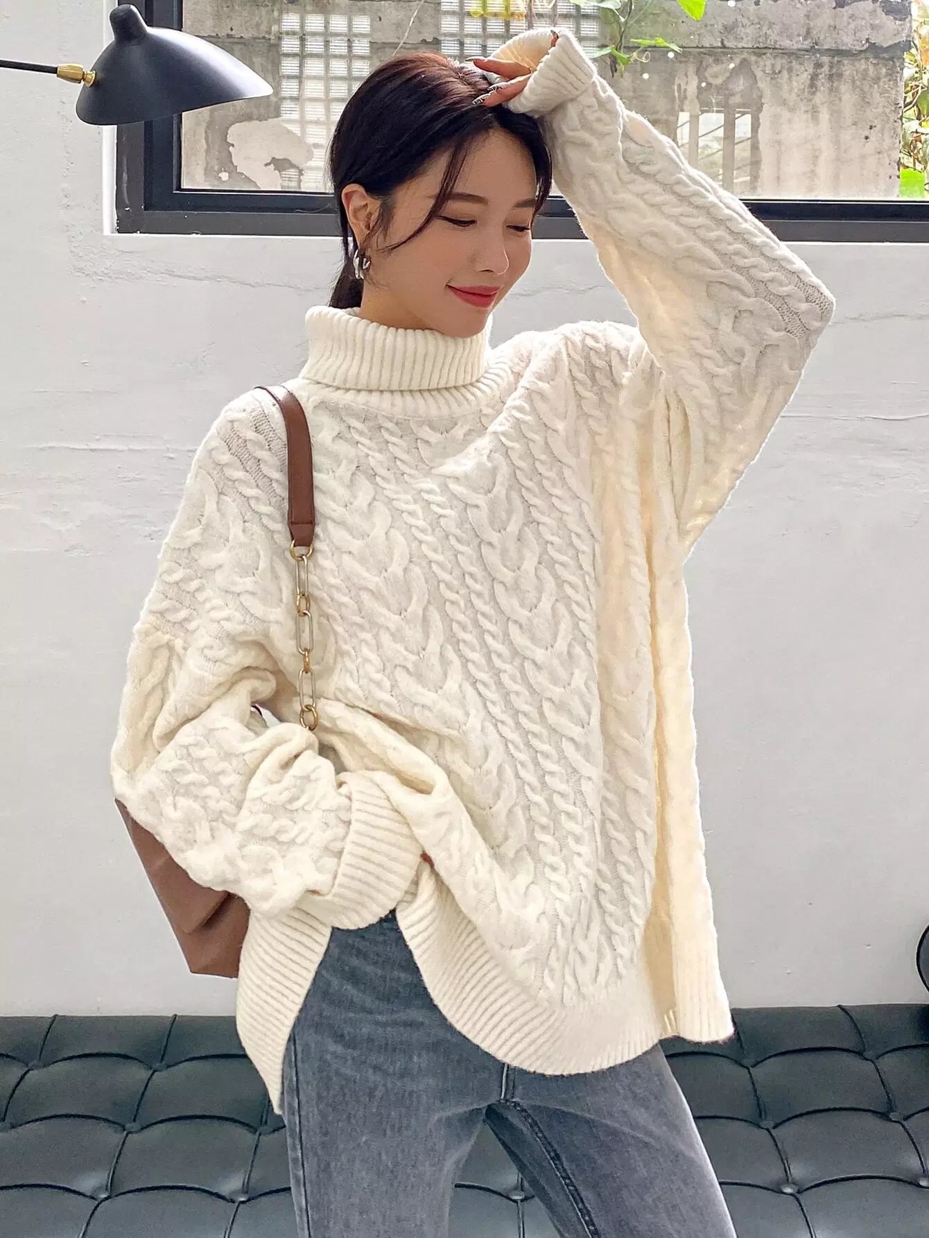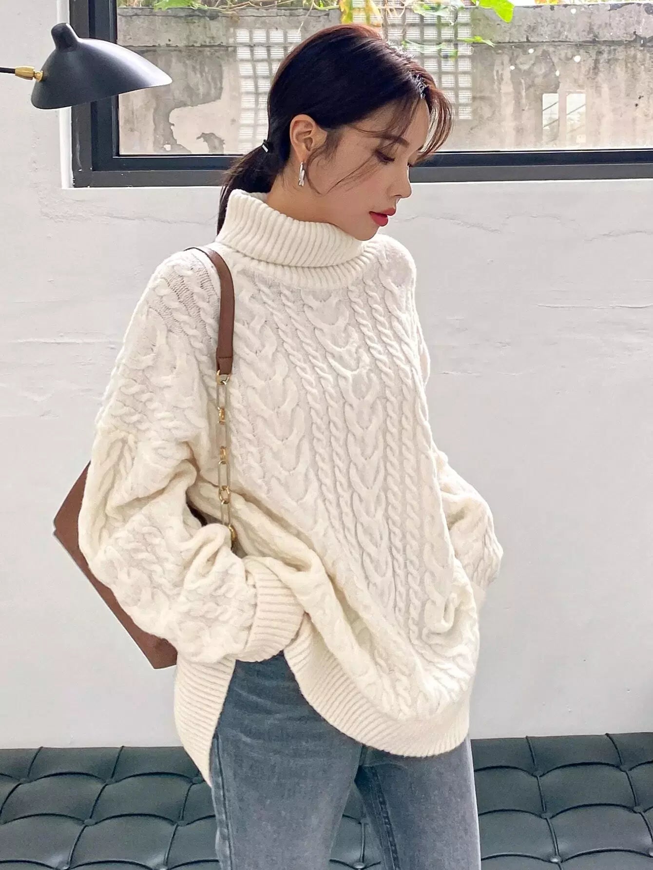 Cable Knit Turtleneck Drop Shoulder Sweater