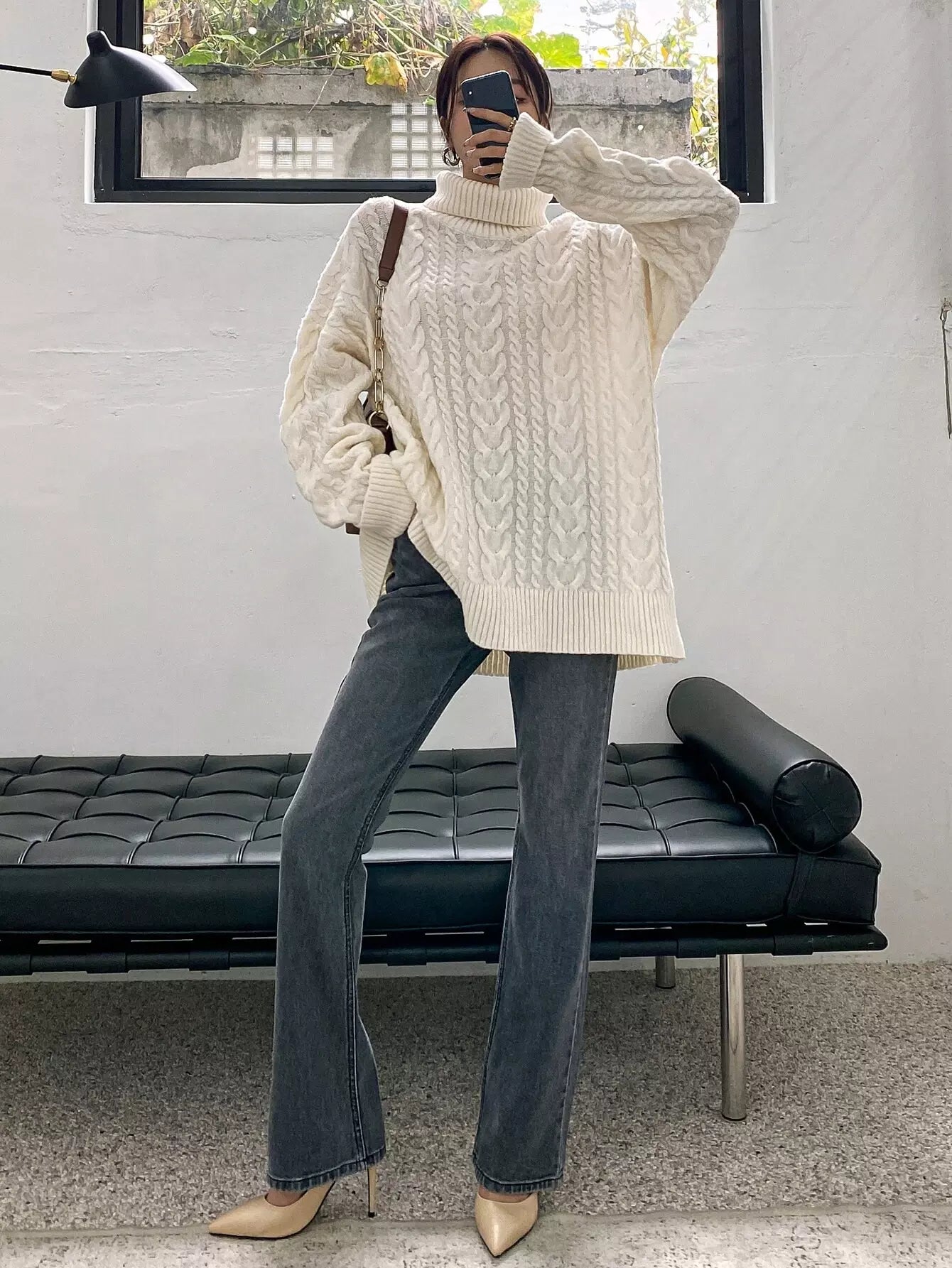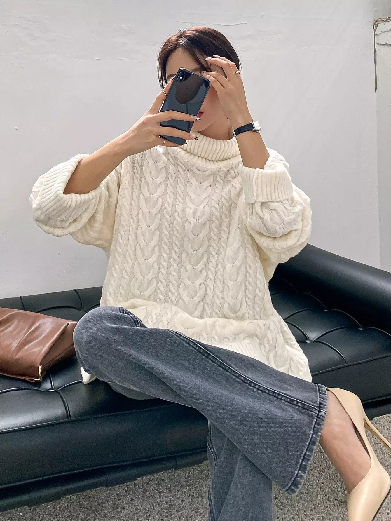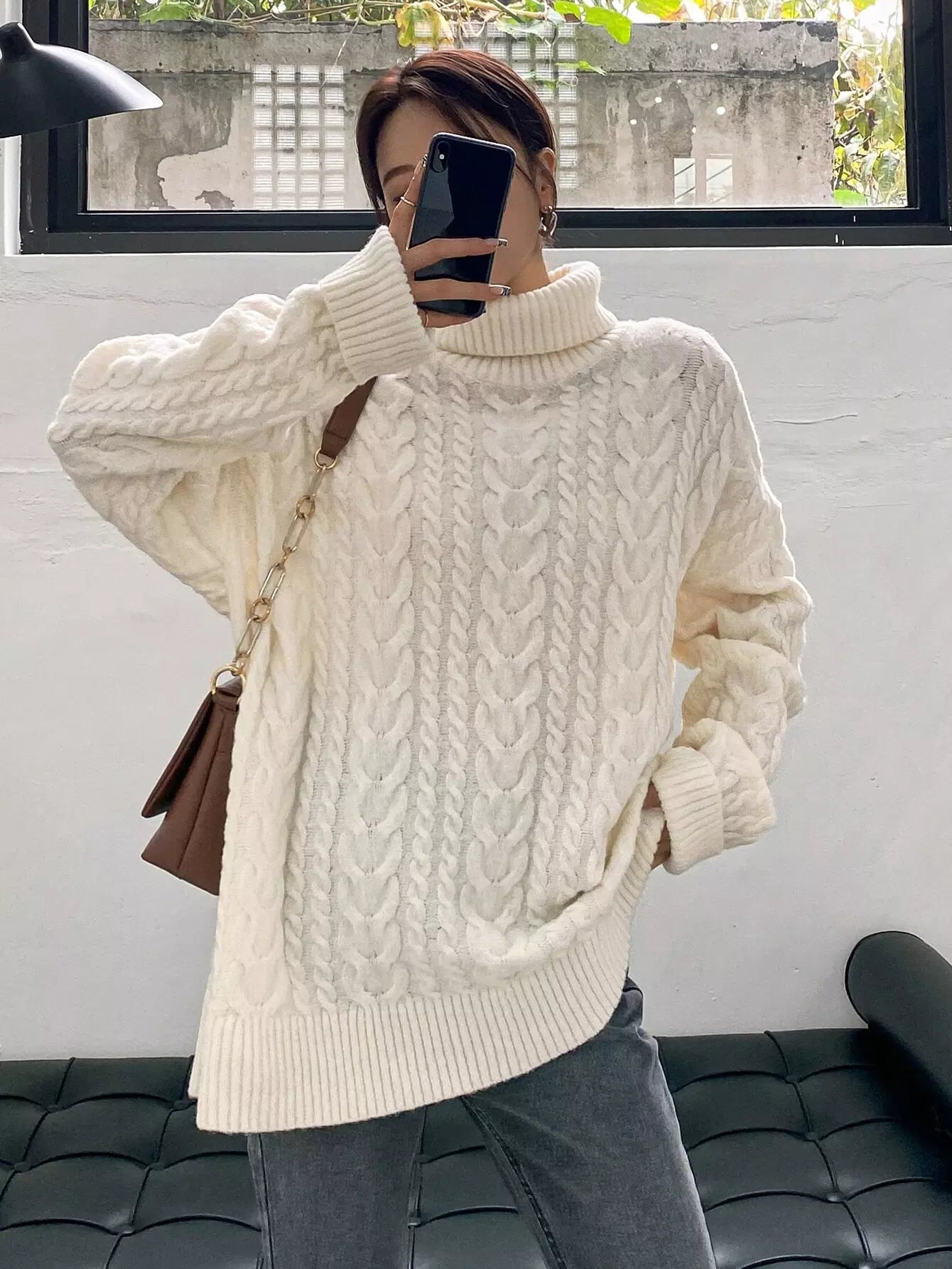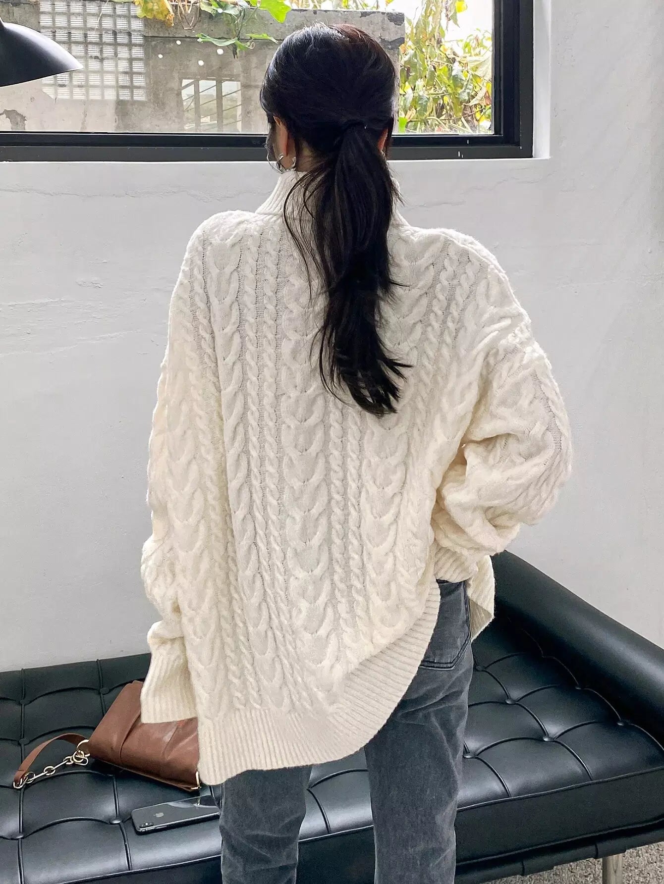 Cable Knit Turtleneck Drop Shoulder Sweater