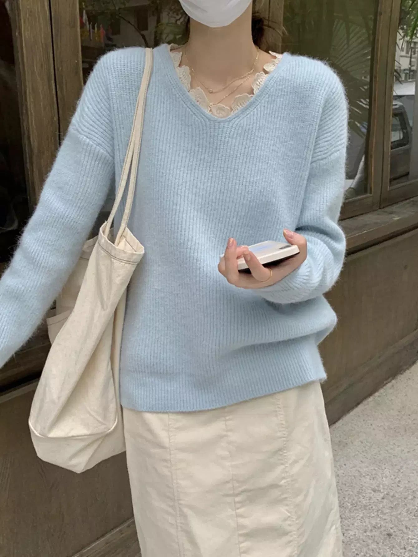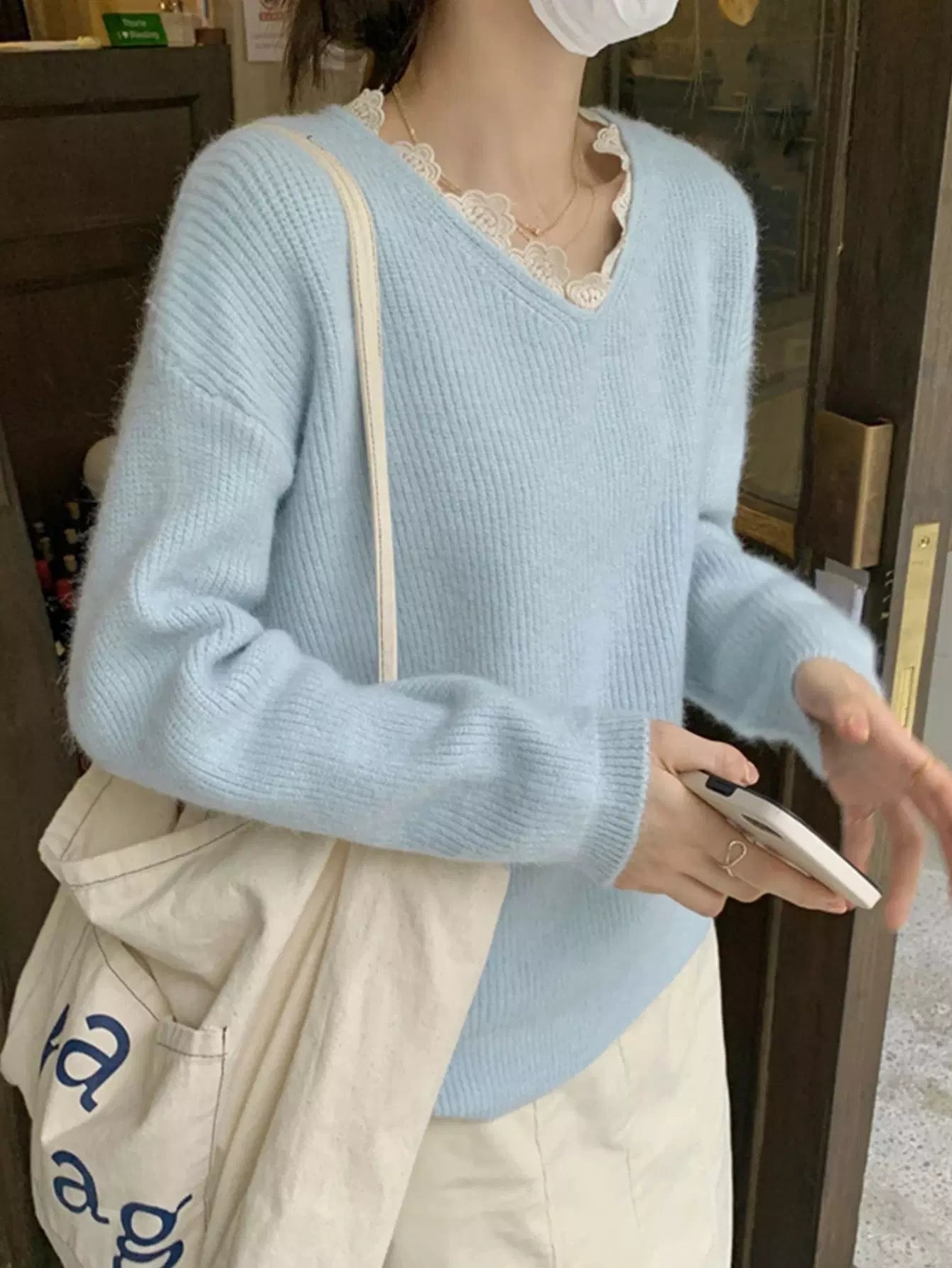 Contrast Lace Drop Shoulder Ribbed Sweater