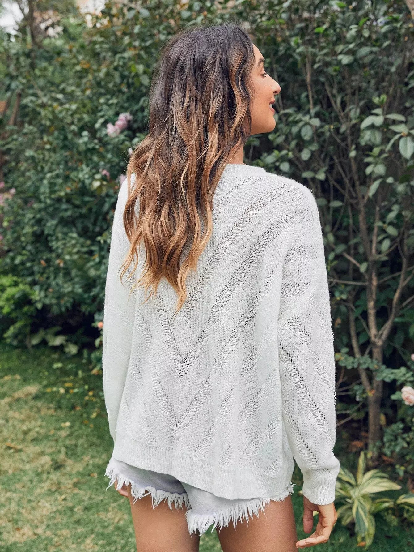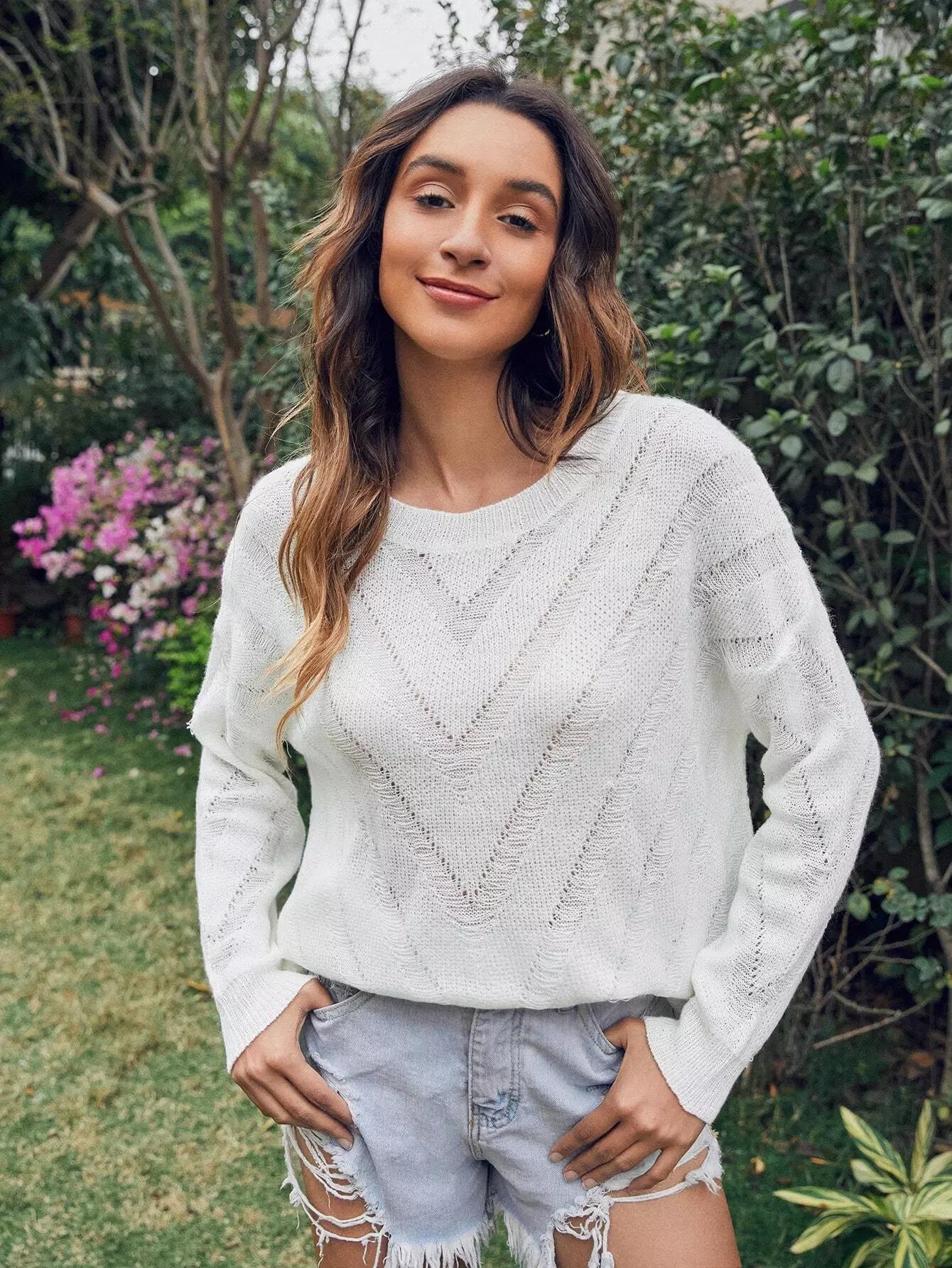 Drop Shoulder Pointelle Knit Sweater
