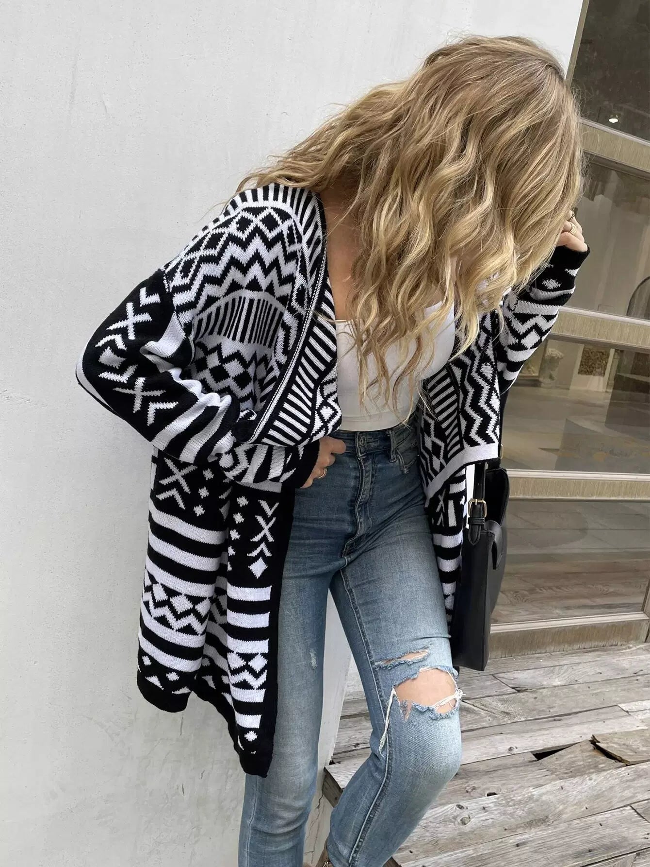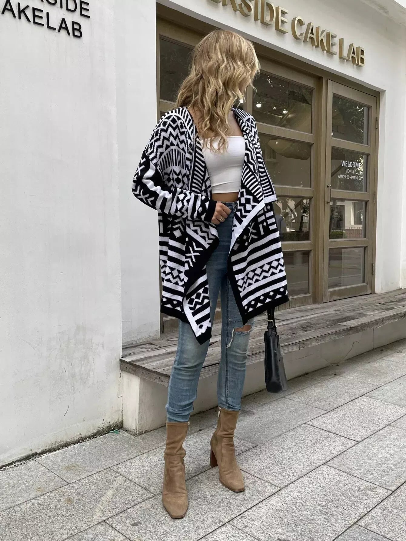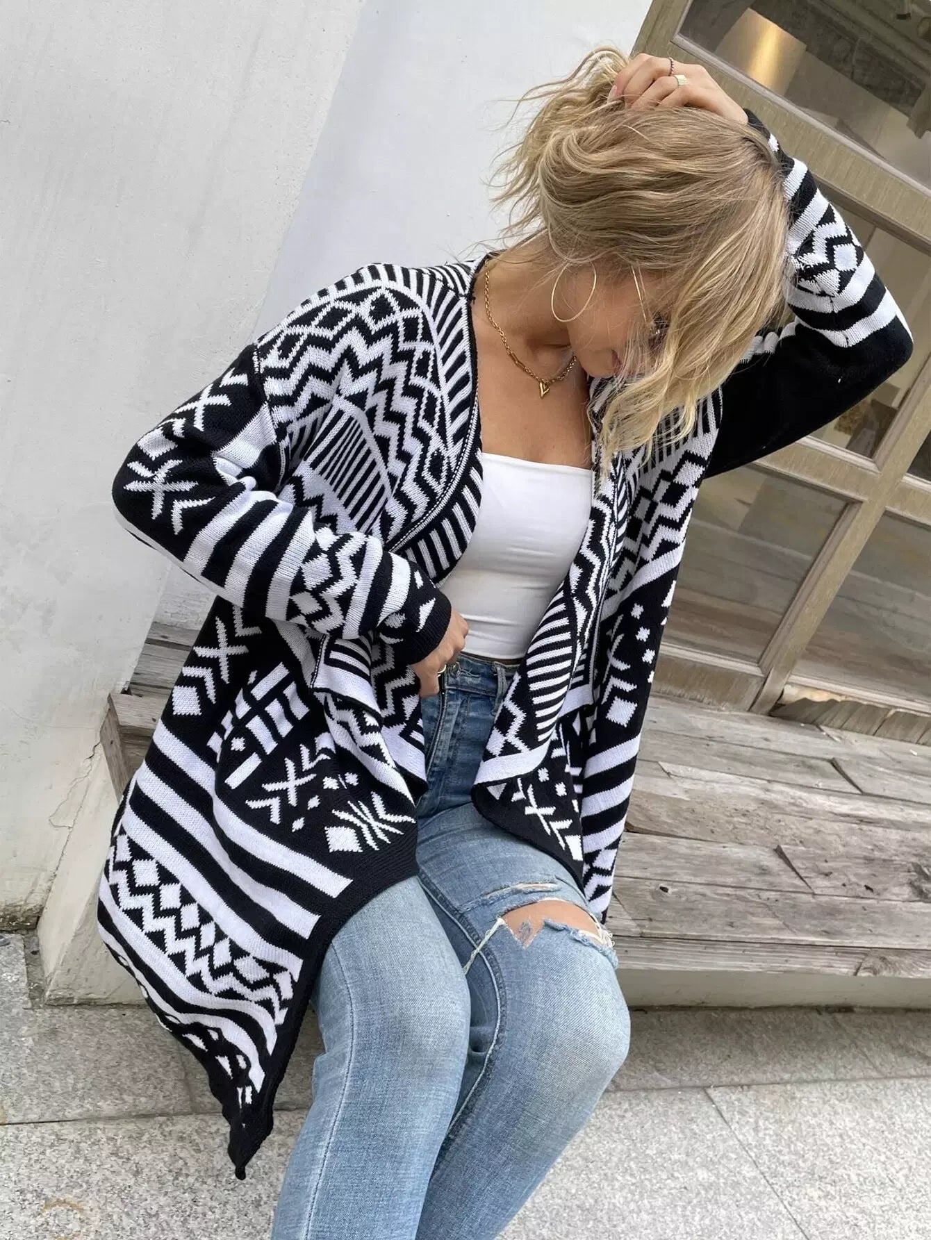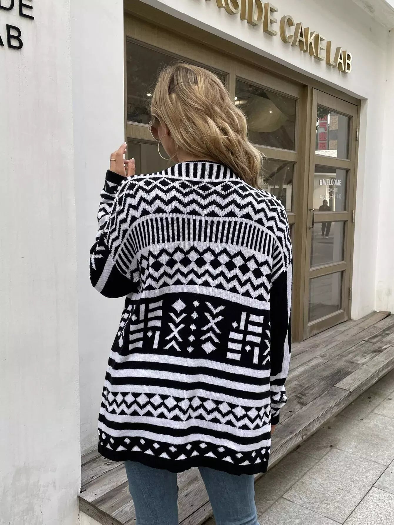 Geo Pattern Drop Shoulder Waterfall Collar Cardigan