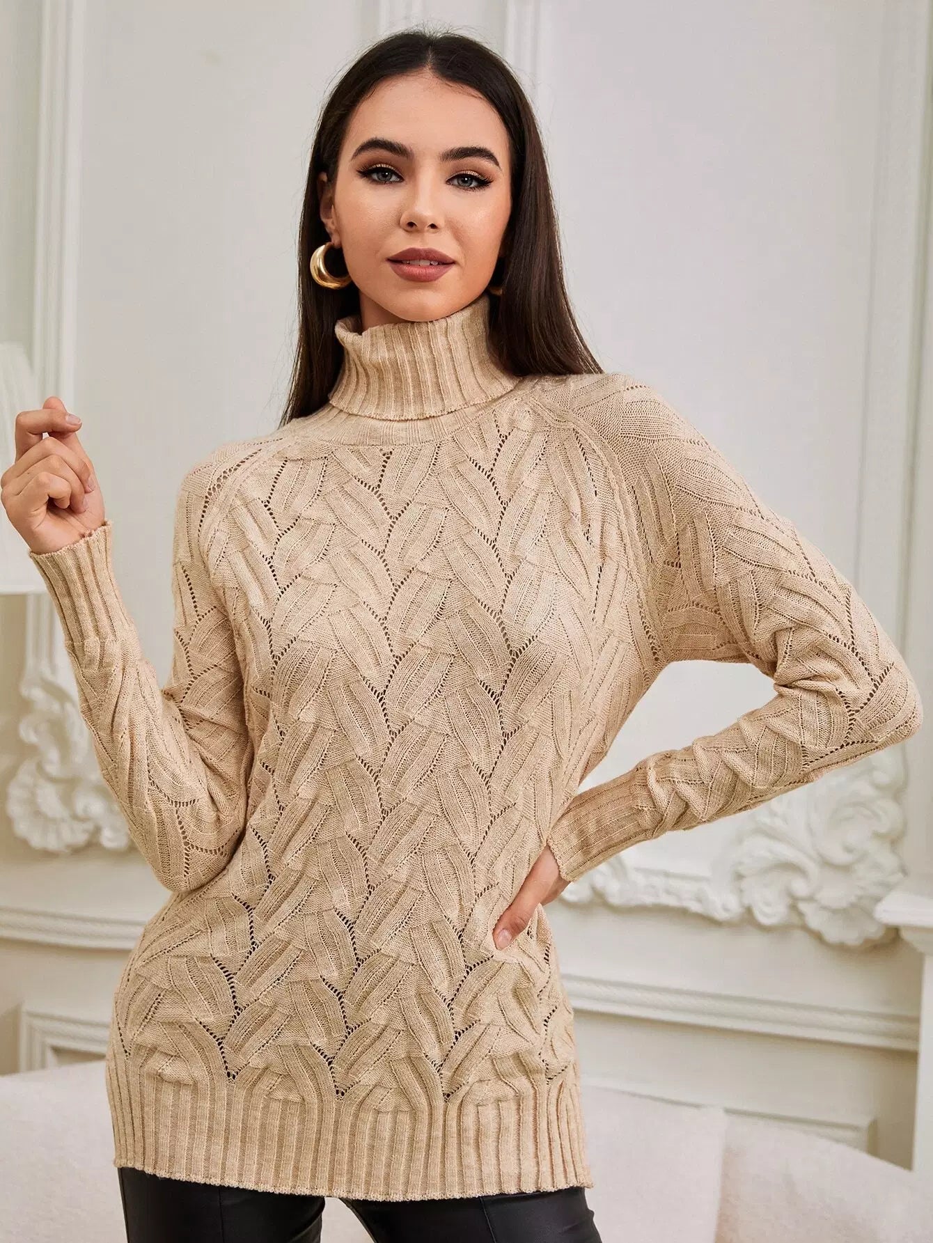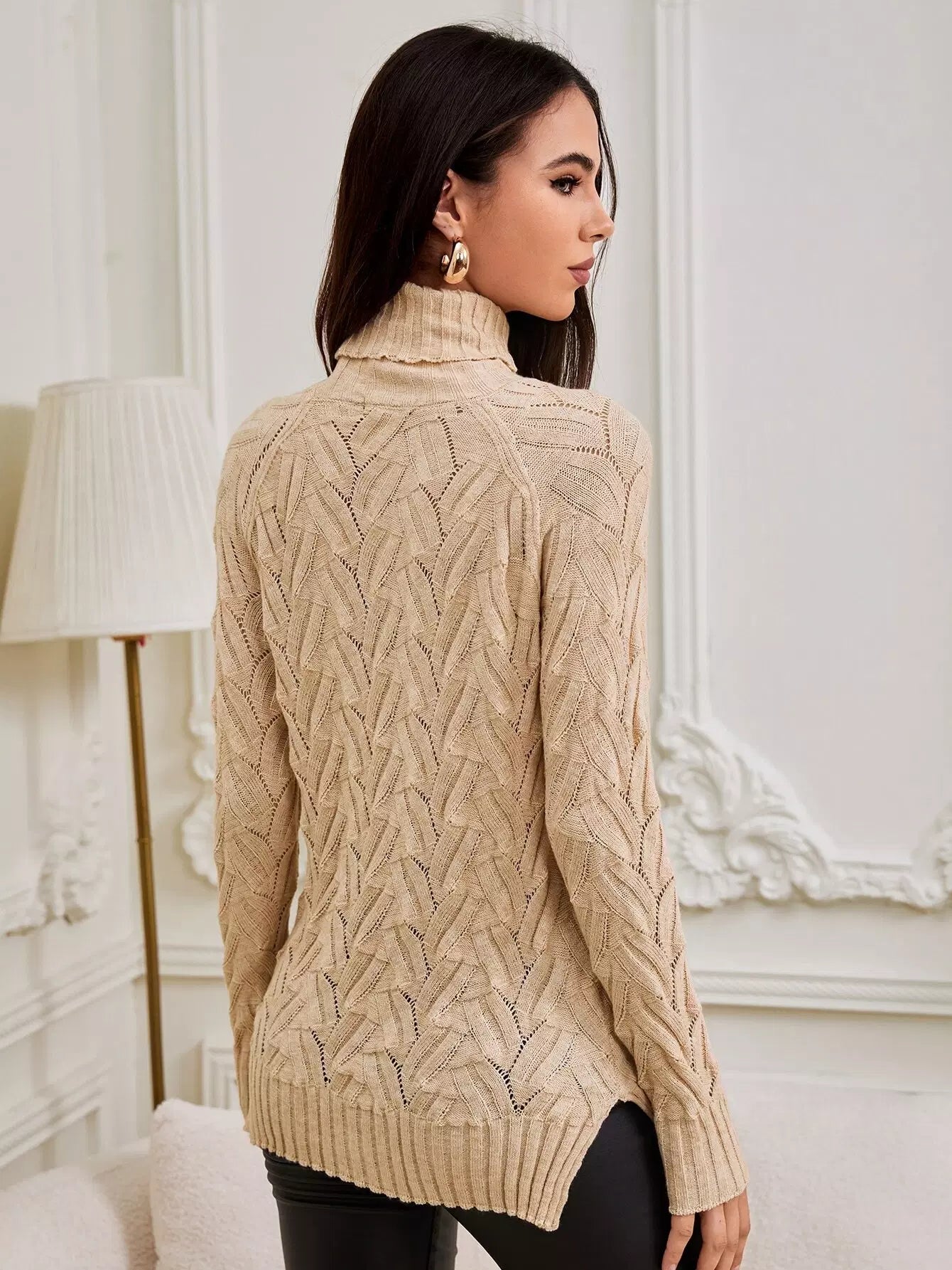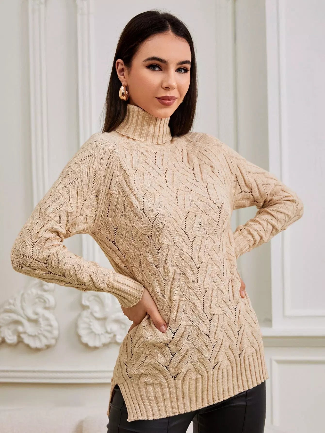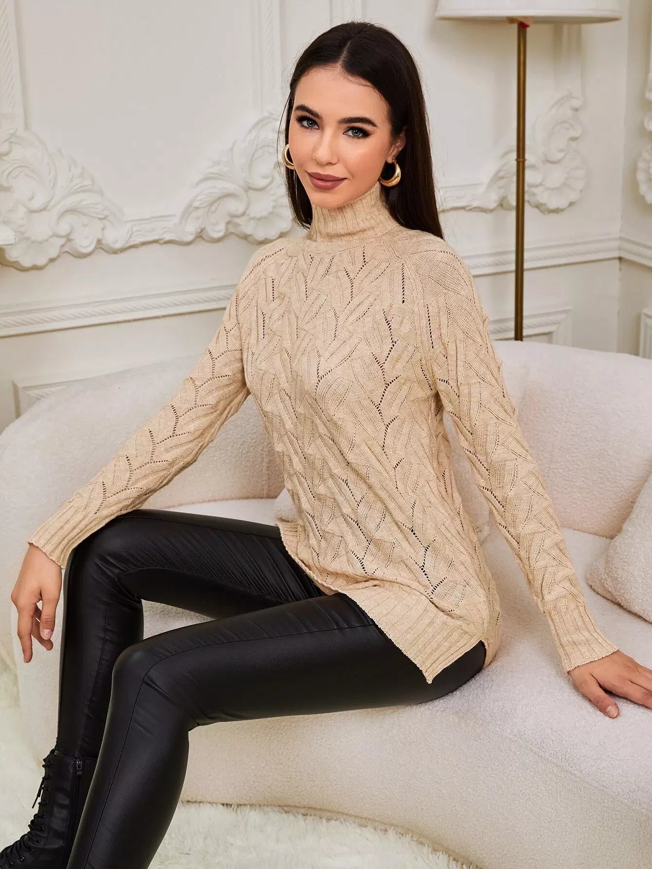 High Neck Pointelle Knit Split Hem Sweater Without Belt