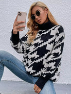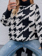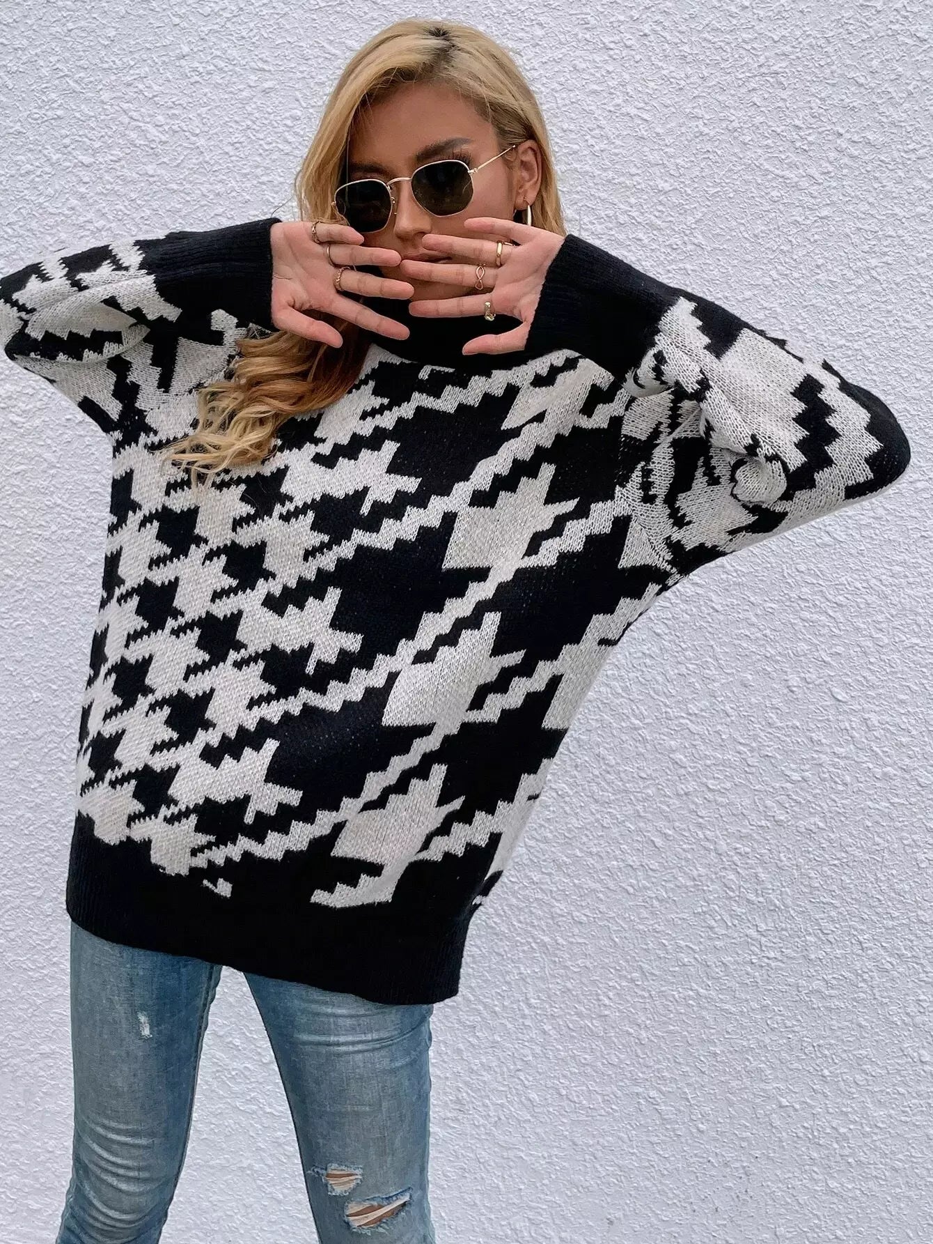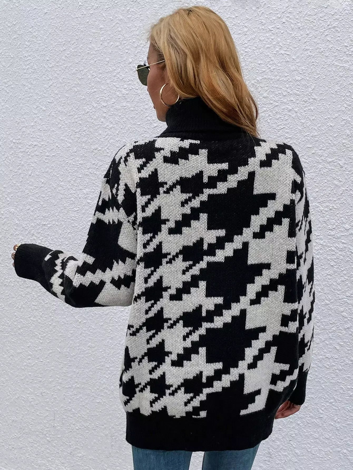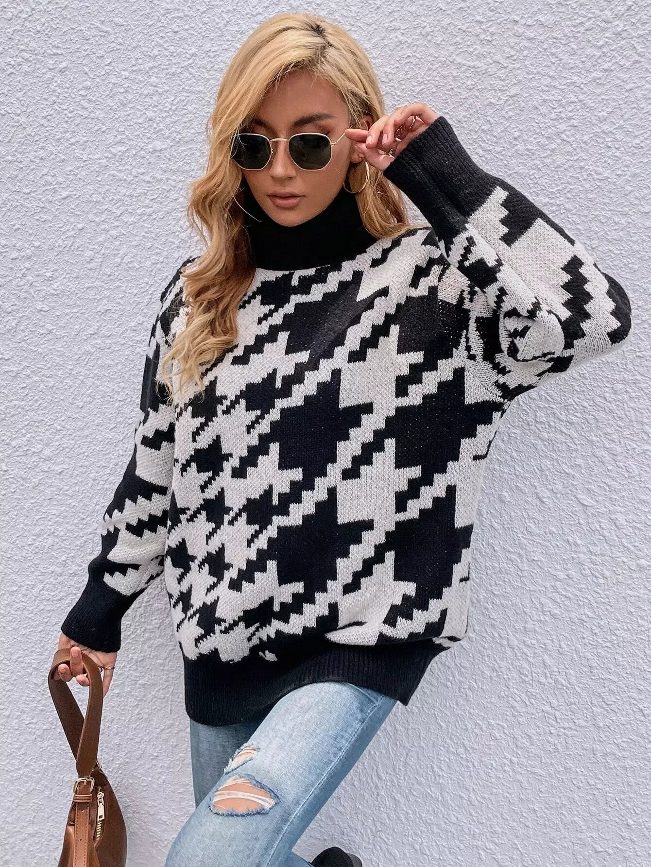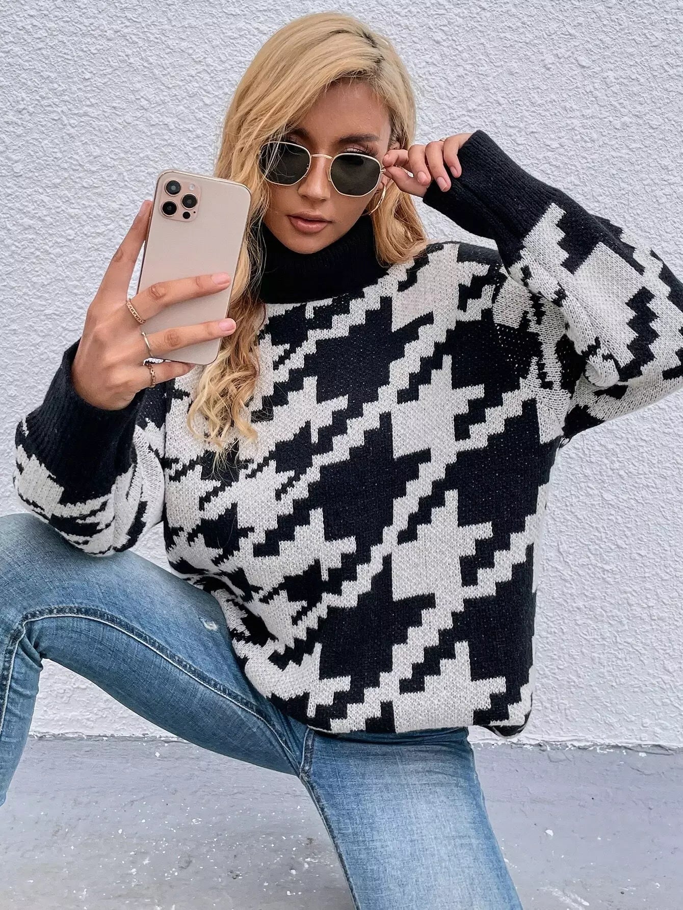 Houndstooth Pattern Turtle Neck Drop Shoulder Sweater