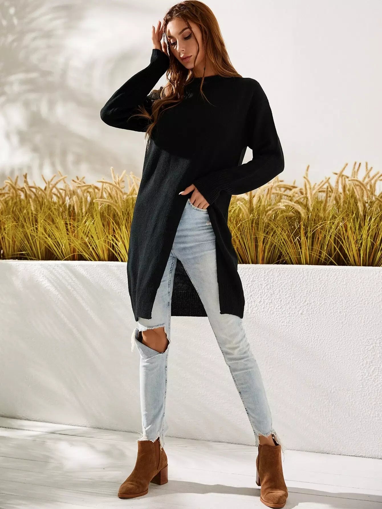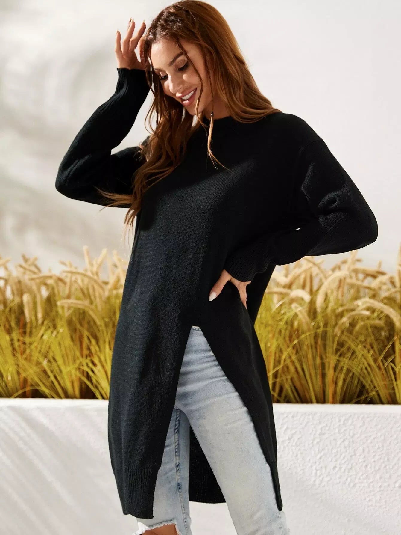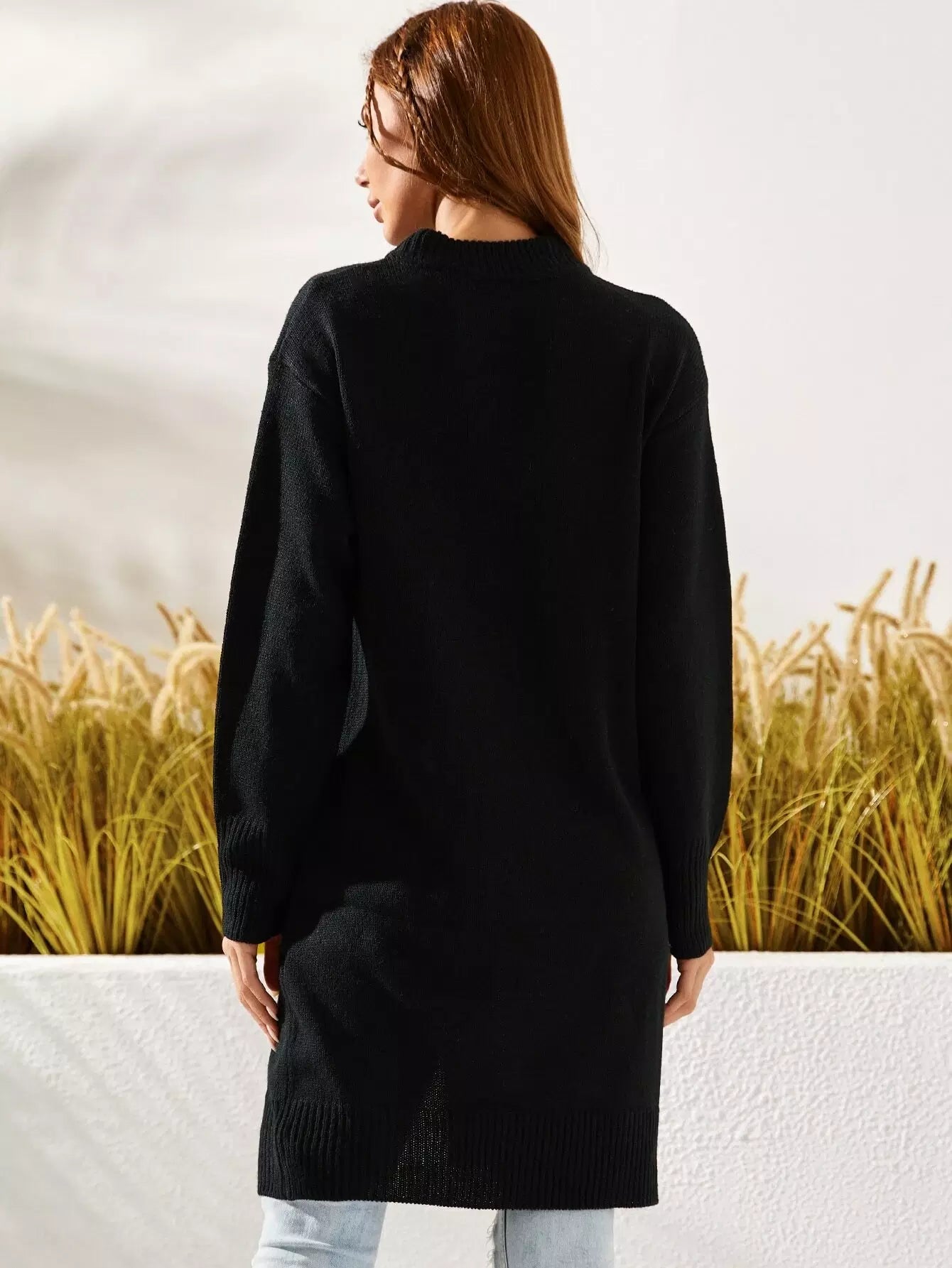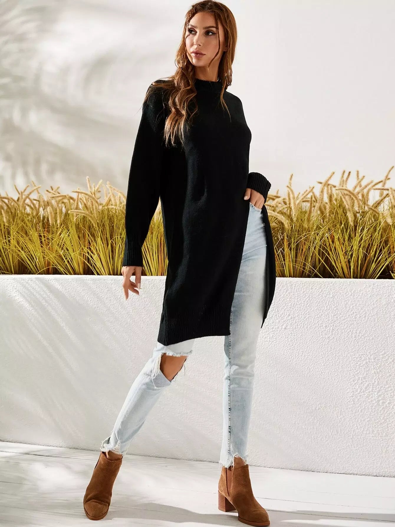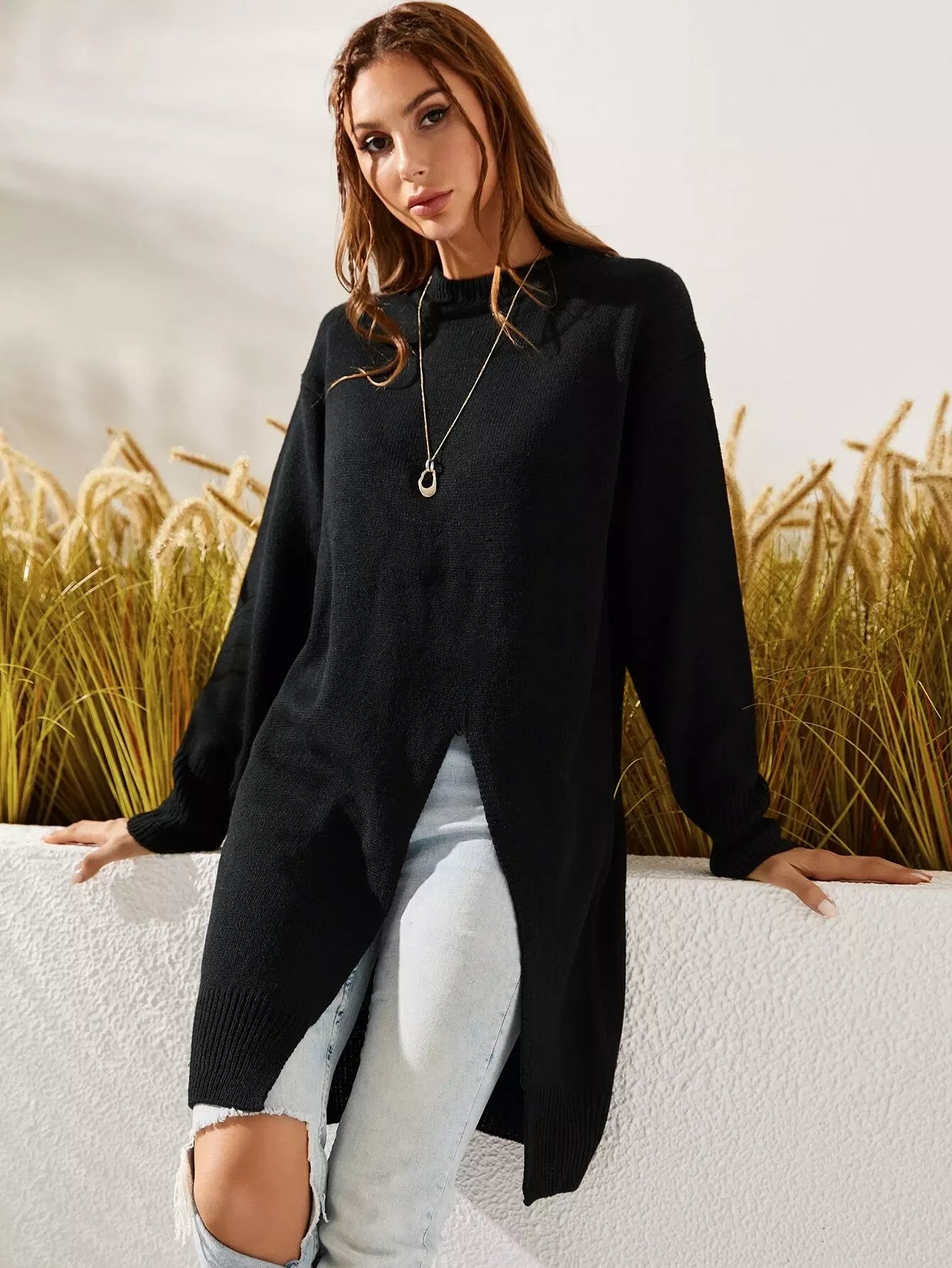 Mock Neck Drop Shoulder Slit Hem Longline Sweater