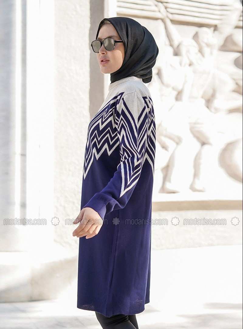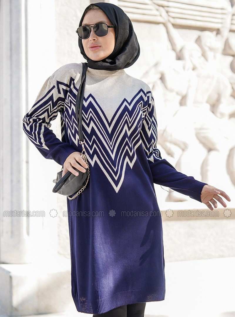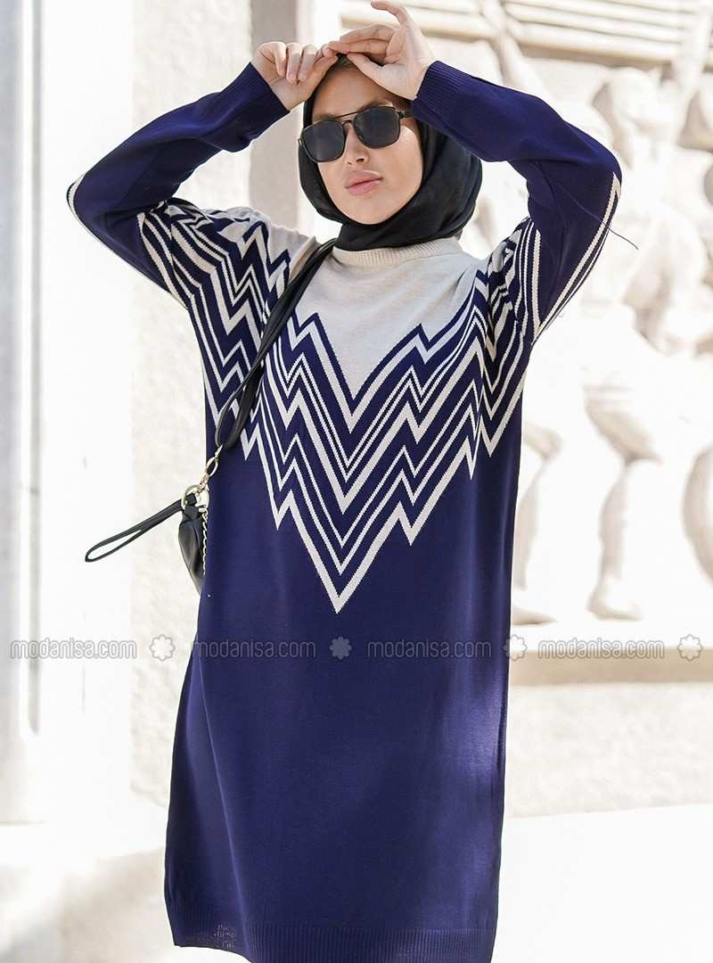 Navy Blue Ecru Multi Crew neck Acrylic Tunic