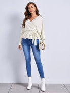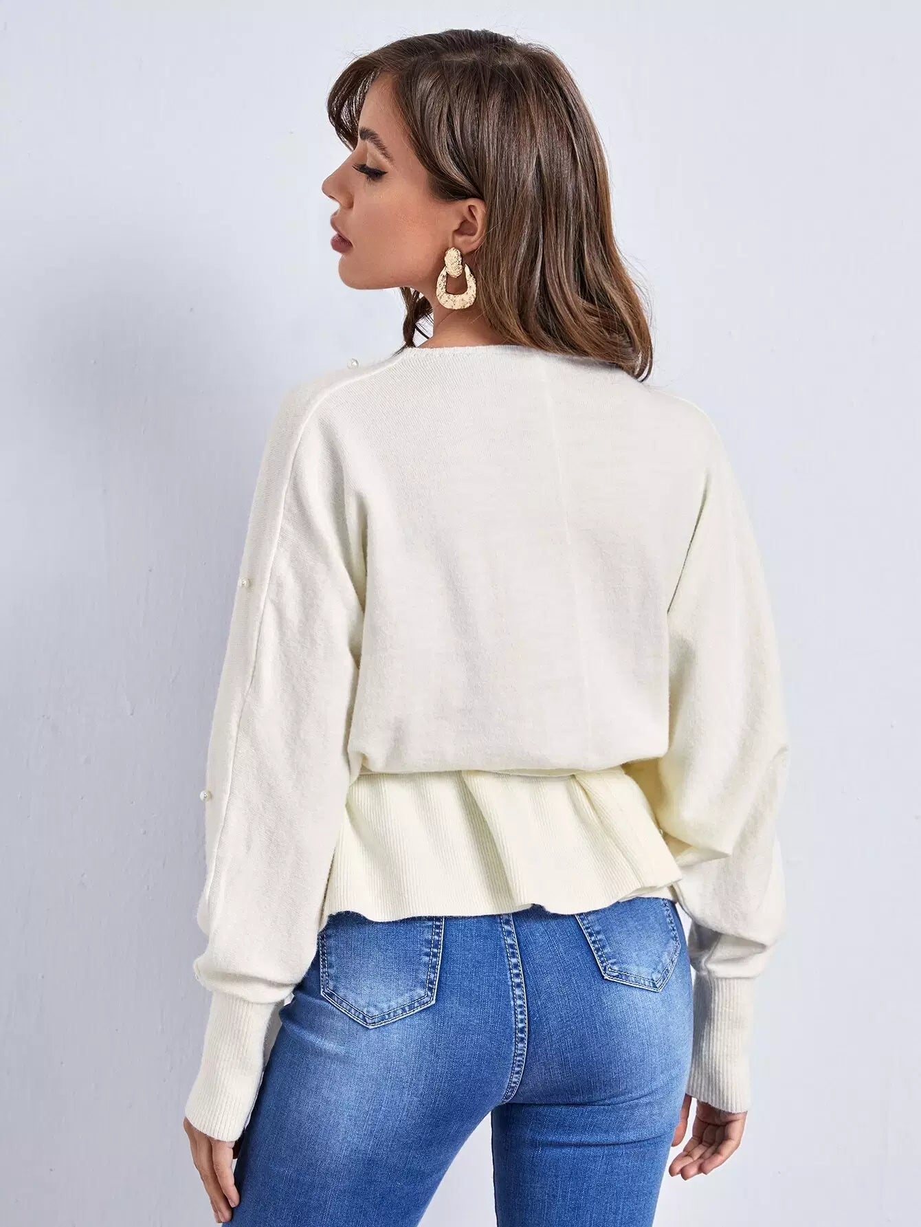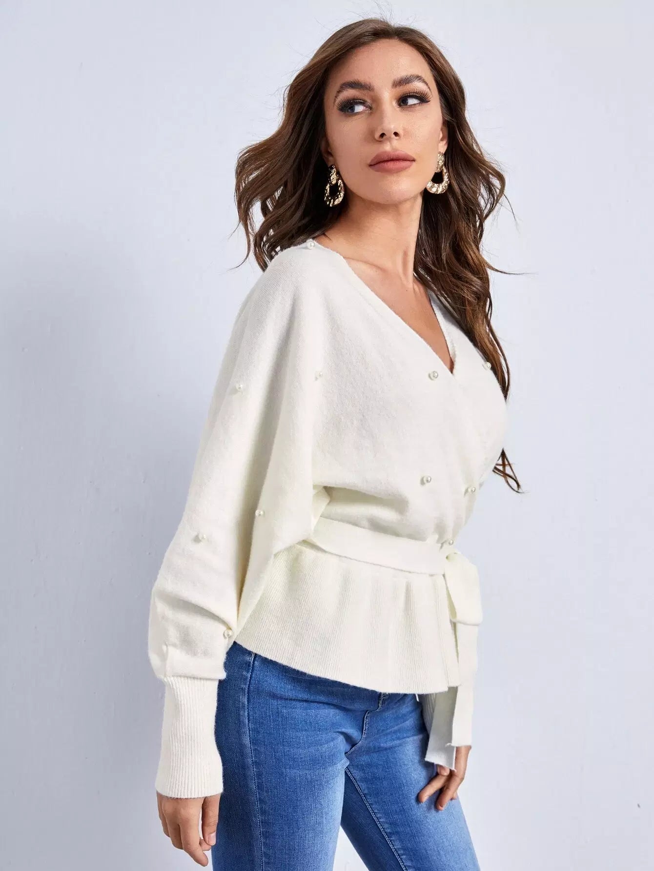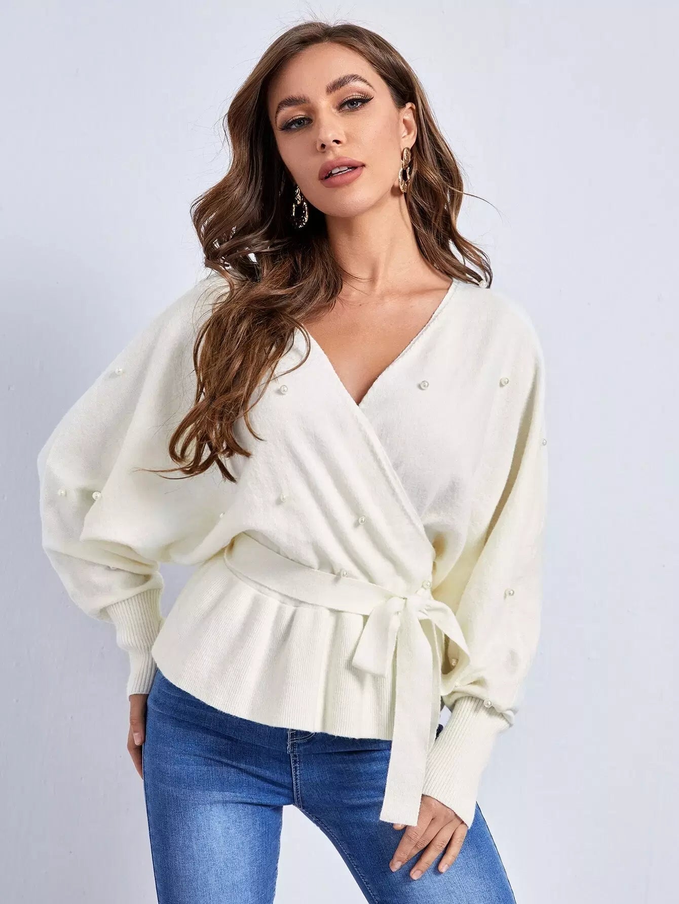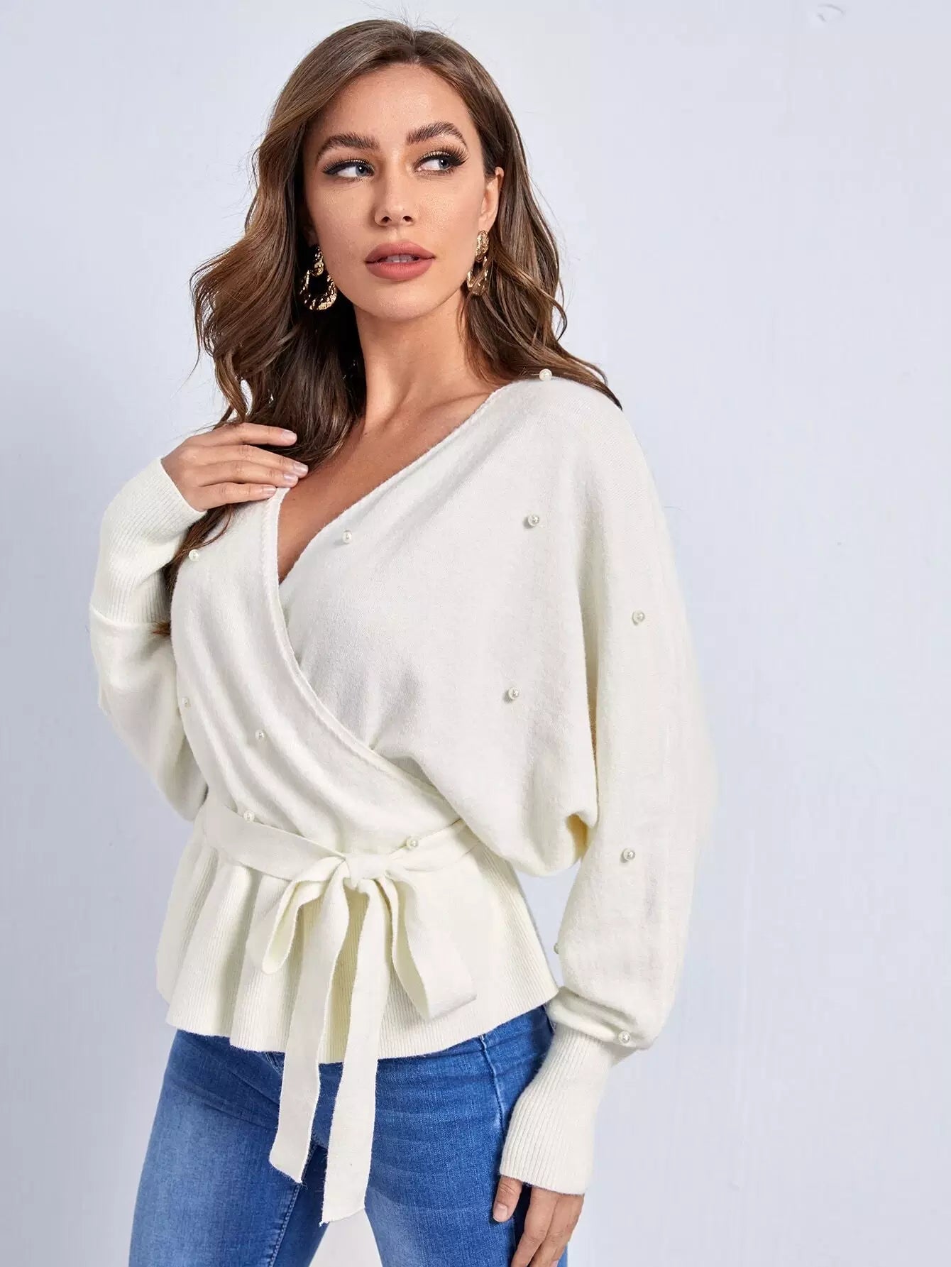 Pearl Beaded Wrap Detail Self Sweater Without Belt