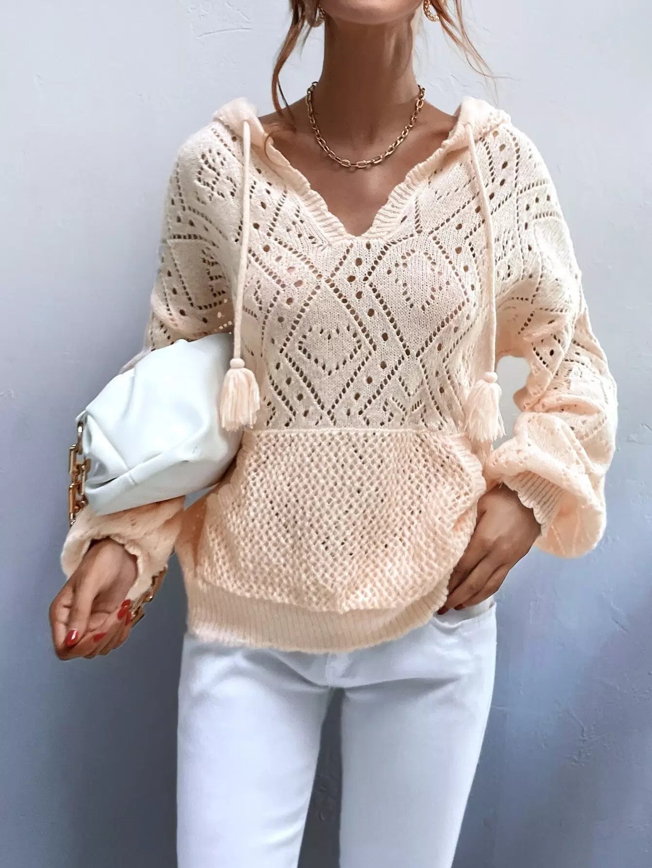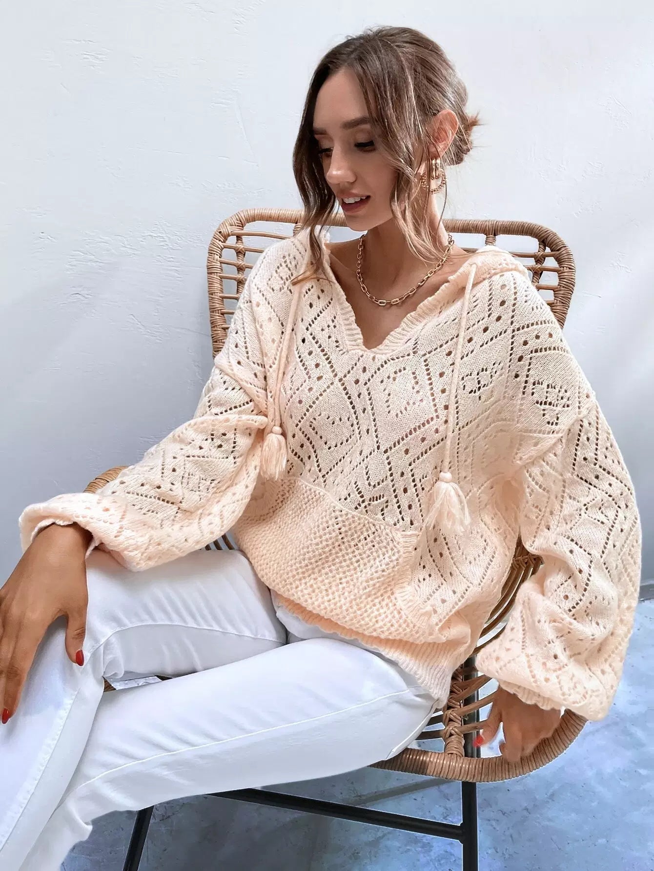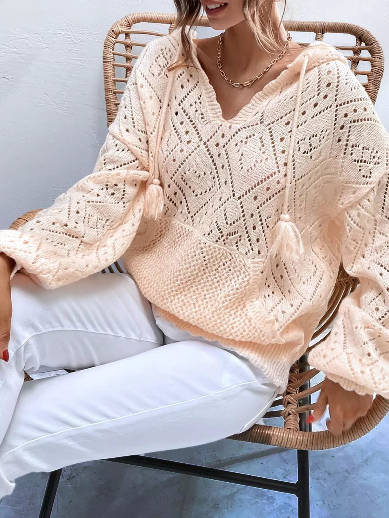 Pointelle Knit Drop Shoulder Tassel Drawstring Hooded Sweater
