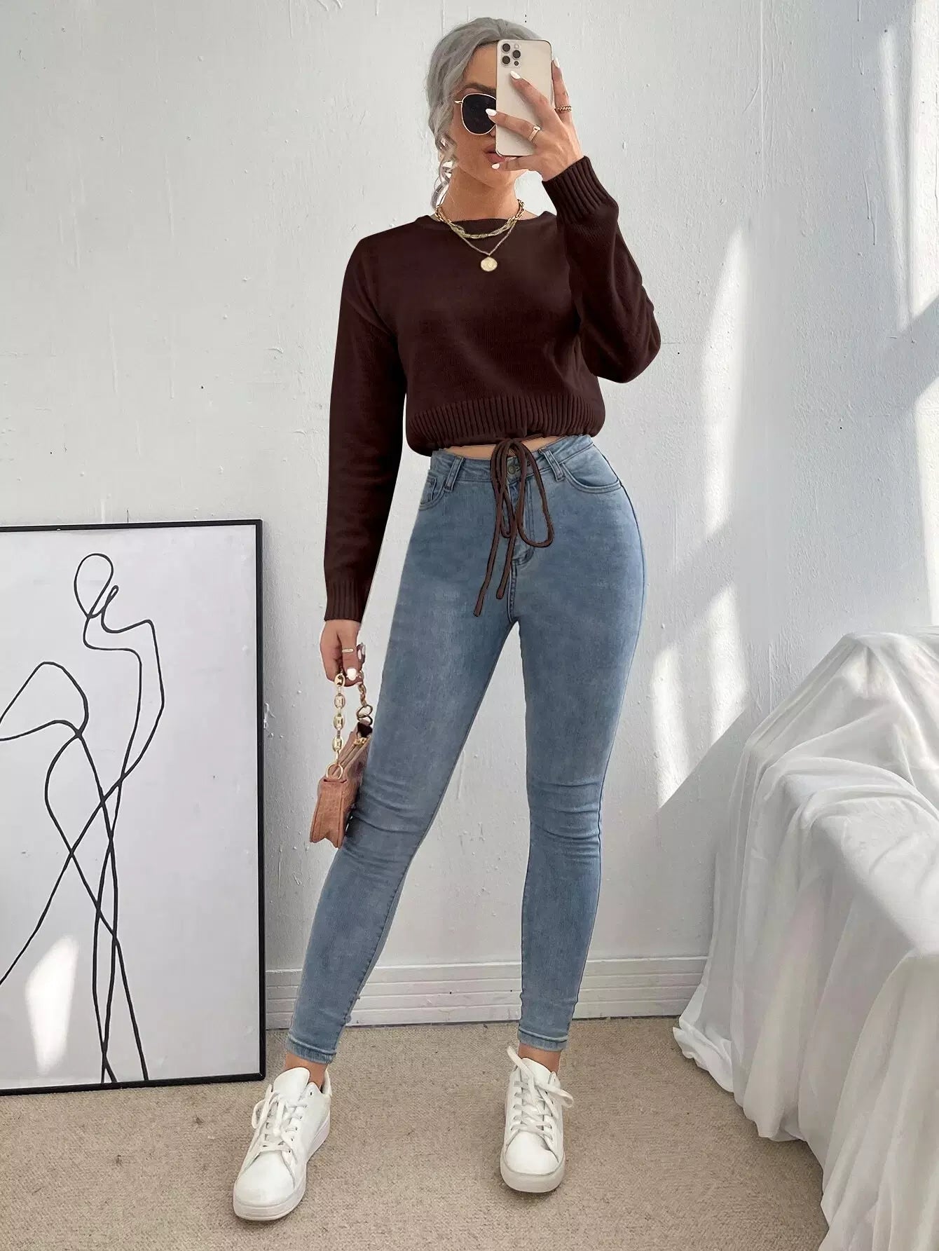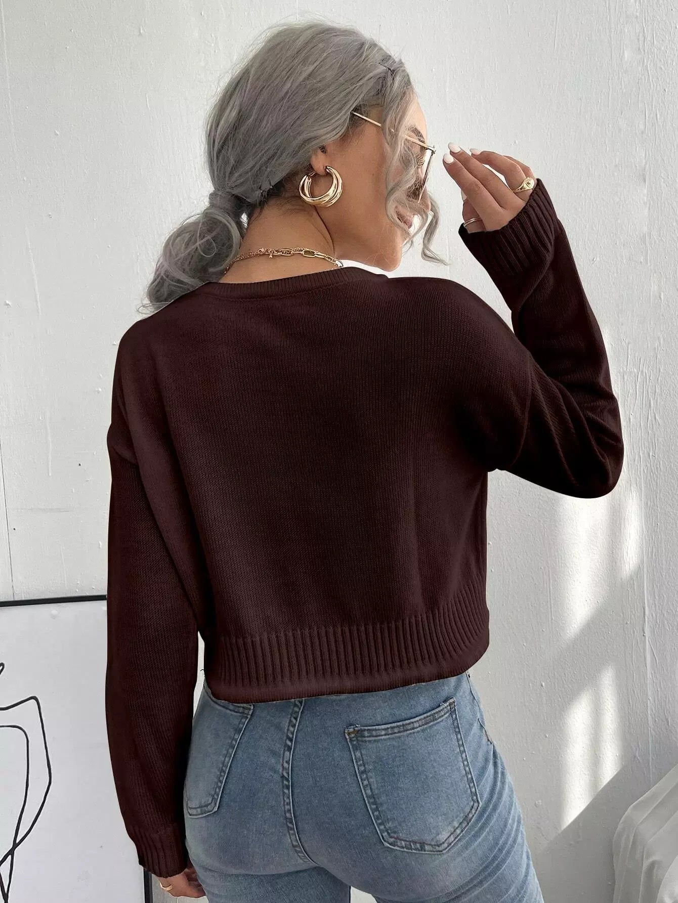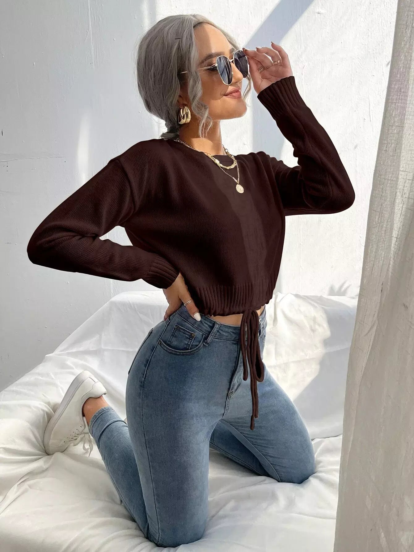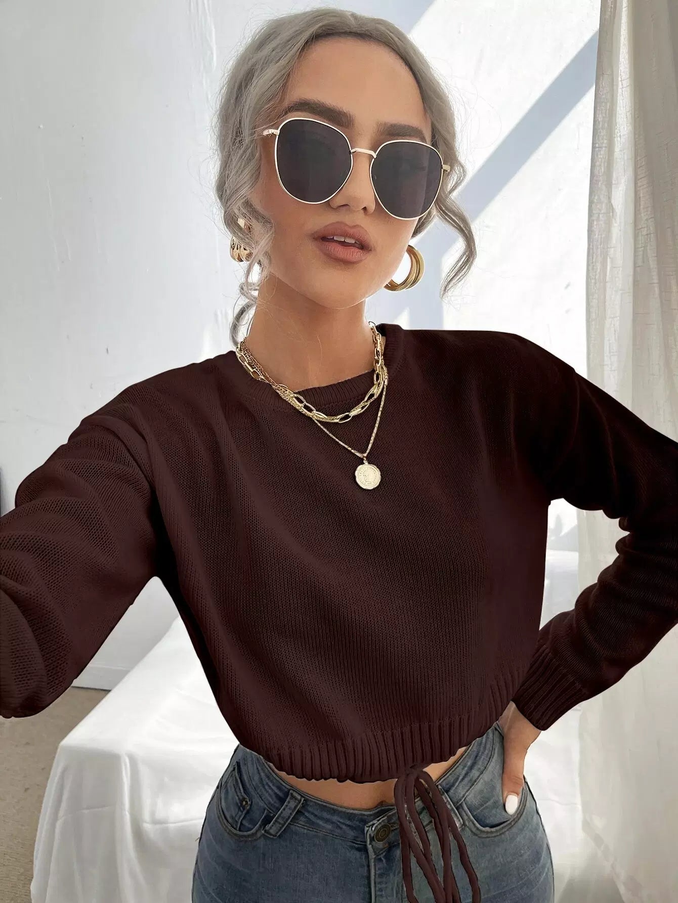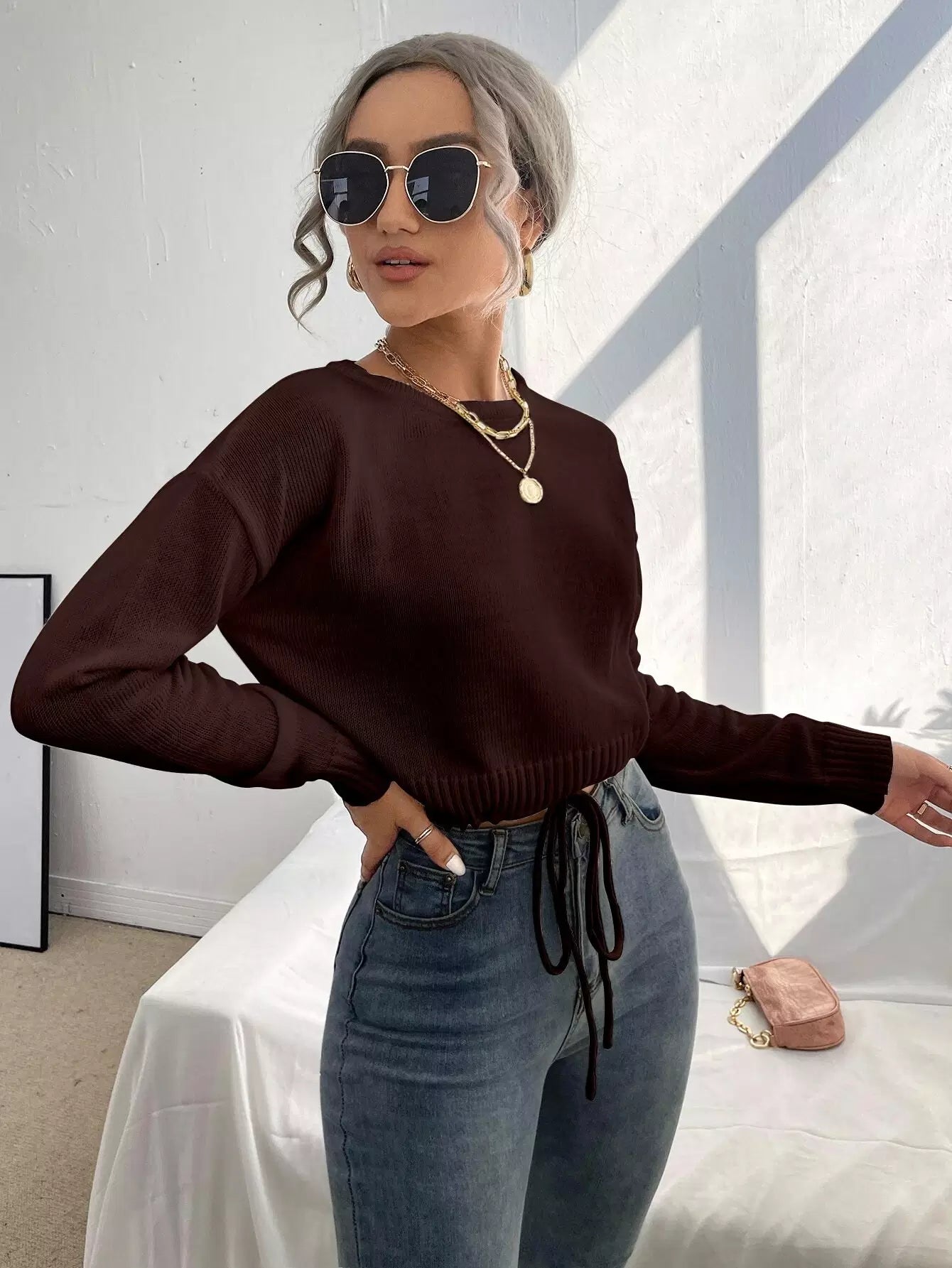 Solid Tie Front Crop Sweater