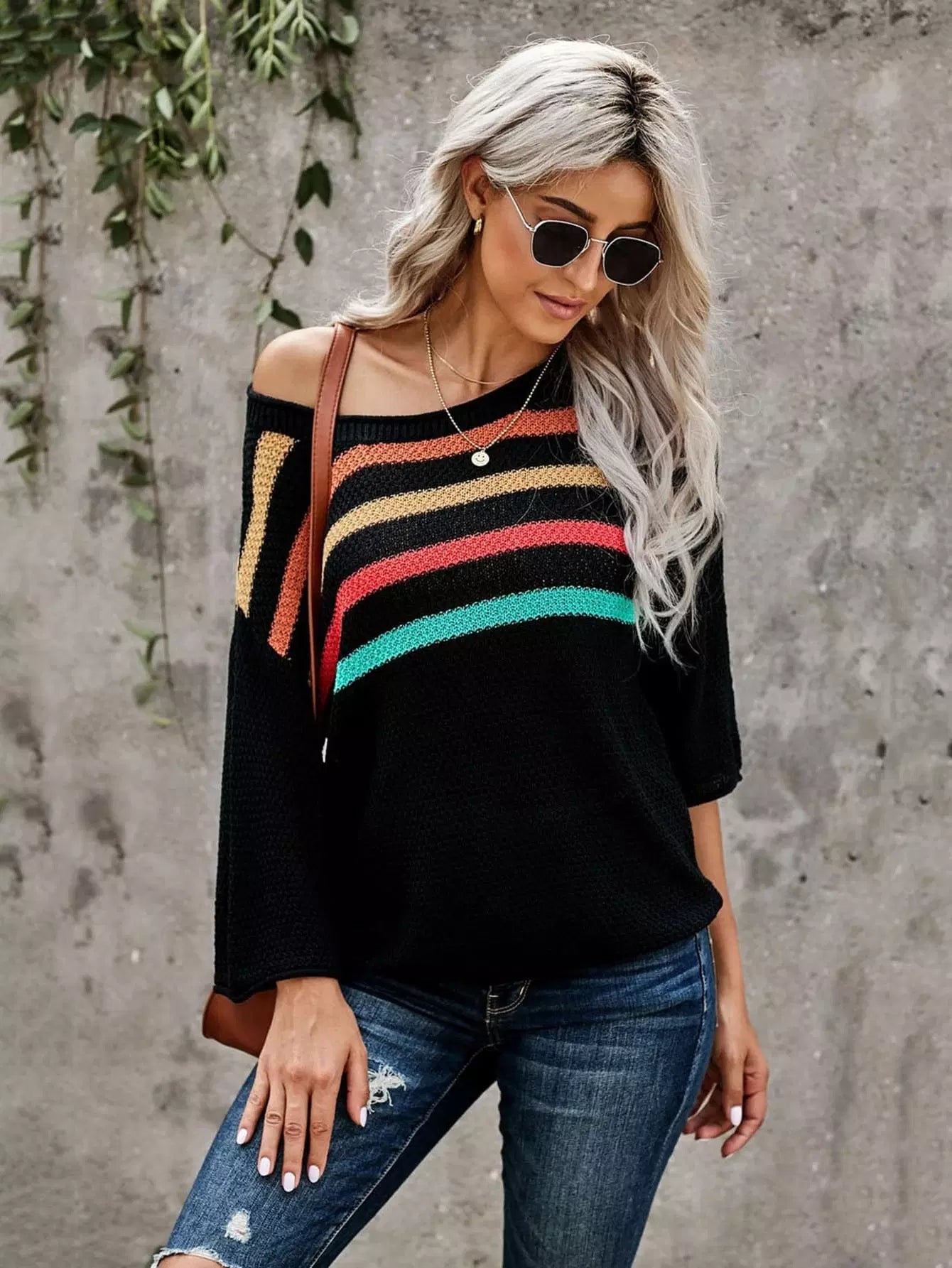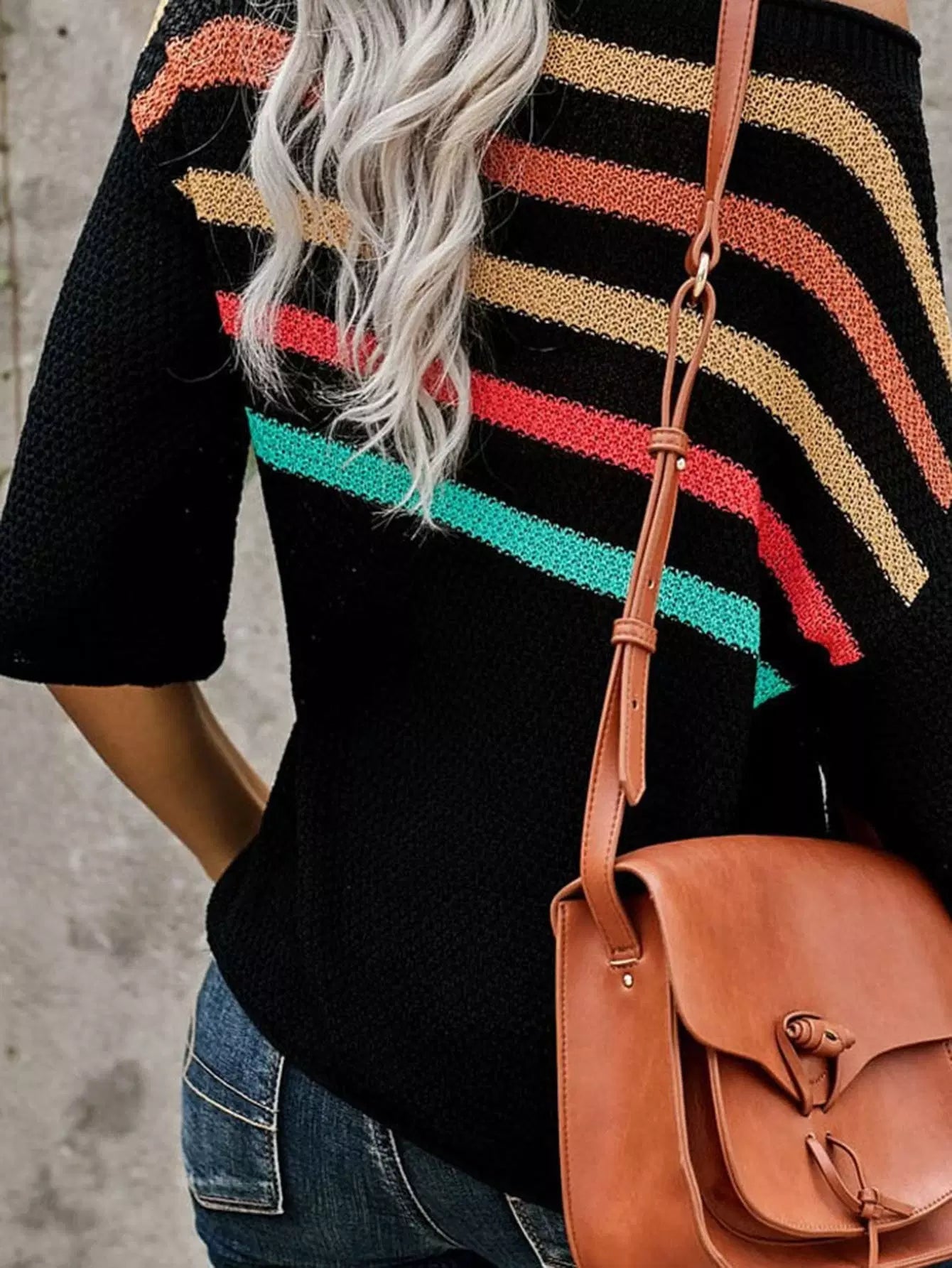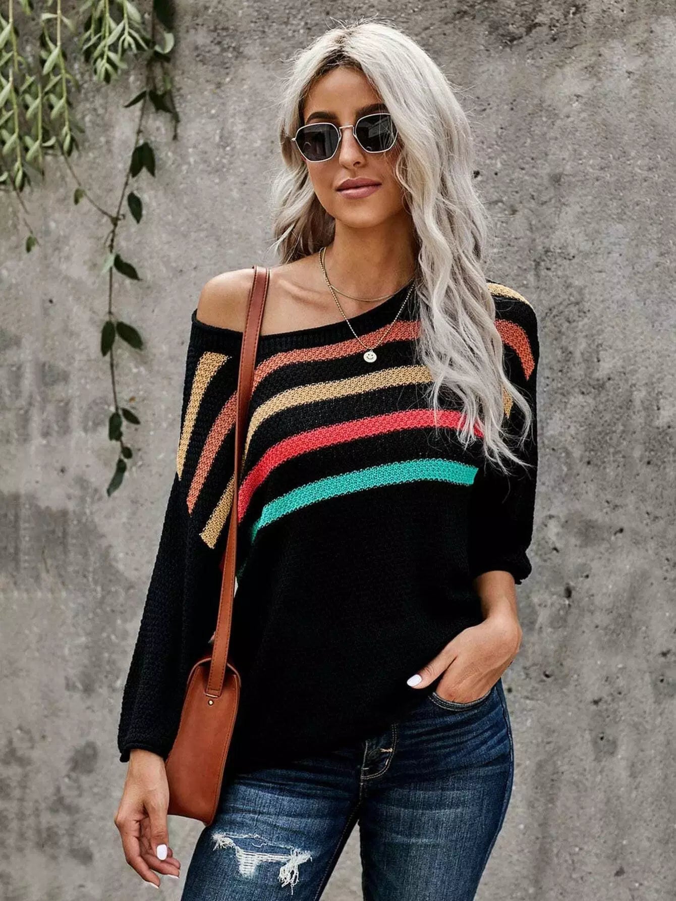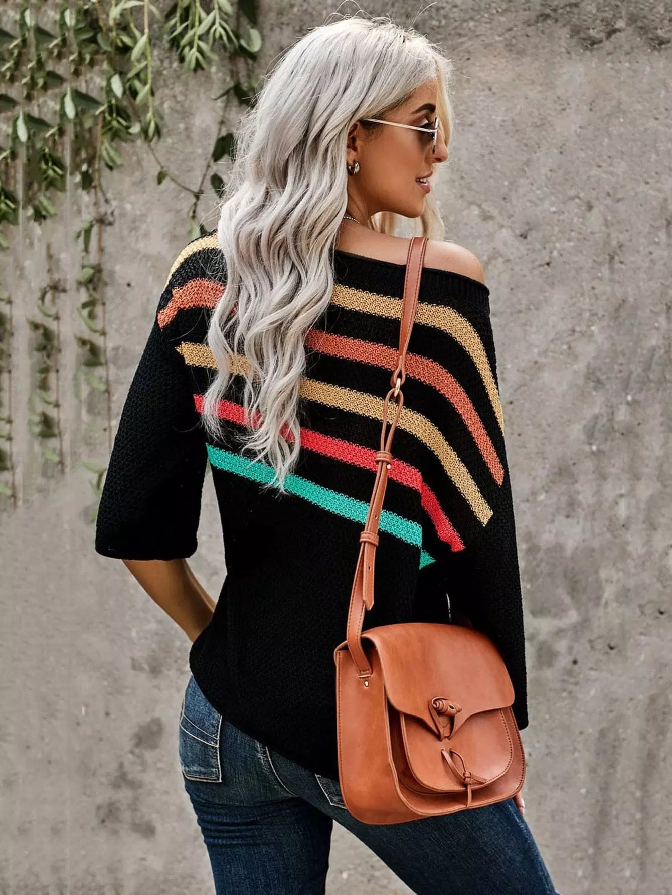 Striped Pattern Crew Neck Drop Shoulder Sweater