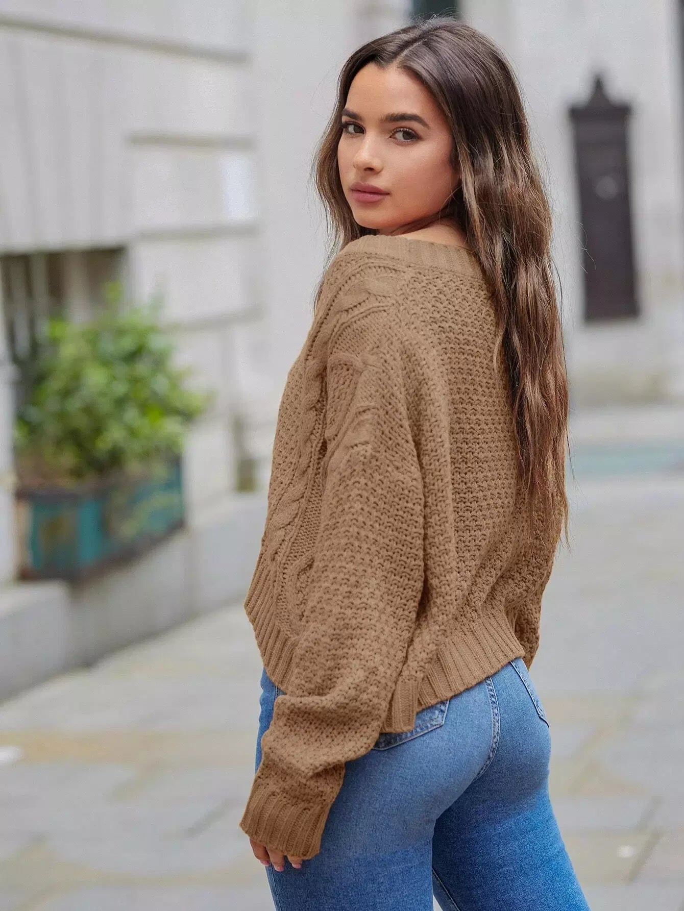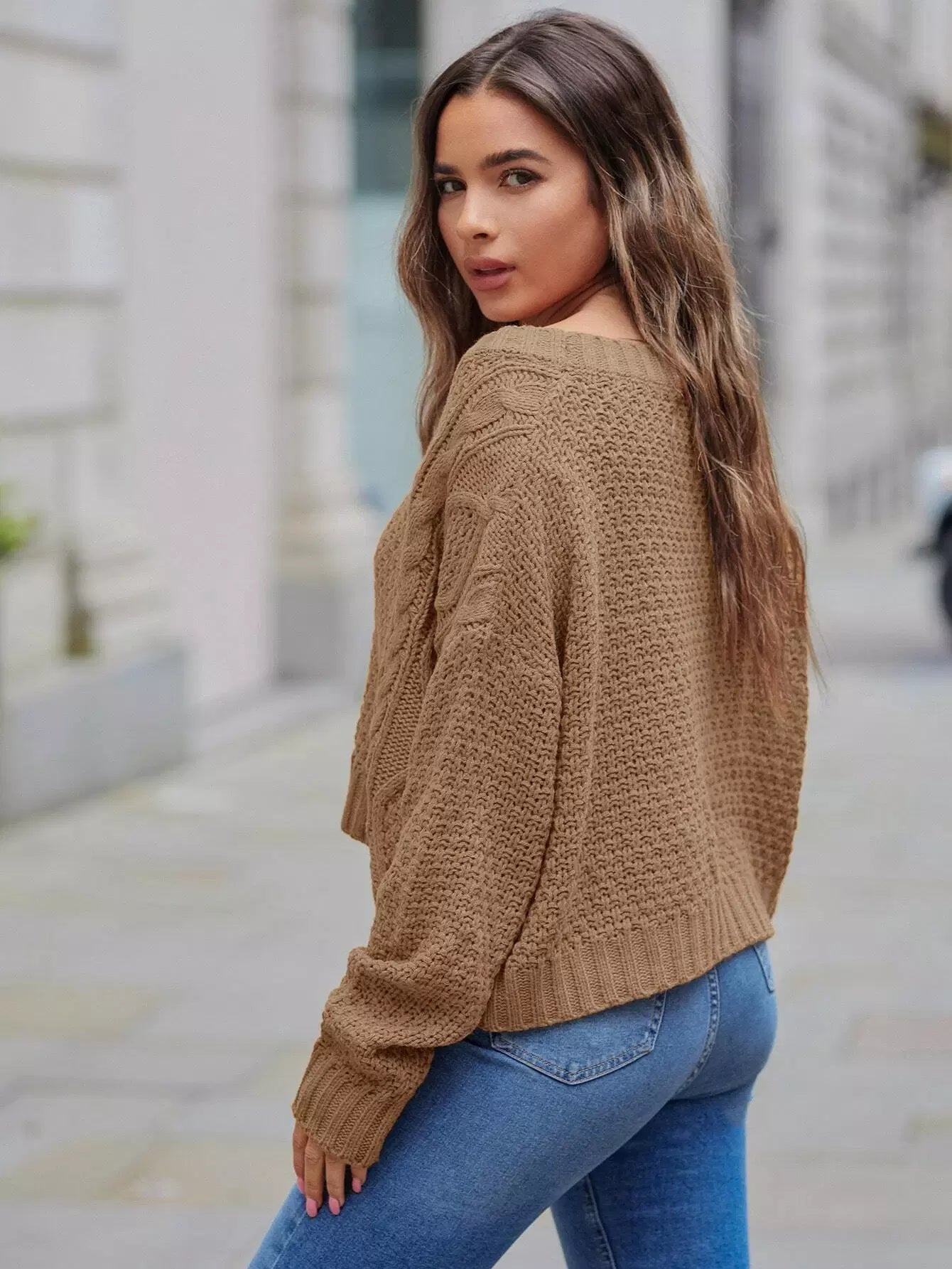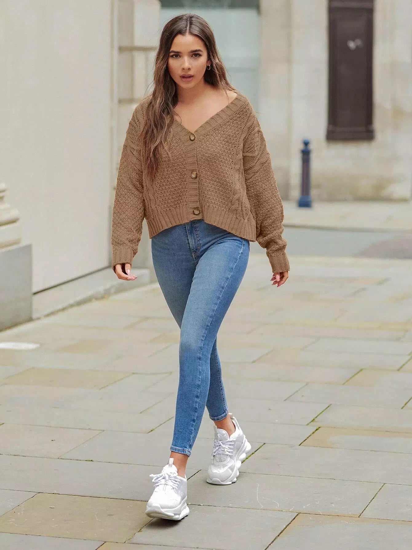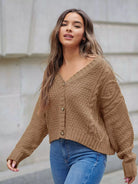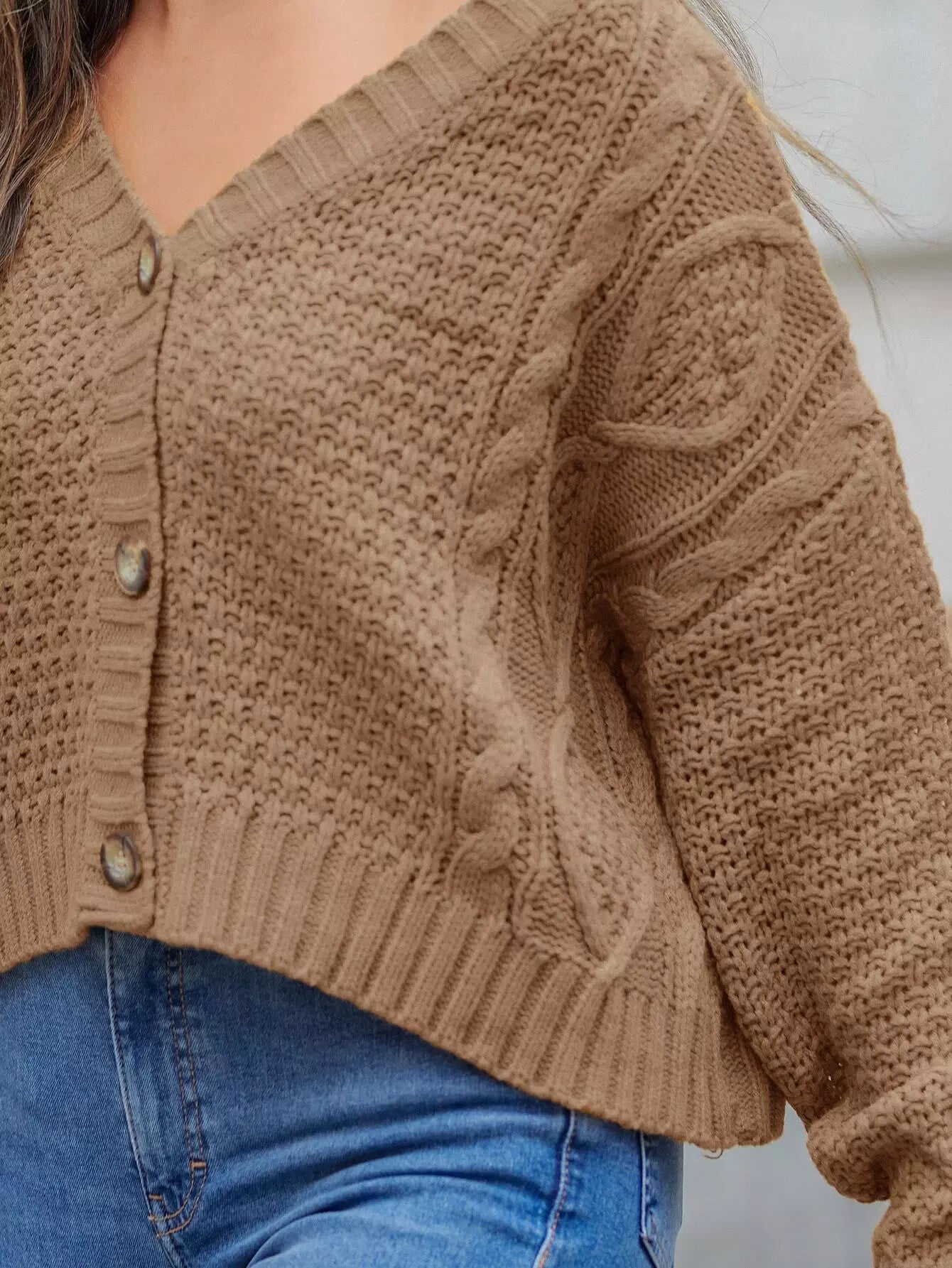 Buttoned Front Drop Shoulder Cable Knit Cardigan
