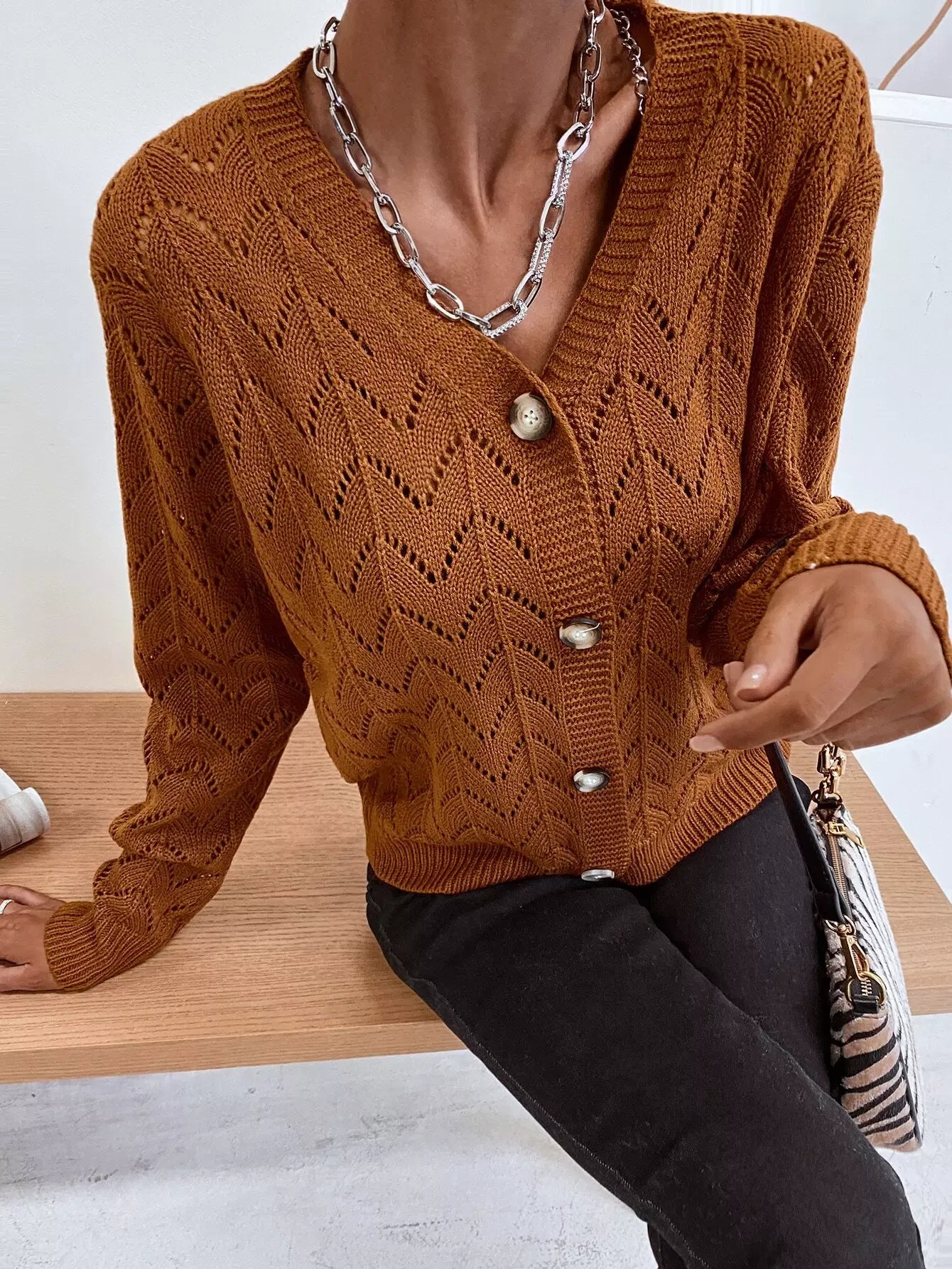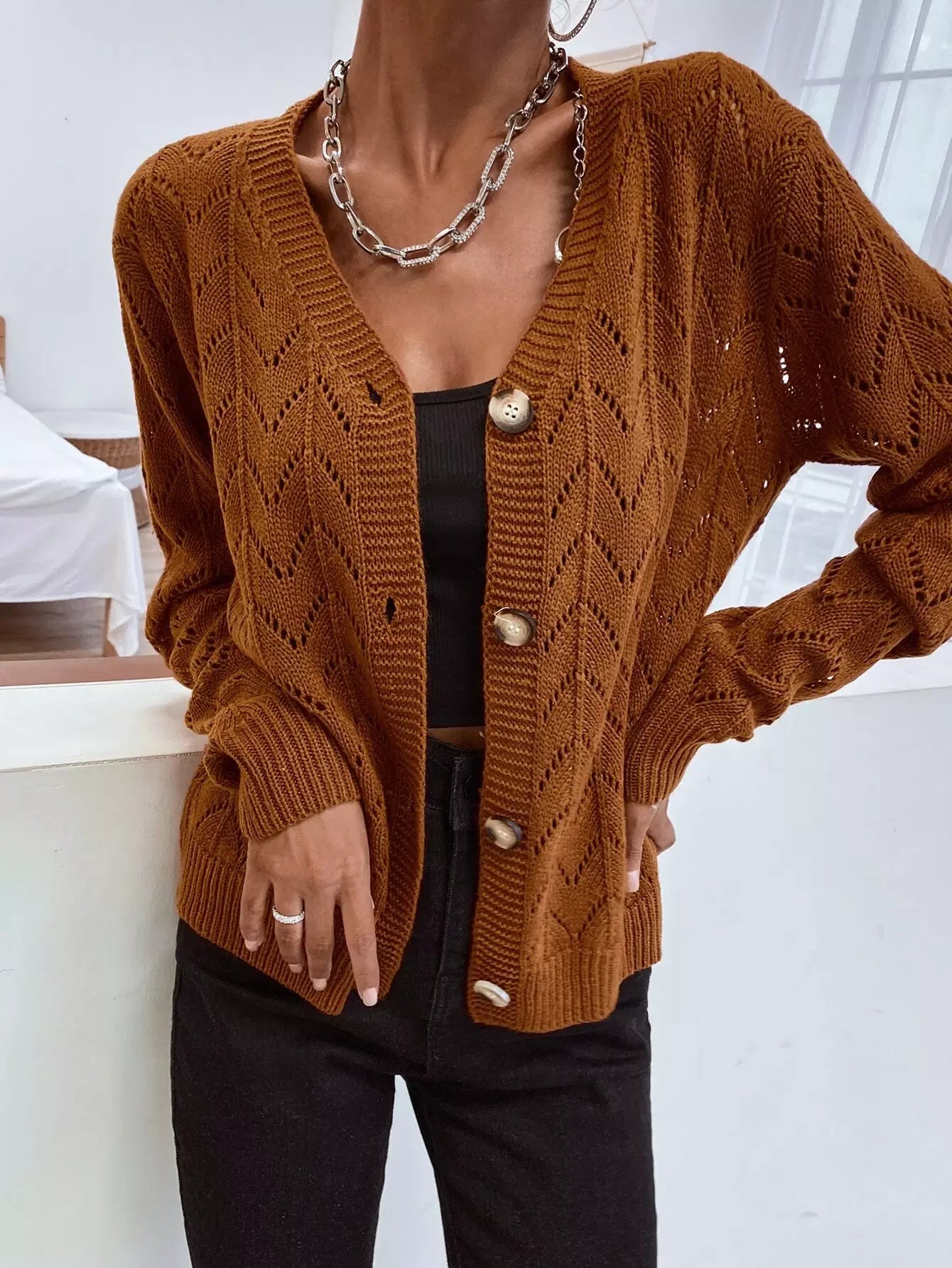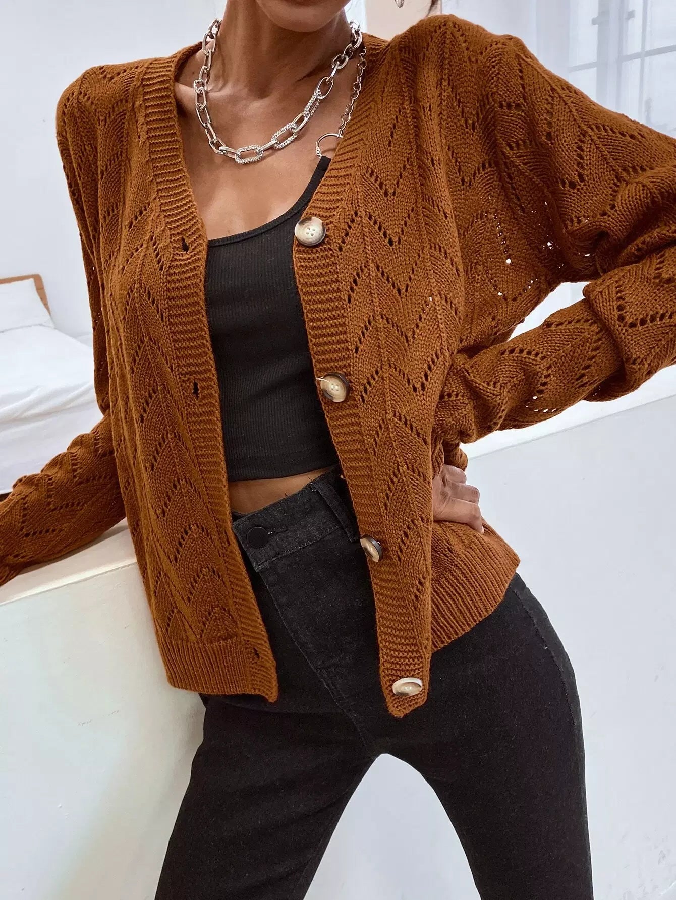 Drop Shoulder Pointelle Knit Cardigan