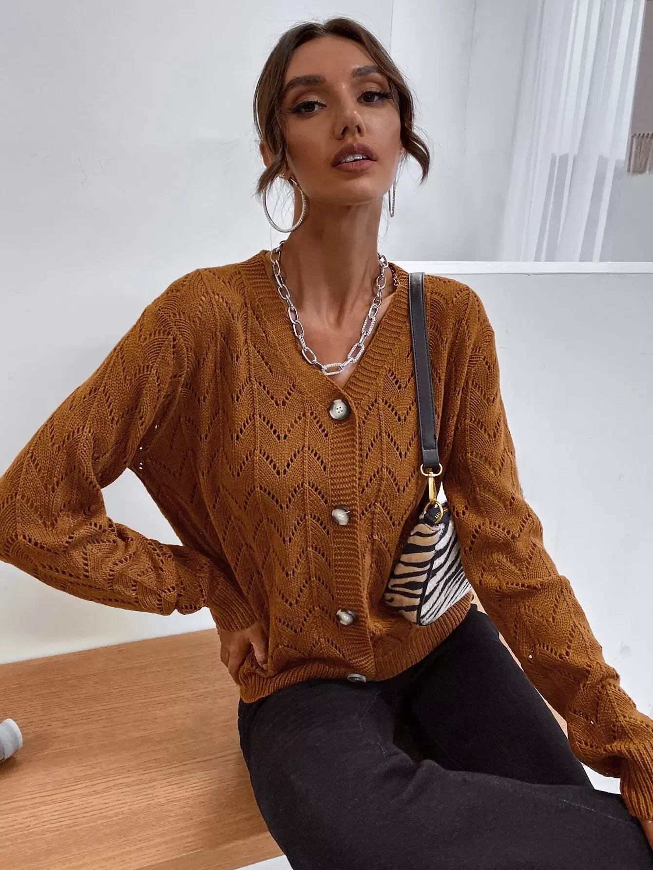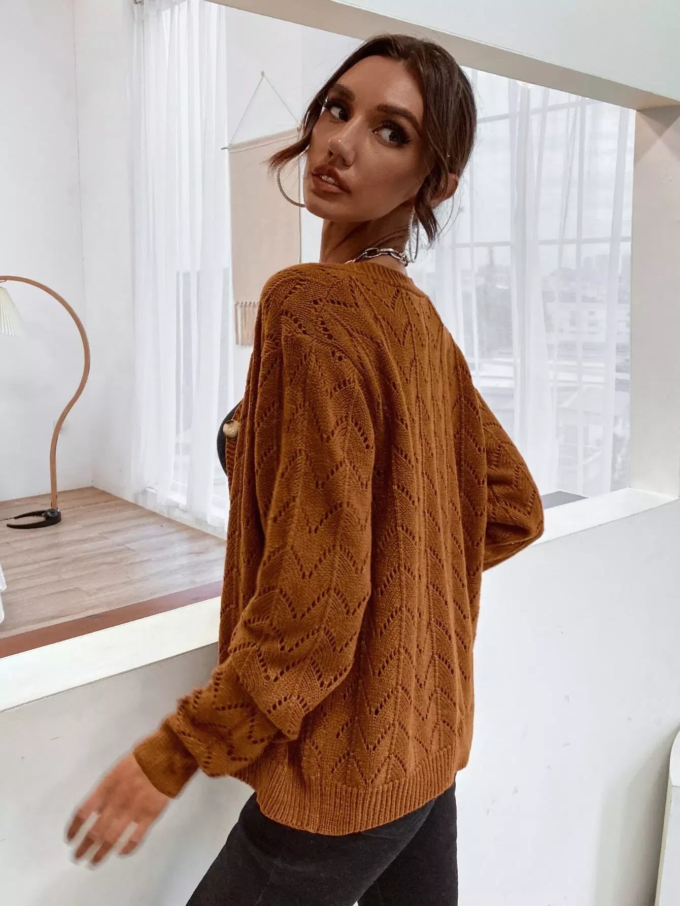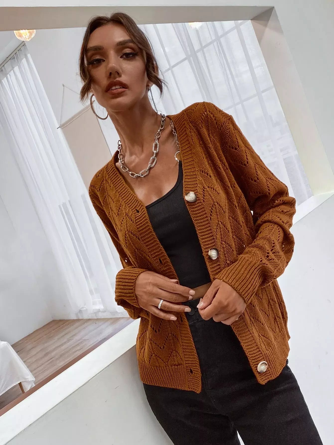 Drop Shoulder Pointelle Knit Cardigan
