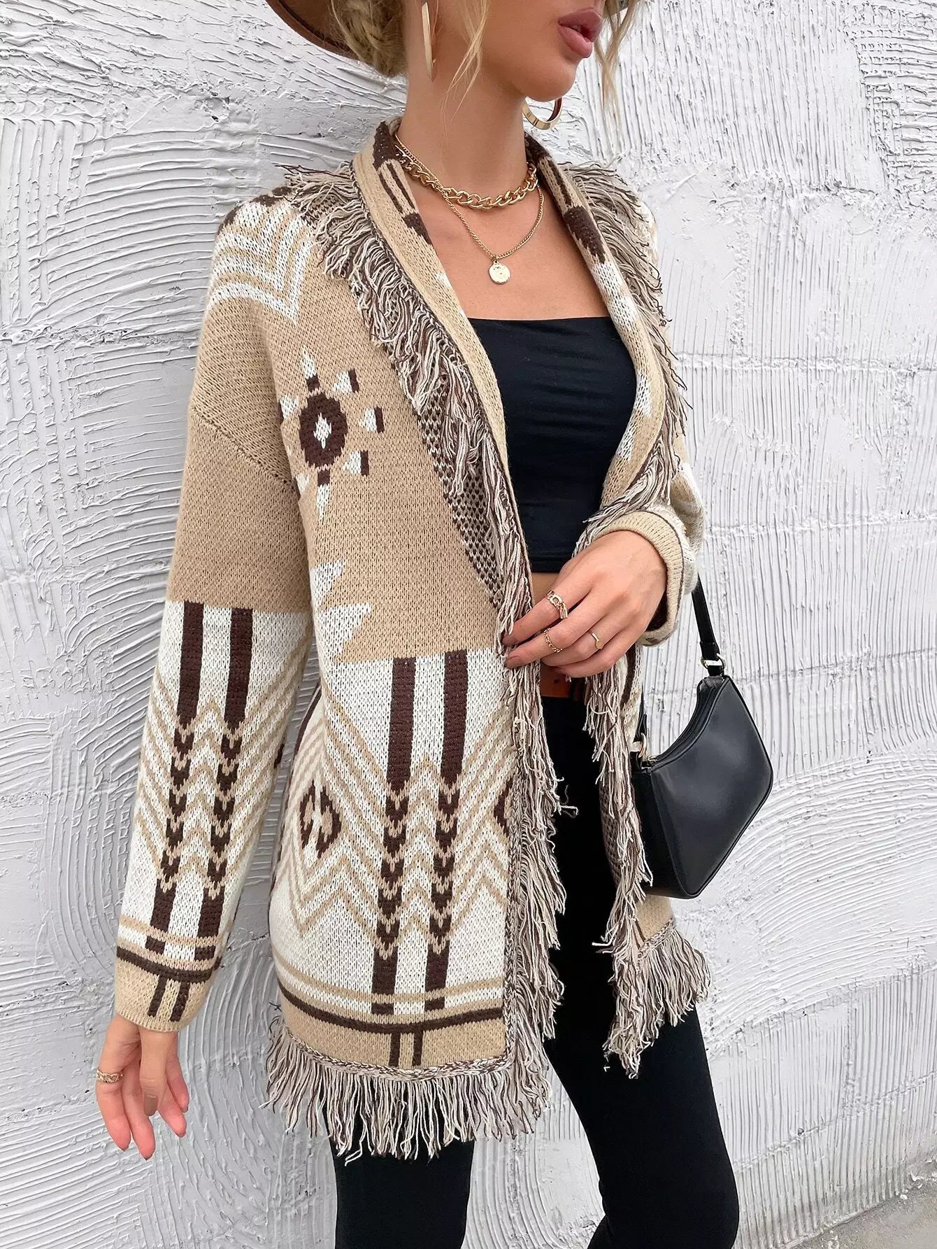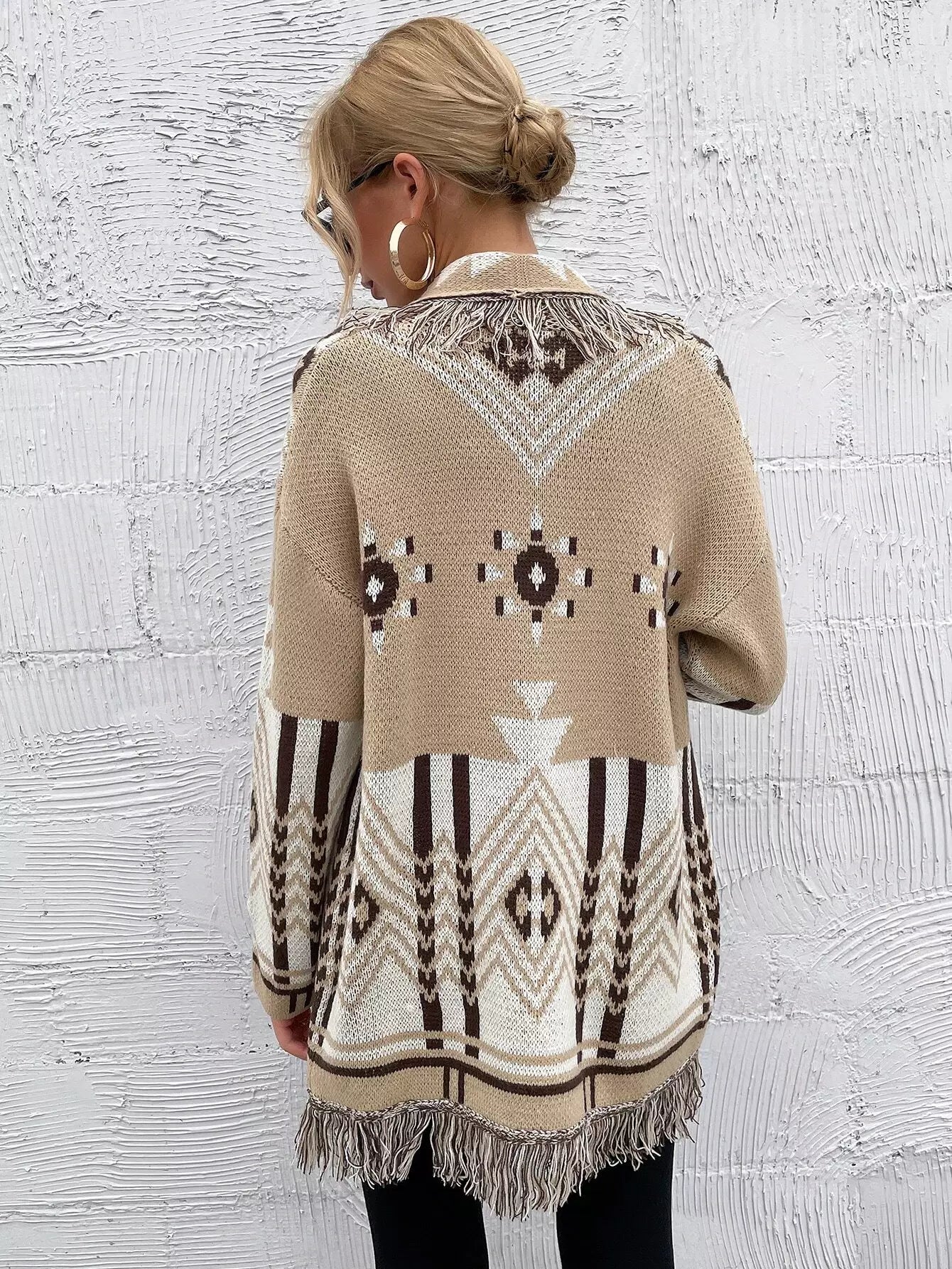Geo Pattern Drop Shoulder Fringe Trim Cardigan
