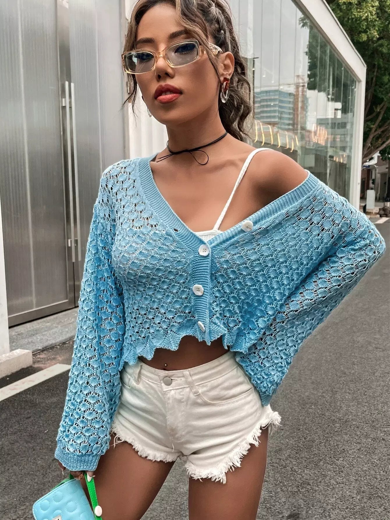 Pointelle Knit Button Up Drop Shoulder Cardigan