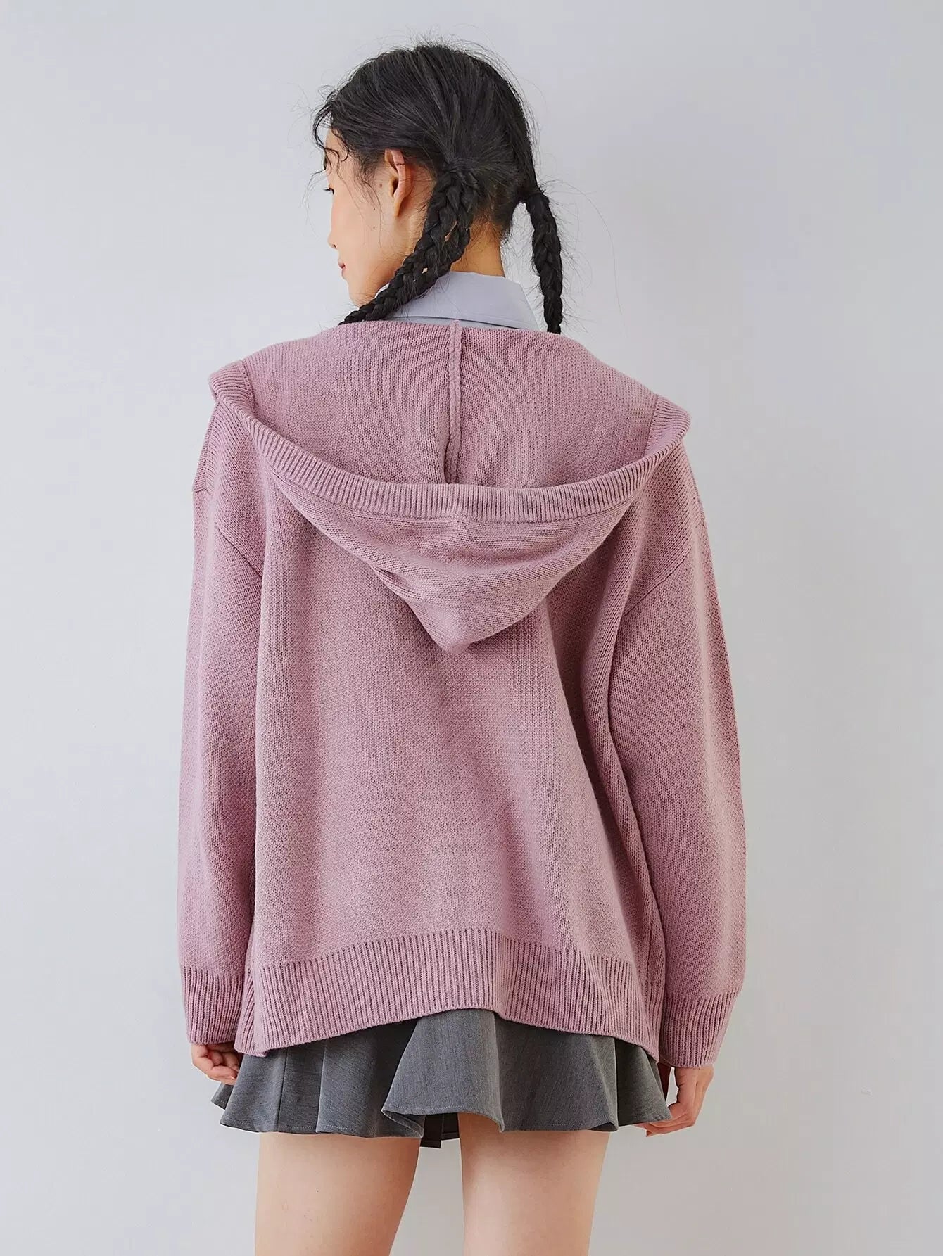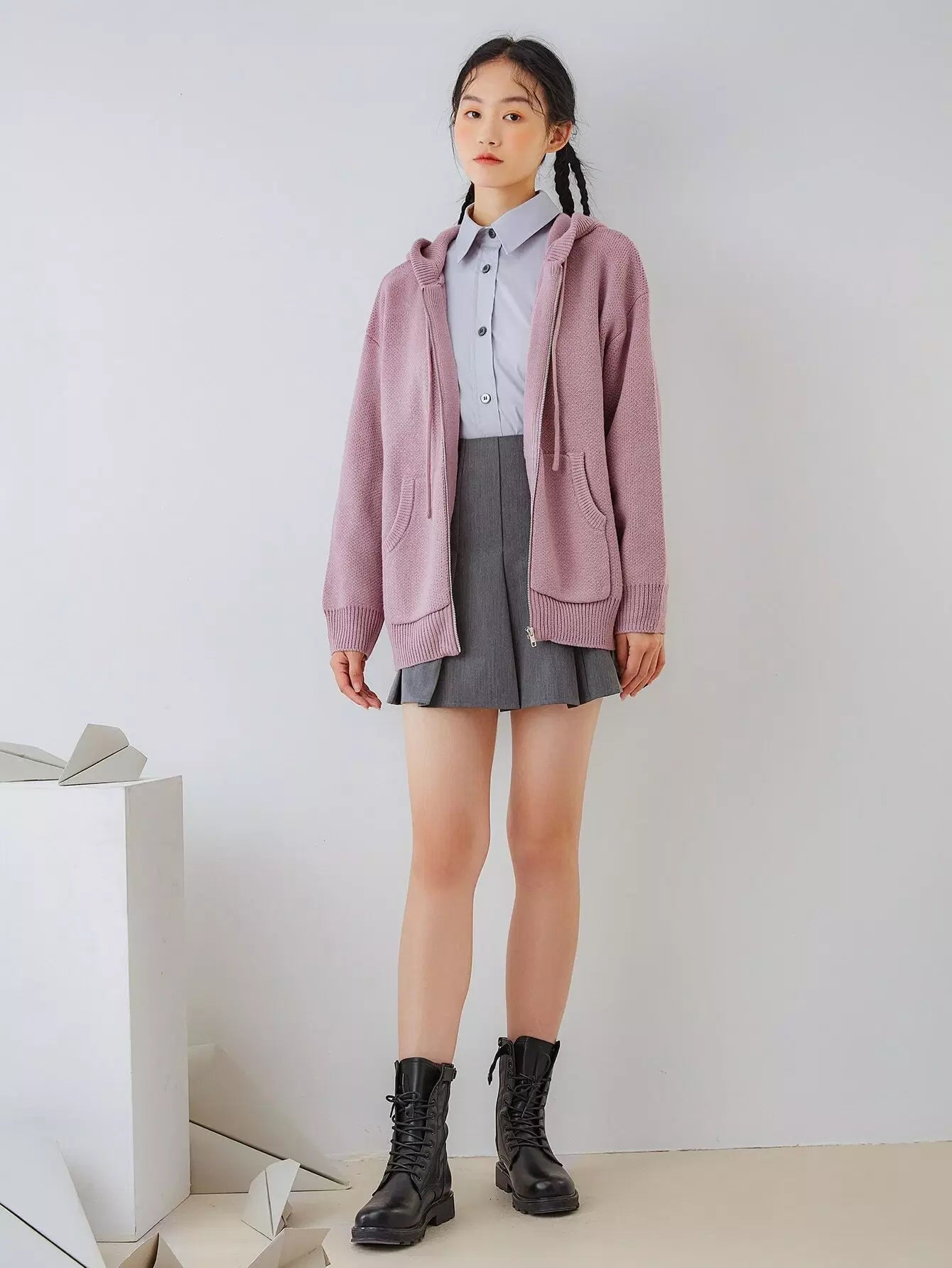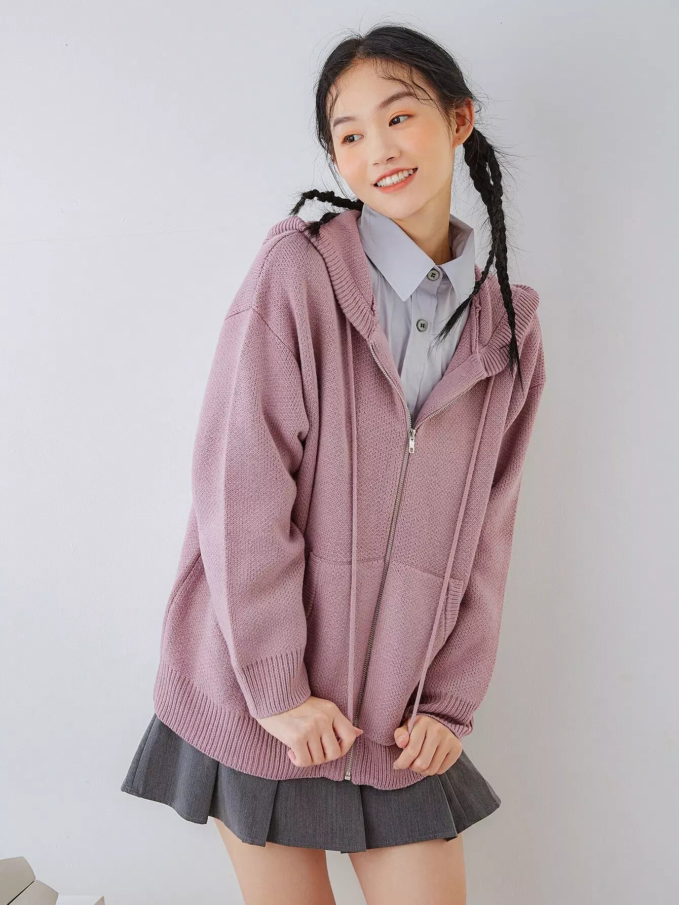 Solid Zip Up Kangaroo Pocket Hooded Cardigan