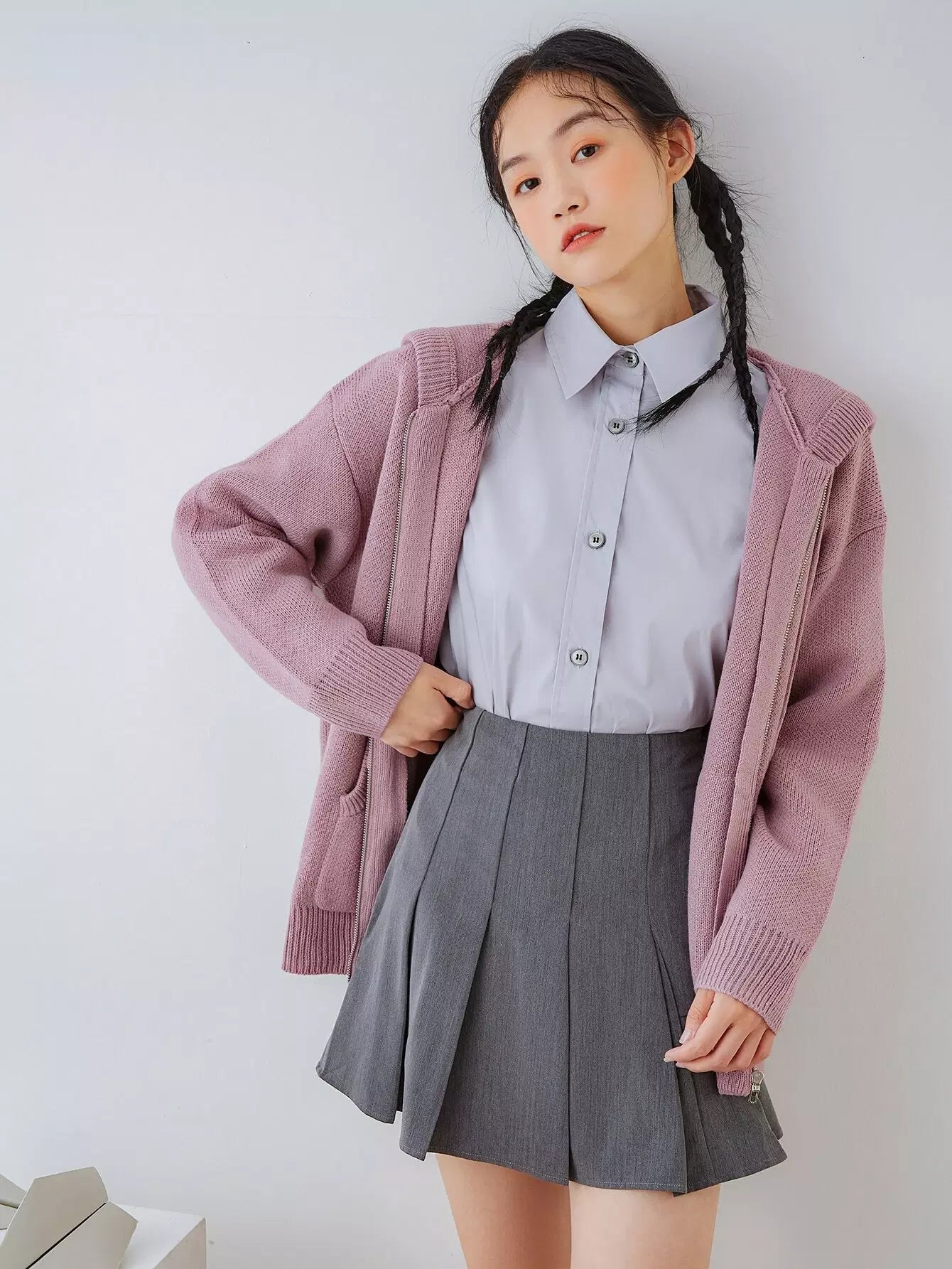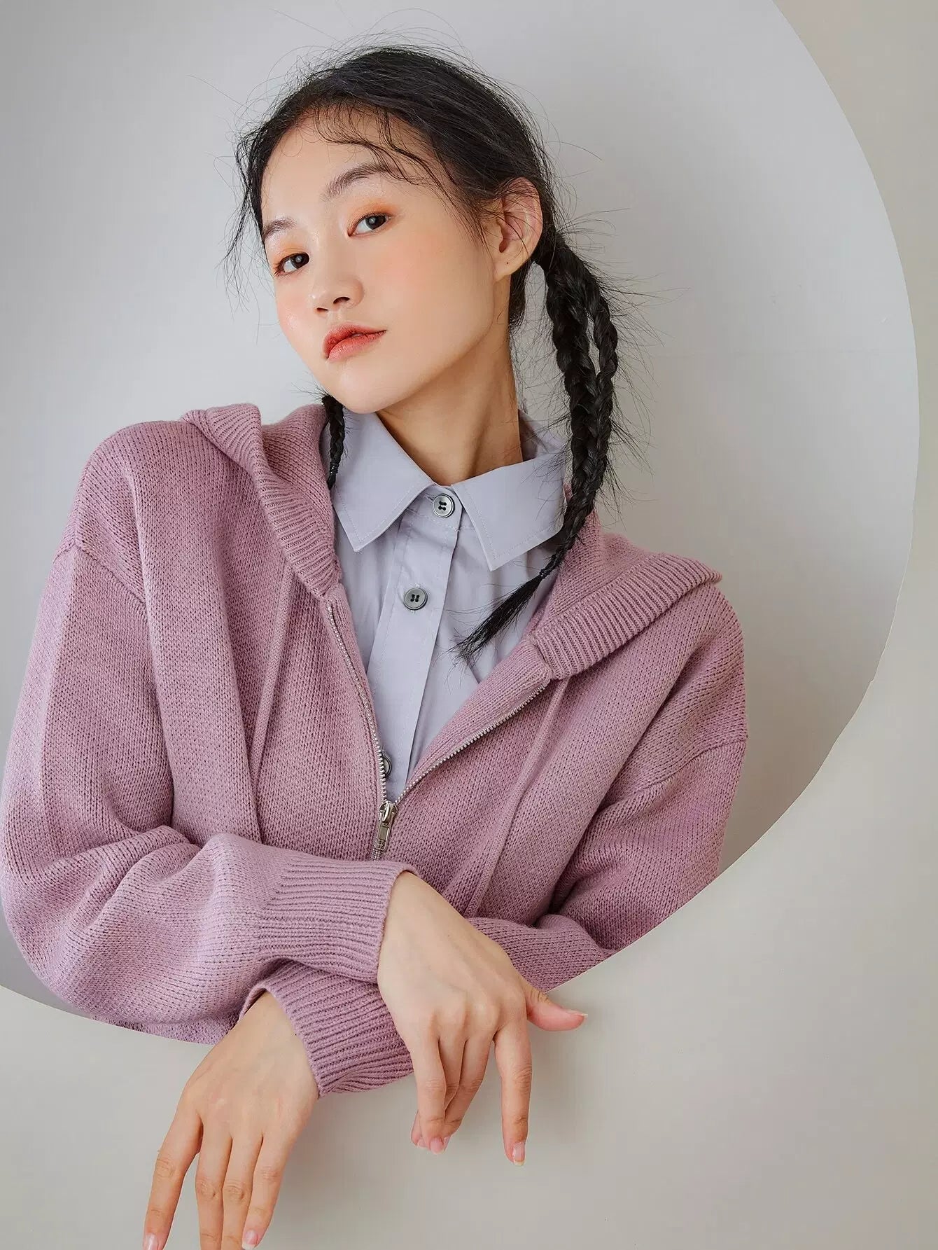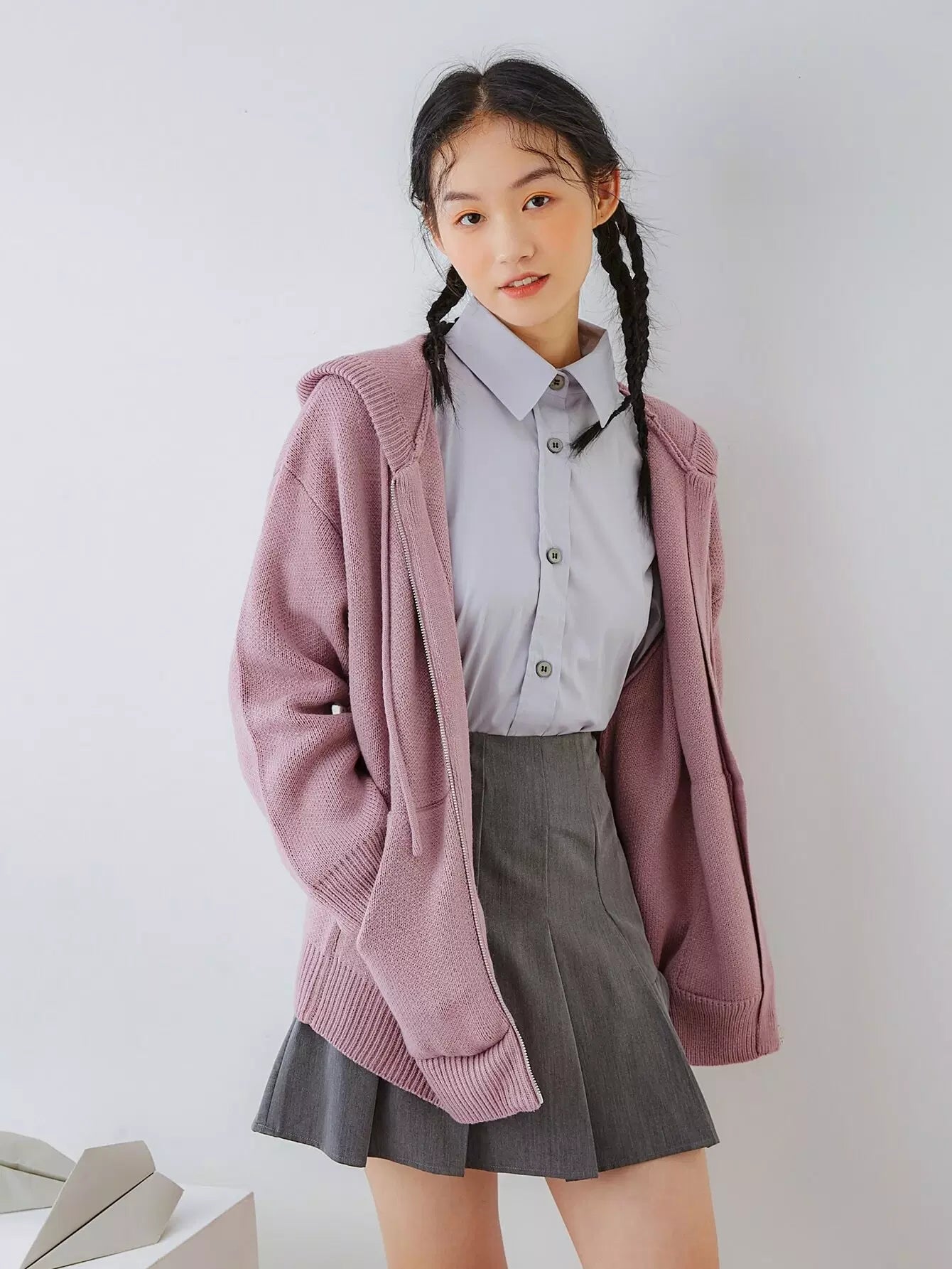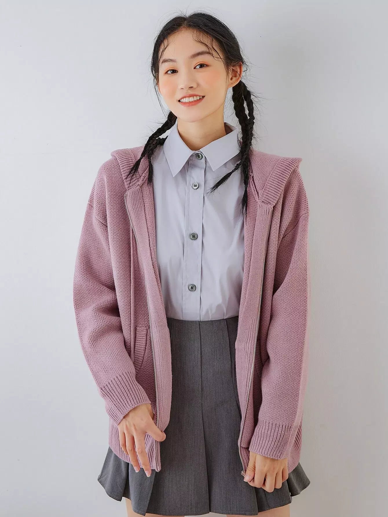 Solid Zip Up Kangaroo Pocket Hooded Cardigan