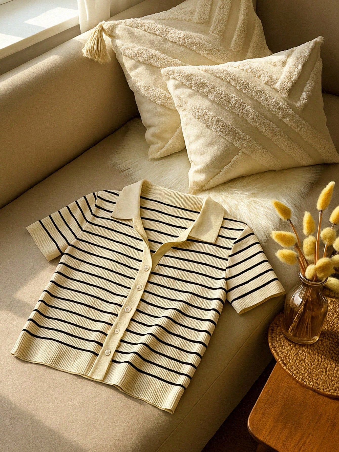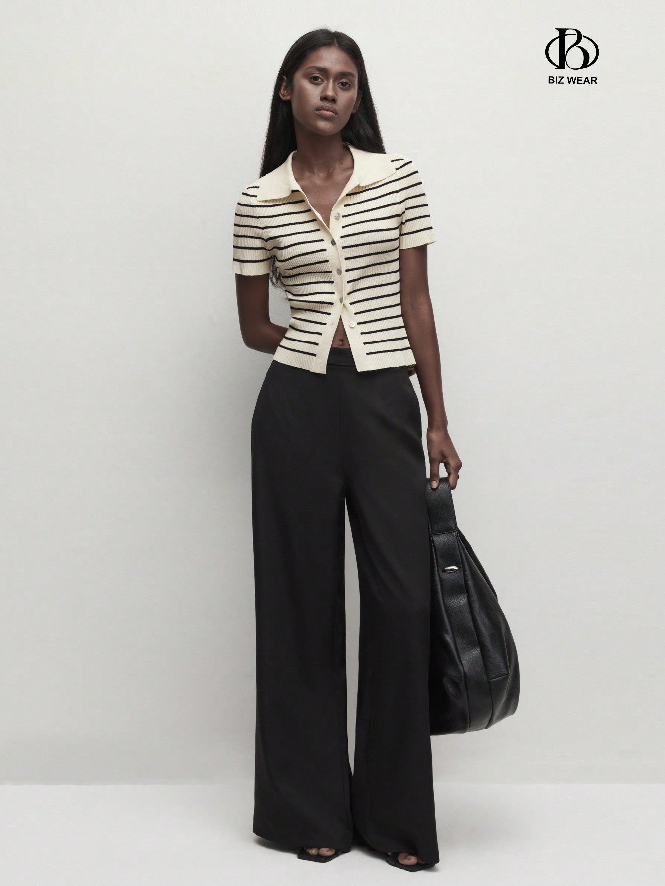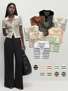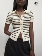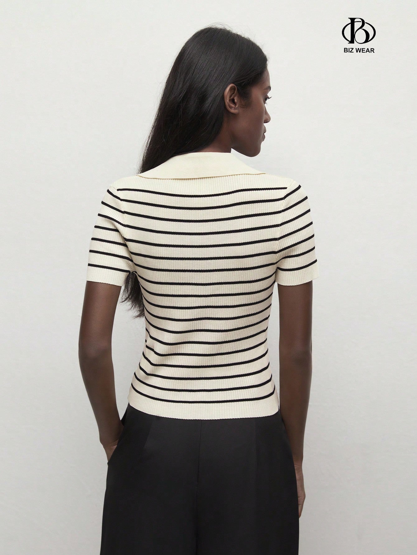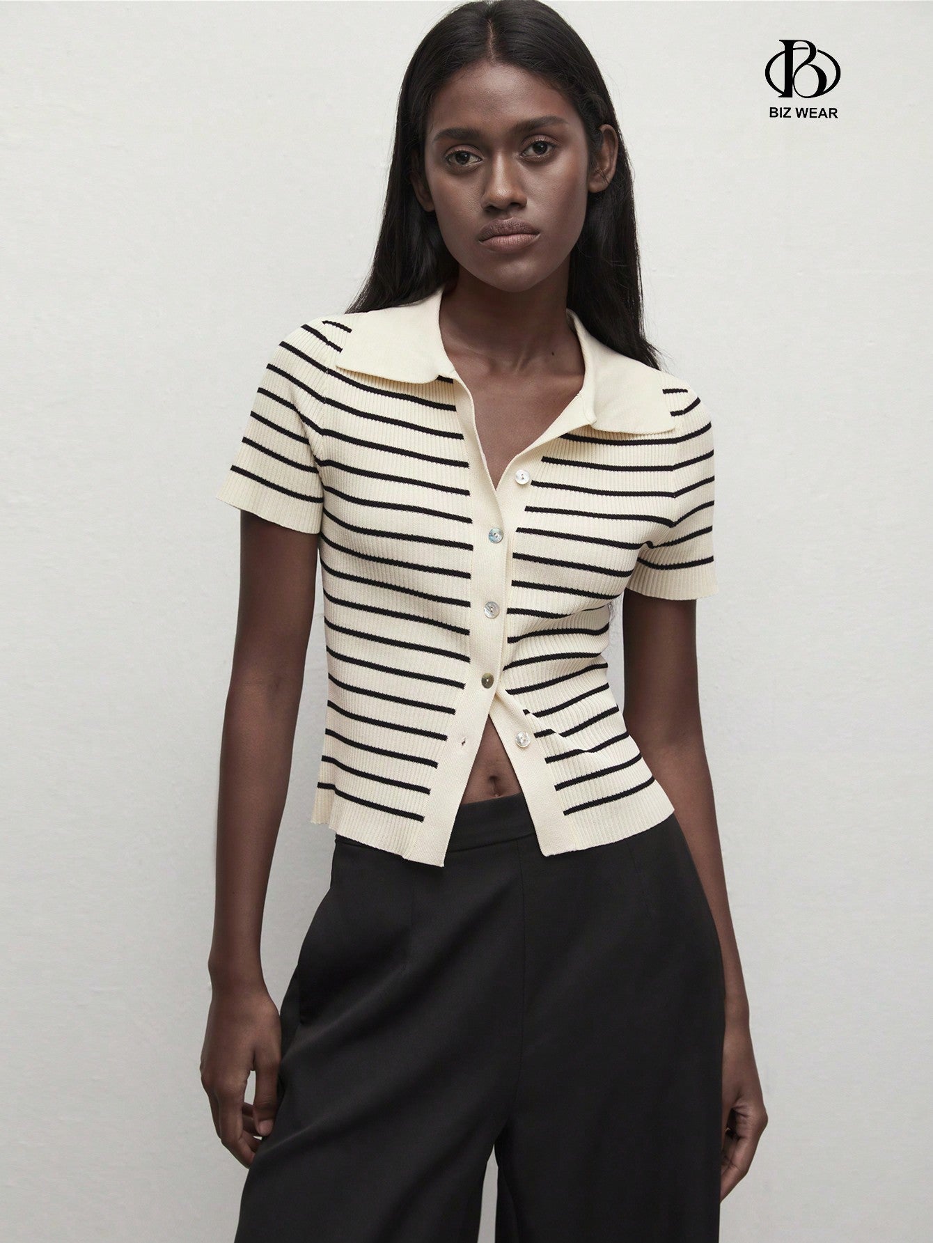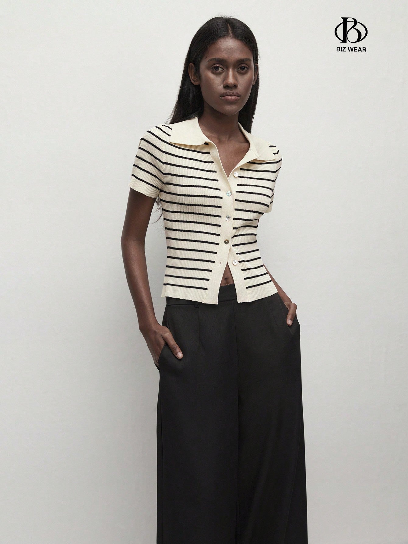 BizChic Women's Autumn Turndown Collar Striped Button Knit Sweater