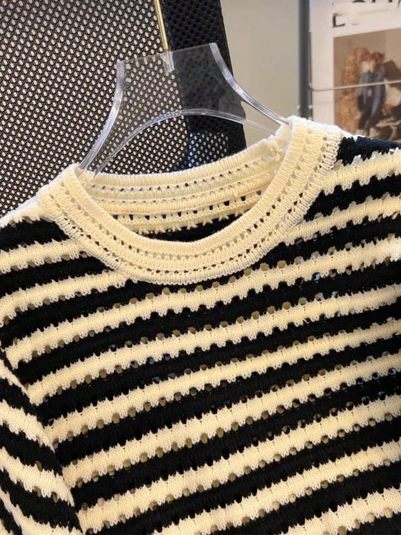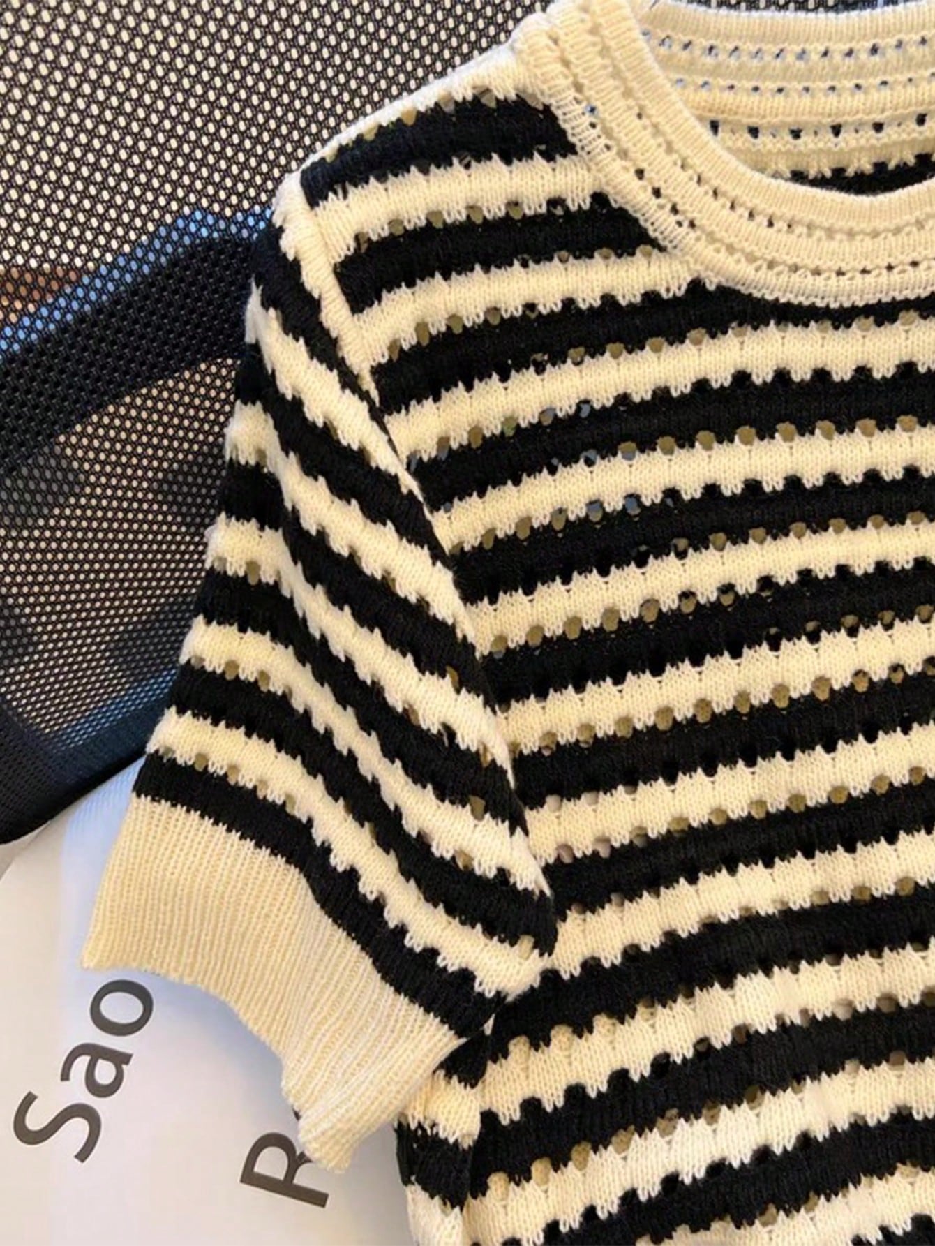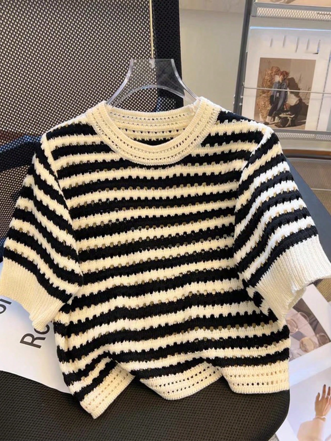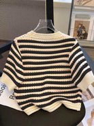 Franclia New Hollow Striped Short Sleeve Crew Neck Cropped Women Knit Top (Random Hollow Design)
