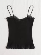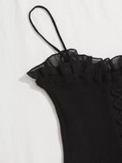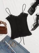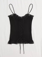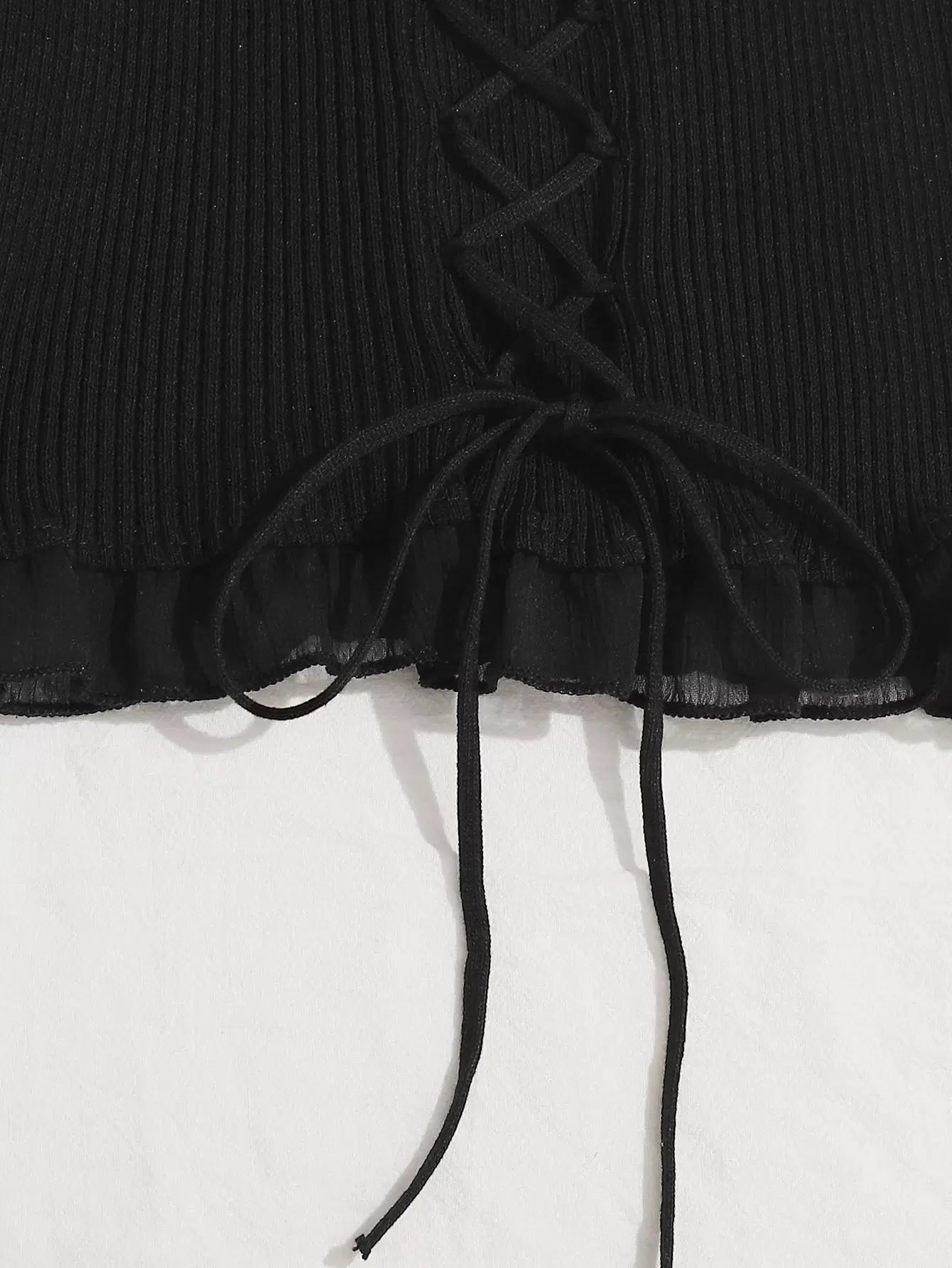 Lace Up Knot Mesh Frill Trim Rib-knit Top